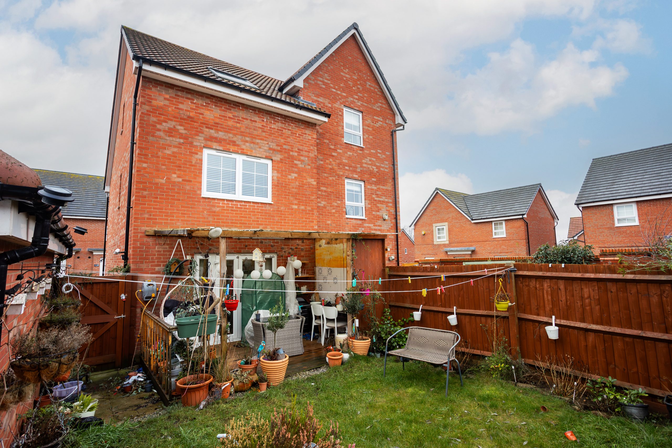 The property benefits from a low-maintenance rear garden, featuring a deck area covered by pergola area directly accessed through the French doors from the kitchen-diner — perfect for outdoor dining or relaxing. Beyond the patio, the garden is laid mainly to lawn, offering a practical and versatile outdoor space. A side access gate provides convenient entry to and from the property and leads to a garage.