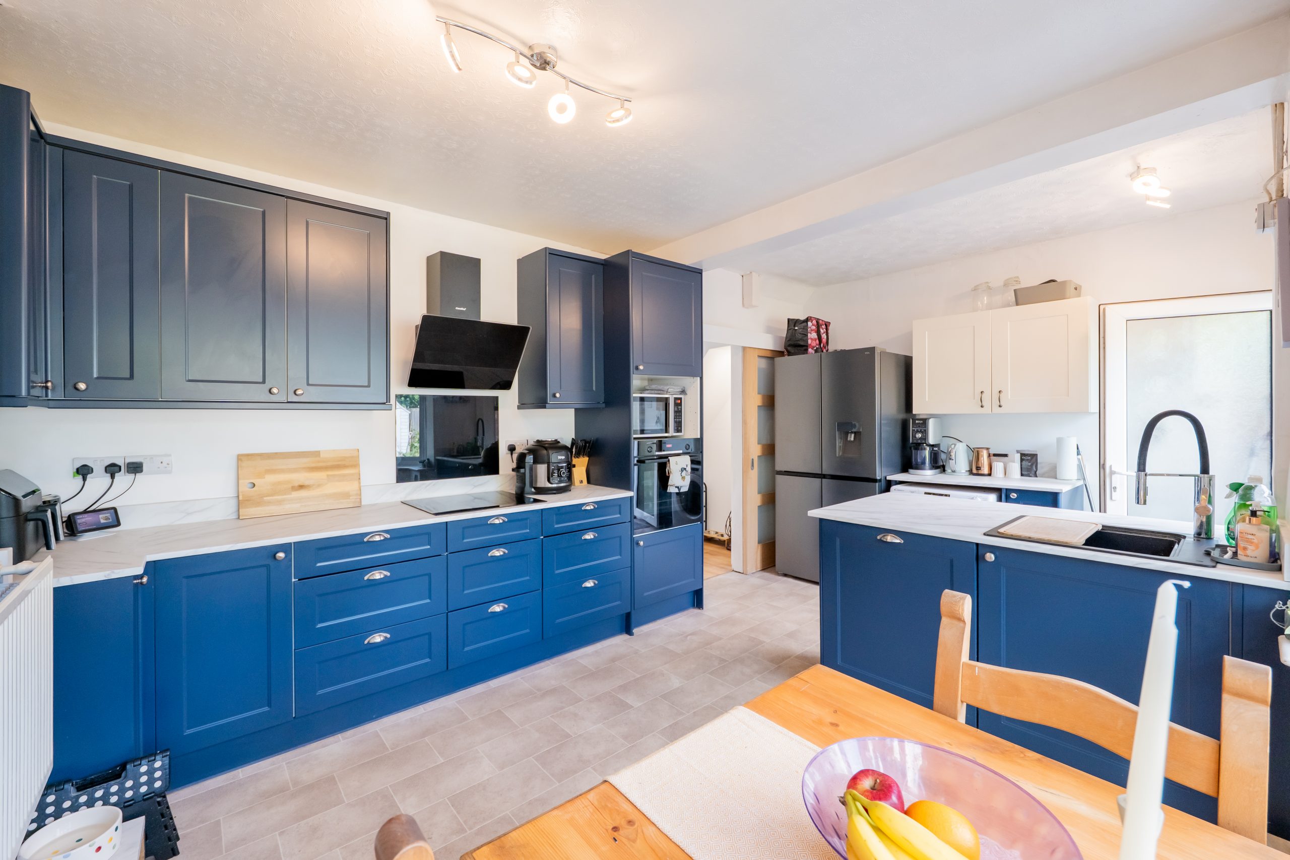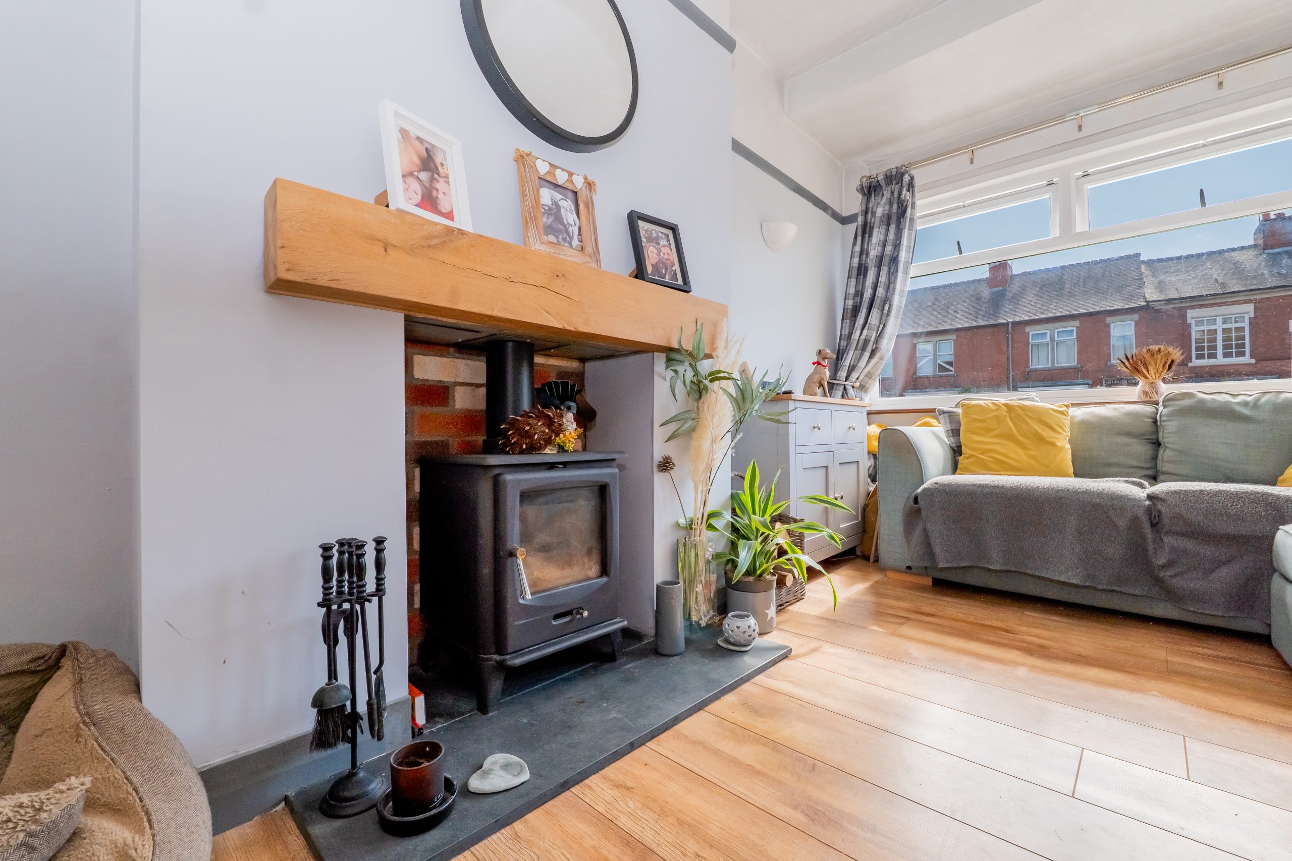 Stepping into the entrance porch, you'll find a glass inset front door, leading into the reception hall, which features a staircase to the first floor, open storage area under the stairs, and doors to both the main living room and open-plan dining kitchen. The spacious dining kitchen is situated to the rear of the property and is fitted with a range of modern navy wall and base units with complimentary marble effect work surface, boasts a one-and-a-half bowl sink with a swan-neck mixer tap, roll-edge work surfaces, a tiled surround, and electric cooker point, plumbing for a washing machine, space for a tumble dryer, and uPVC double glazed doors and large window overlooking the garden. The living room at the front of the property is bright and inviting, with another large UPVC double glazed bay window to the front elevation, a feature fireplace with log burner and solid oak mantel, Picture rails and a radiator adding warmth to the space.
