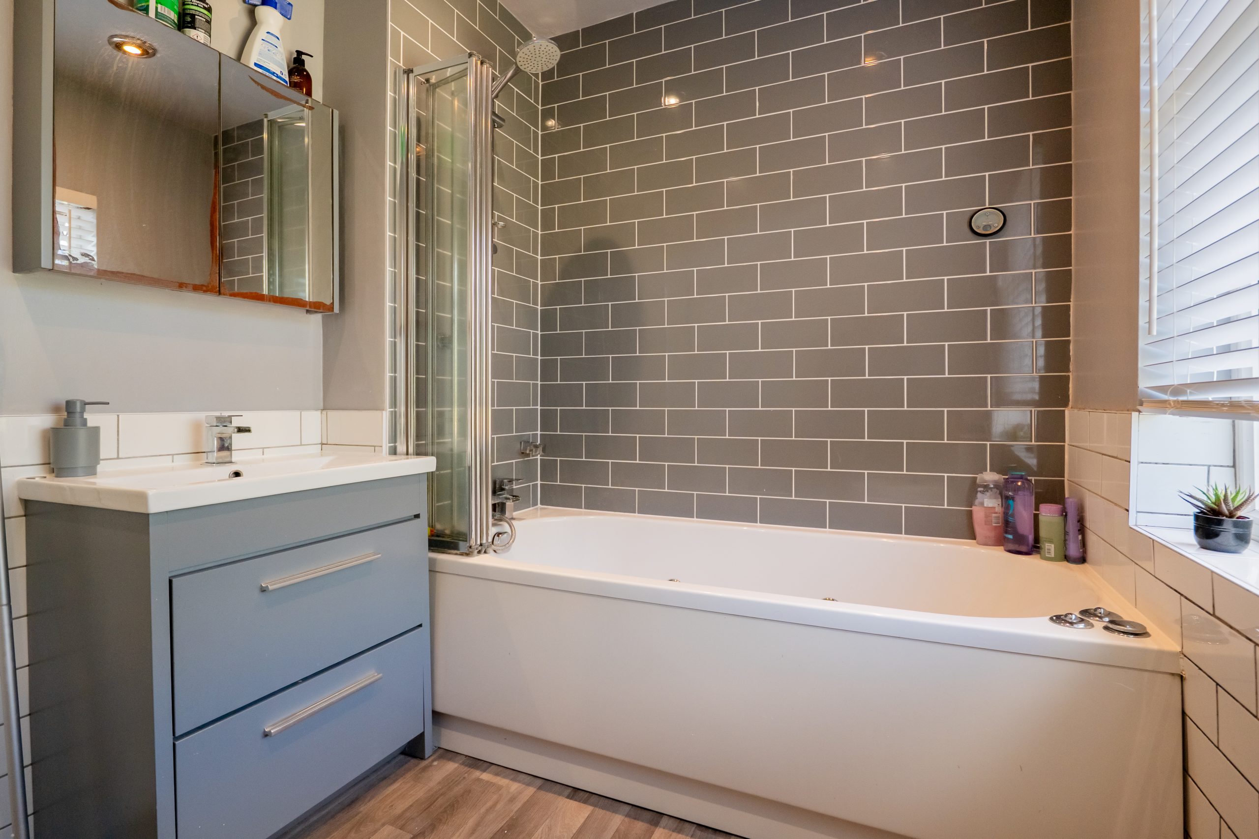 The first-floor landing leads to three well-proportioned bedrooms and a stylishly re-fitted bathroom, complemented by a loft access hatch and a uPVC double glazed opaque glass window to the side elevation. The main bedroom enjoys a uPVC double glazed window overlooking the front of the property and a radiator, while the second bedroom, also a double, benefits from garden views and fitted wardrobes. The third bedroom, compact yet versatile, features a uPVC double glazed window overlooking the front elevation and a radiator. The modern bathroom is fitted with a sleek white three-piece suite, including a panelled bath with a chrome mixer tap, a vanity unit with an inset wash hand basin, and a low-flush WC with a concealed cistern, all finished with a radiator and a uPVC double glazed window.