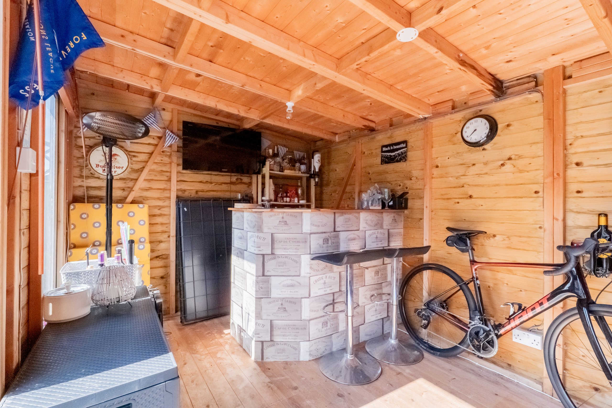 Outside, the property impresses with a generous driveway offering off-road parking for multiple vehicles. A gated, shared side access leads to the rear garden, a private, fully enclosed haven perfect for relaxing or entertaining. The garden is modernly landscaped, featuring a well-kept lawn framed by mature shrubs, raised borders, and vibrant planting. A spacious decked area creates an ideal setting for summer gatherings, extending to a large cabin complete with a built-in bar, your very own garden retreat. Two outhouses offer practical outdoor storage, keeping everything neat and organised.