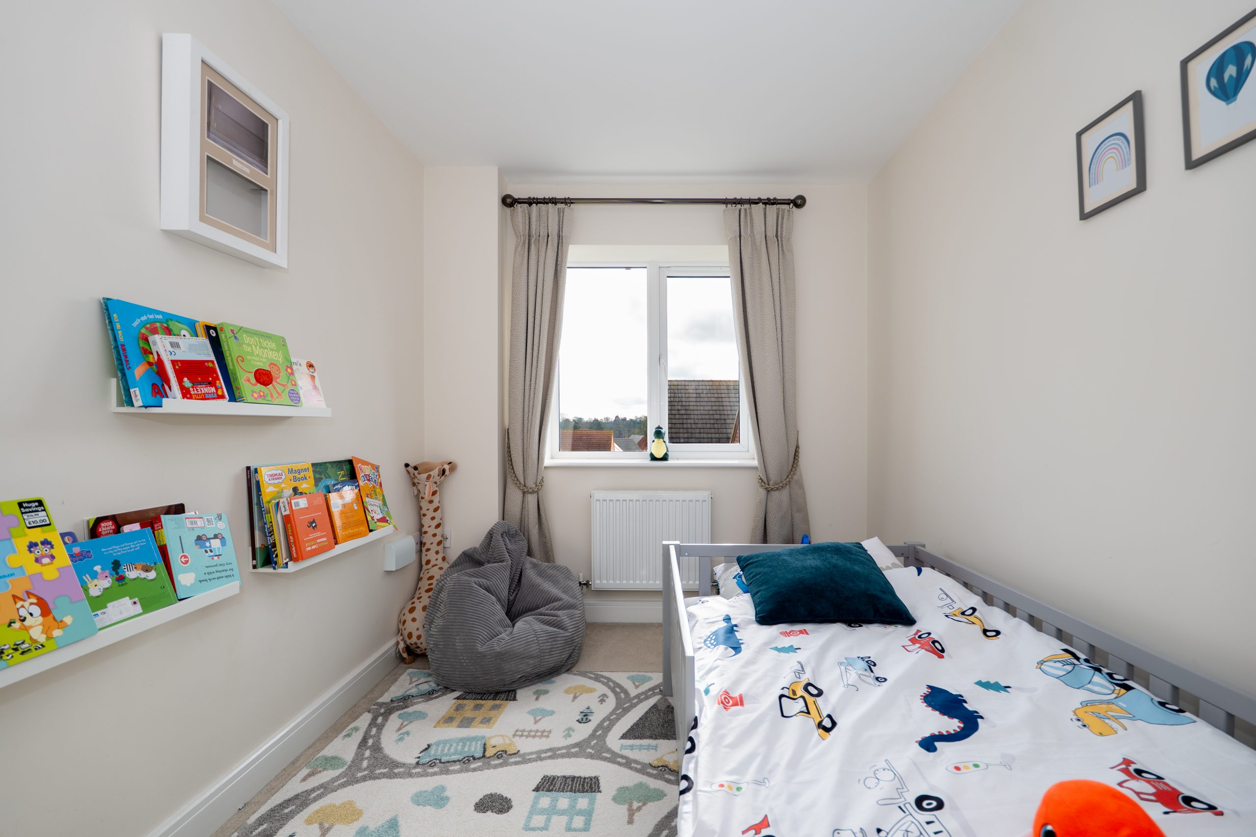 The property features a spacious hallway with neutral carpeting, leading to a modern, well-equipped dining kitchen. This contemporary area boasts cream cabinetry complemented by durable worktops, and includes integrated appliances such as a fridge freezer, dishwasher, and a double oven with a hob and extractor fan. Adjacent to the kitchen is a utility room offering additional storage, space for a washing machine and dryer, a sink with a drainer, and a service door to the rear garden. The generous living room is bright and airy, creating a welcoming atmosphere while maintaining a cosy feel. On the ground floor, there is also a versatile playroom or study accessible from the hallway, along with a convenient ground floor WC, enhancing functionality and comfort.