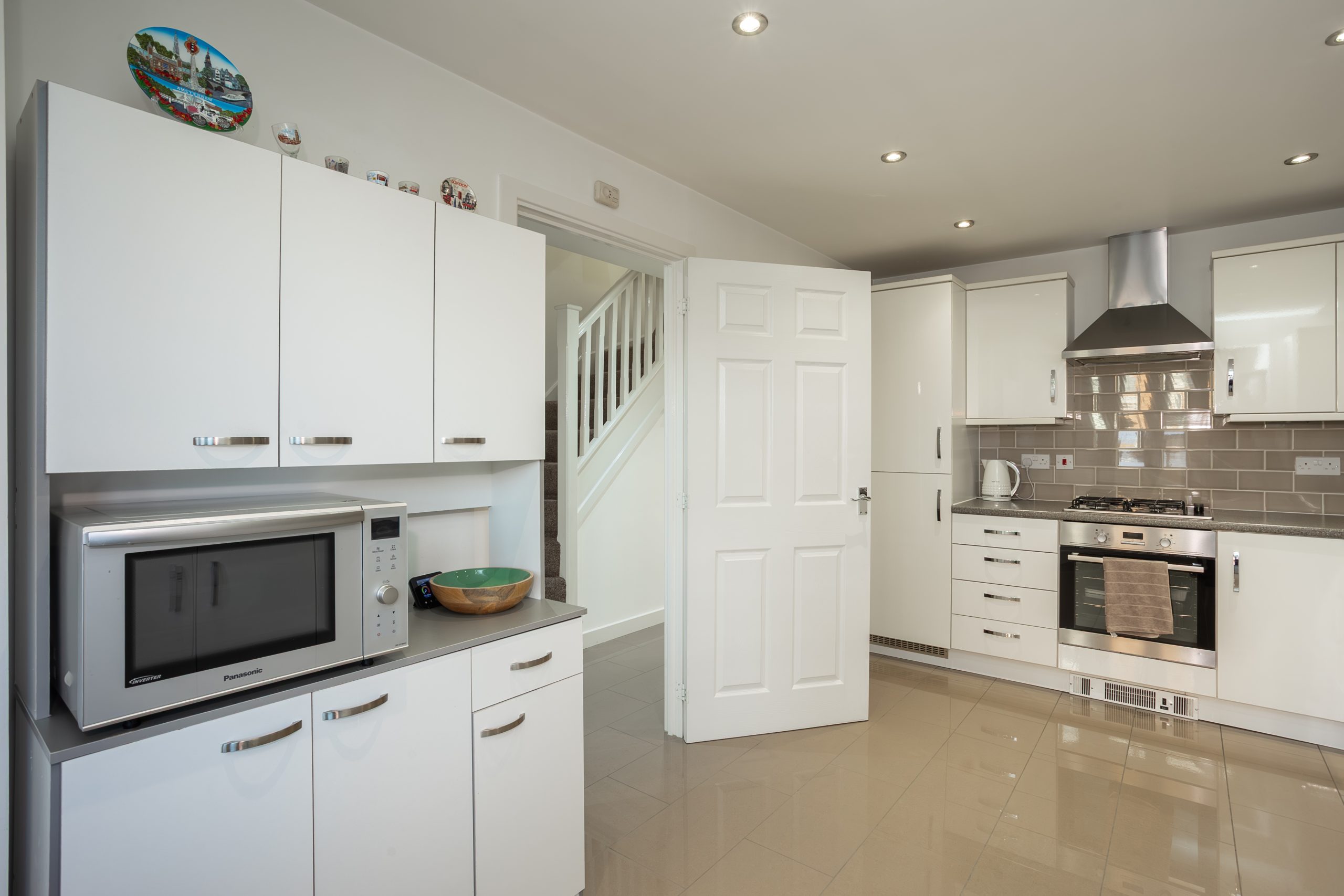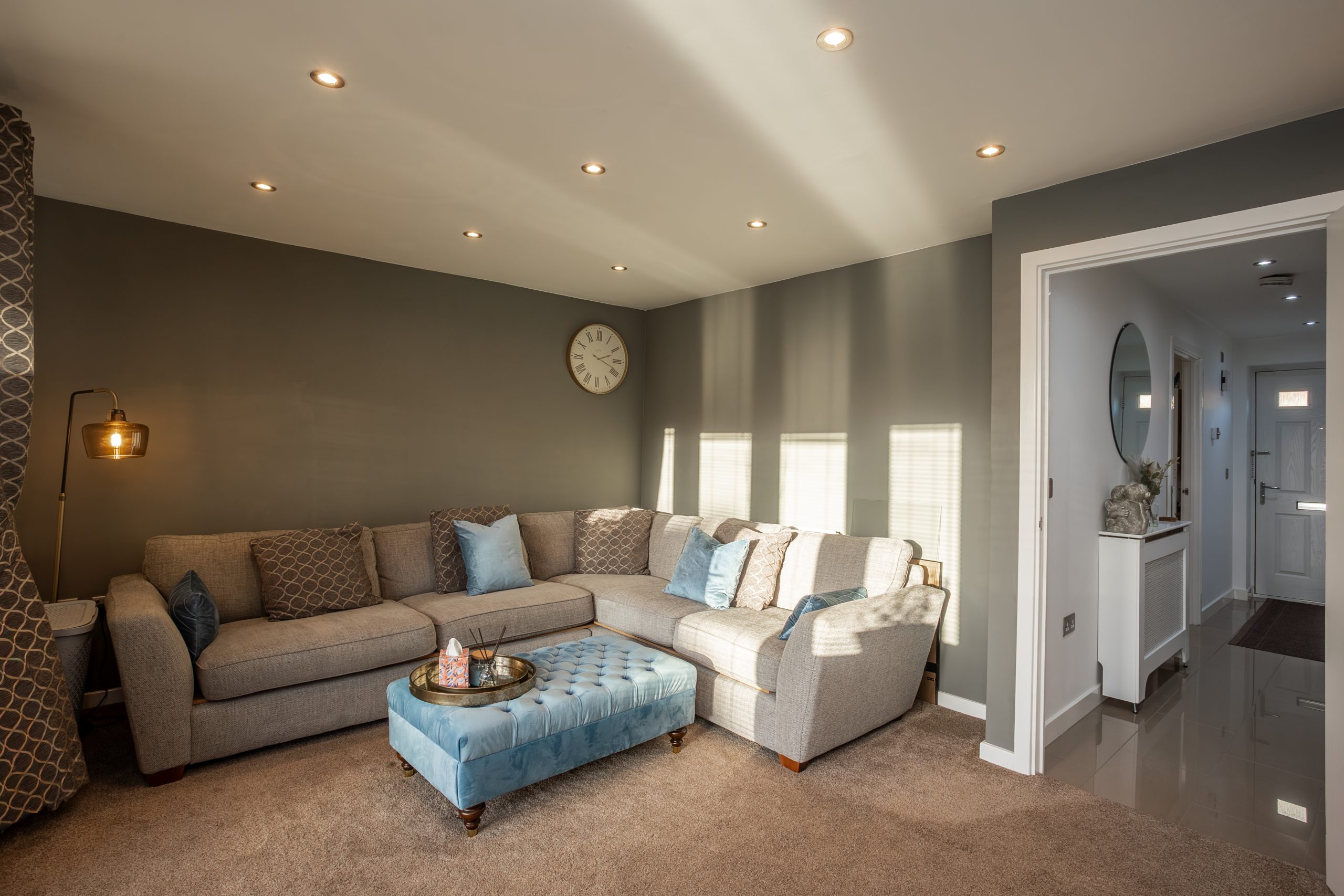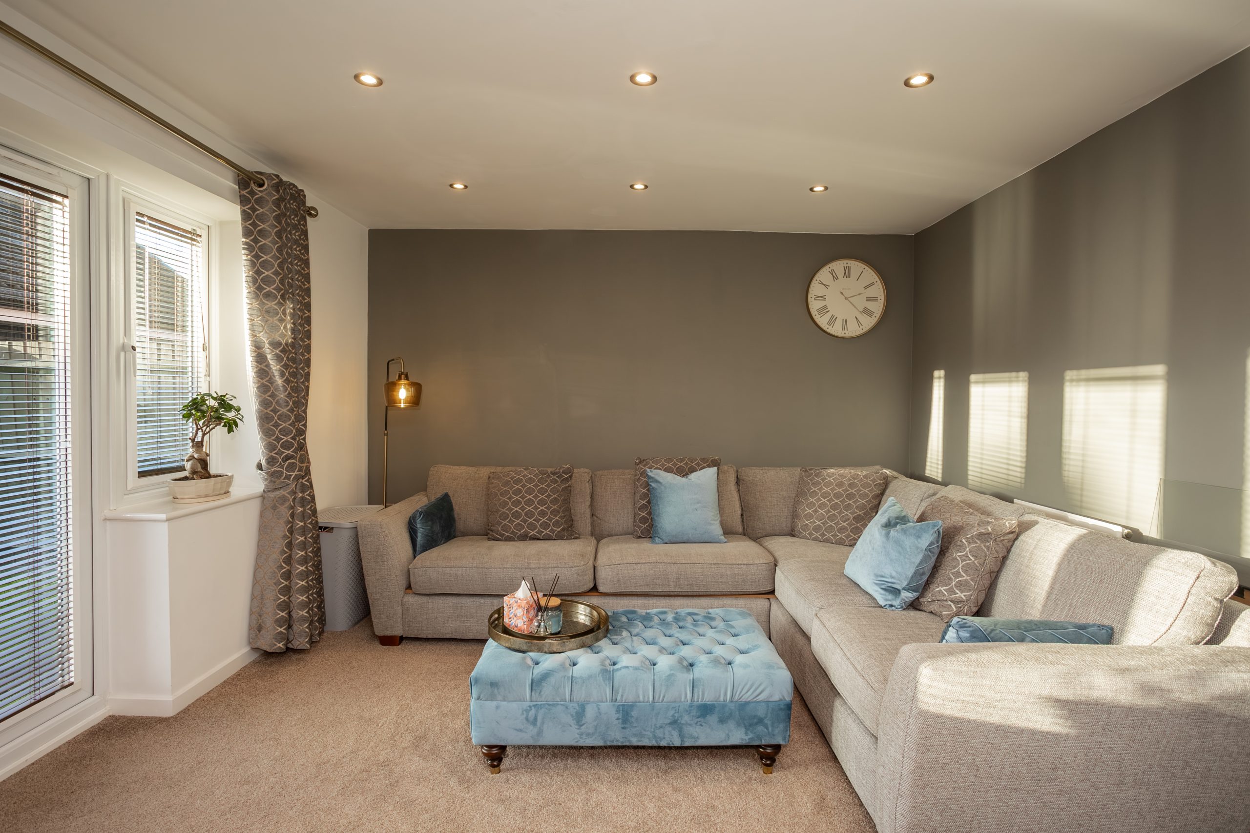 The ground floor opens with a welcoming entrance hall, finished with tiled flooring and a bright, airy décor, accessed via a modern composite canopied front door. From here, doors lead to the downstairs WC, kitchen, and lounge, with stairs rising to the first floor and a useful storage cupboard beneath. The downstairs WC is fitted with a contemporary low-level toilet and pedestal wash hand basin. The kitchen is stylishly appointed with crisp white base and eye-level units, complementing work surfaces, and a range of integrated appliances including oven and extractor fan. A bay window to the front aspect enhances the space with natural light, while tiled flooring and spotlighting complete the modern finish. To the rear, the lounge offers a warm and inviting setting with neutral décor, carpeted flooring, and spotlighting, alongside double-glazed windows and doors that open directly onto the garden, an ideal space for relaxation or entertaining.