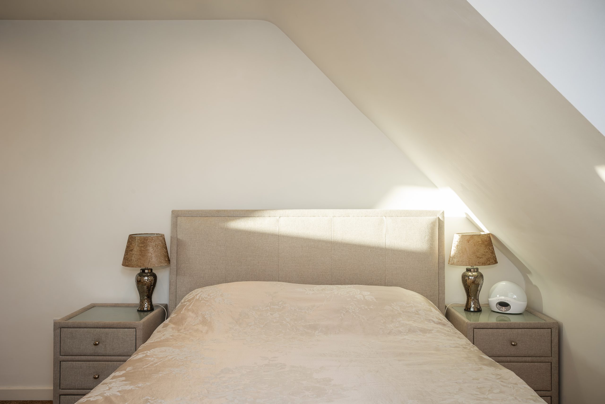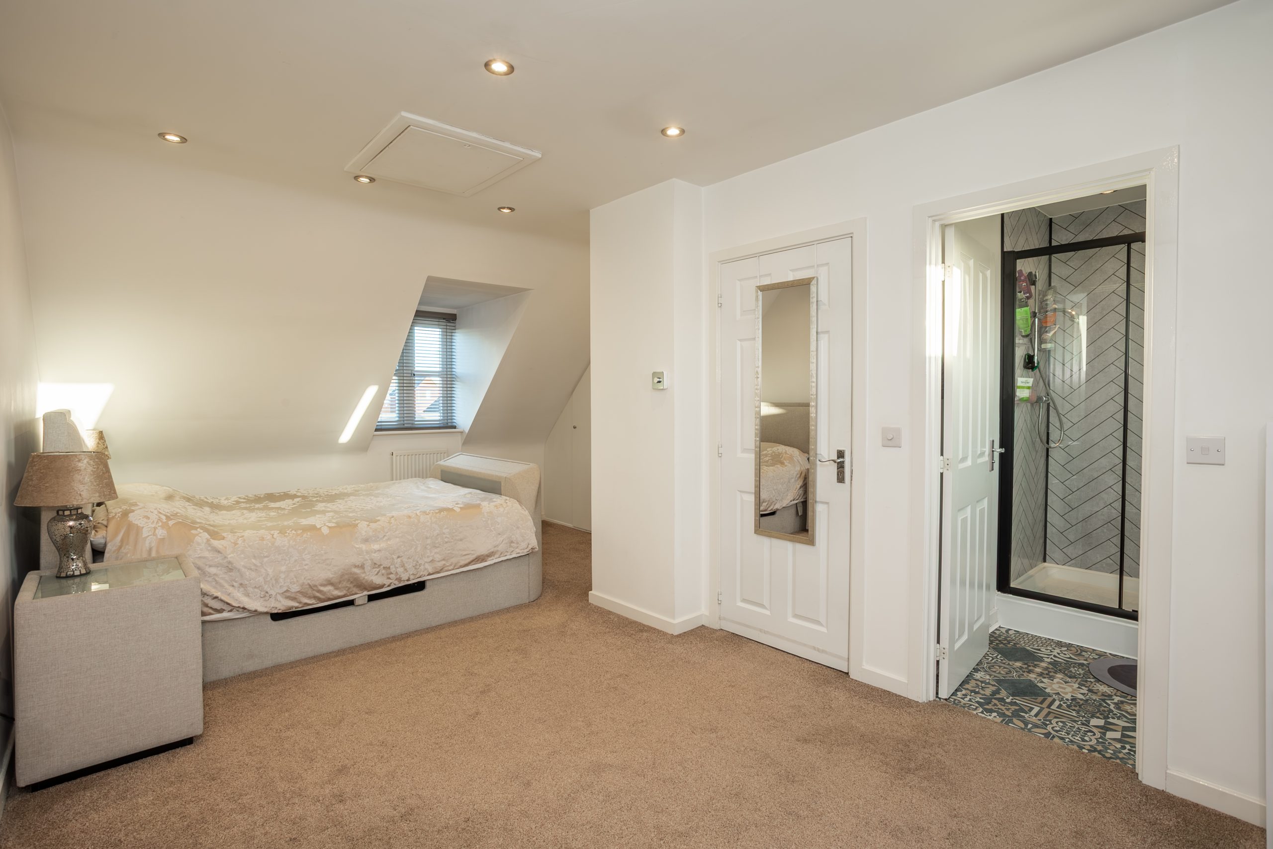 The second floor is reached via a carpeted landing with spotlighting, leading to a generous loft-style master bedroom. This impressive space enjoys carpeted flooring, a radiator, Velux window to the rear, and a double-glazed window to the front, ensuring an abundance of natural light. Practical features include built-in storage, thermostat control, eaves access, and a hatch to additional loft storage. A door opens to the recently refurbished en-suite, finished with patterned vinyl flooring, part-tiled walls, a standing radiator, wash hand basin, toilet, and a modern, black-framed shower cubicle with mixer function, complemented by a striking herringbone-patterned wall tile. Spotlighting and a Velux window complete the room, creating a stylish contrast and tying the space together with personality and charm.