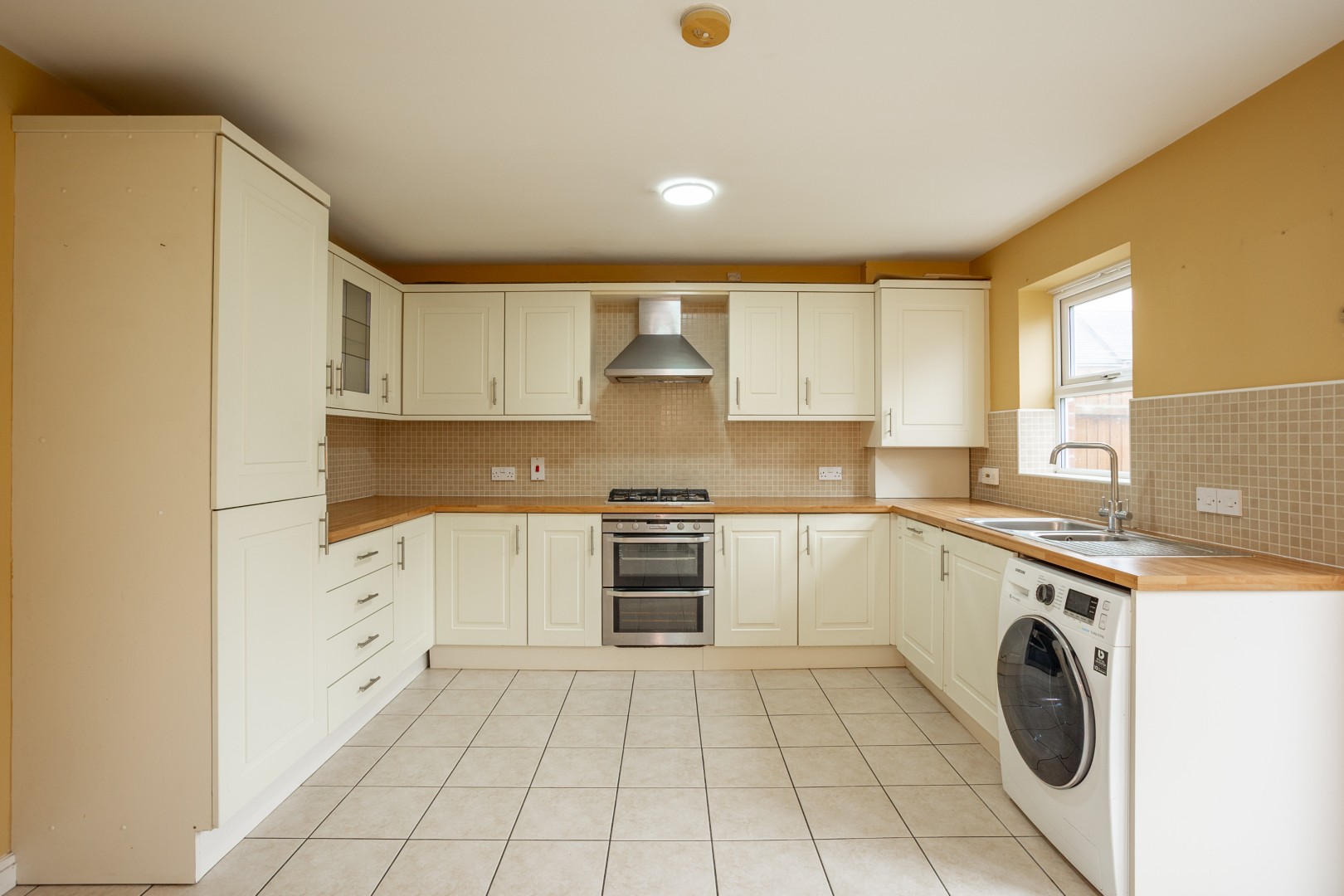 Upon entering the home, you are welcomed into the entrance hall, which offers access to the dining kitchen. Located to the rear of the home, the modern kitchen has been tastefully fitted with shaker-style cabinets, complimentary worktops and tiled splashback. It is equipped with integrated electric double oven, gas hob with extractor fan and dishwasher. There is space for a fridge/freezer and washing machine. There are double doors that open onto the rear garden. Also, located on the ground floor is a w.c and study/bedroom four.