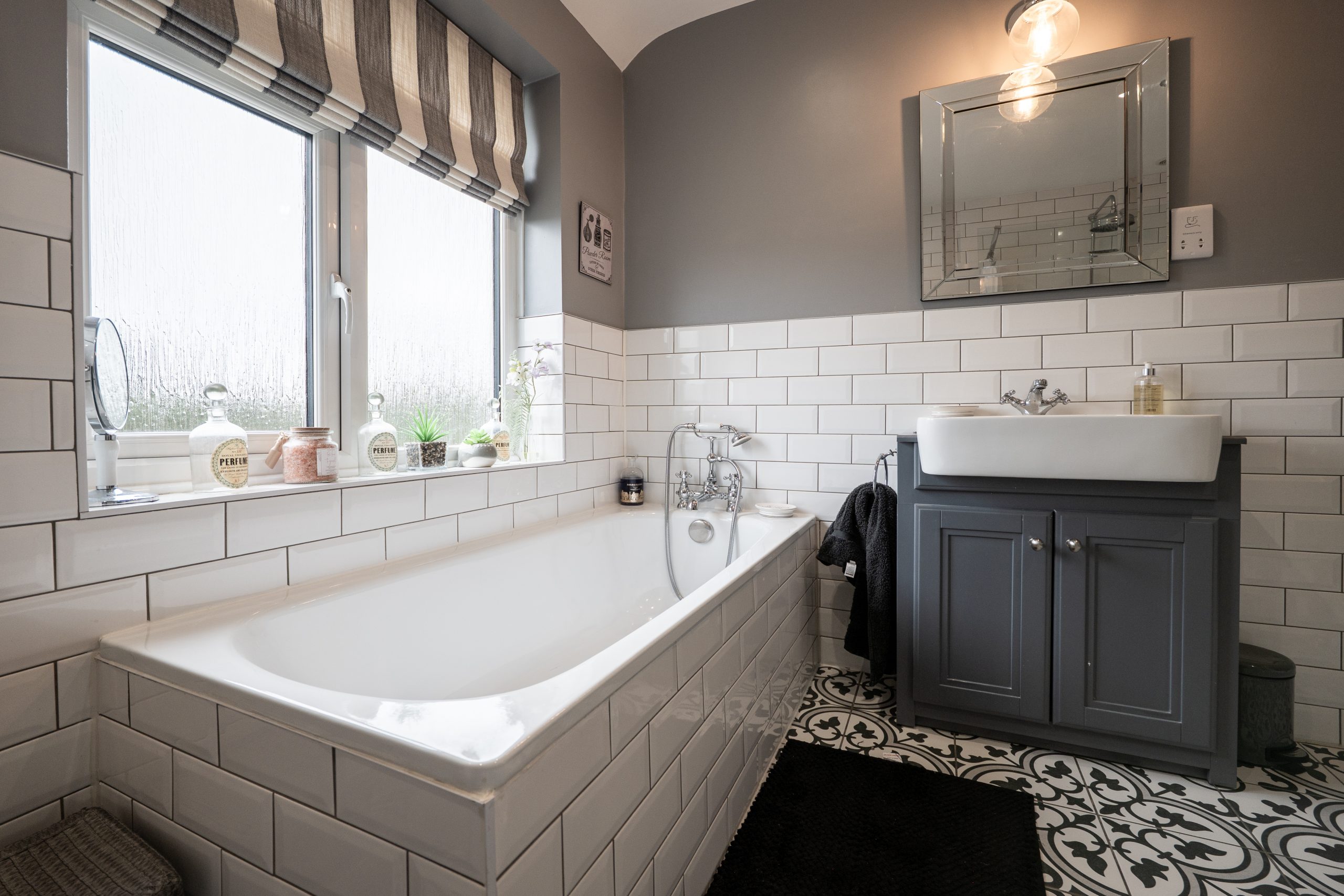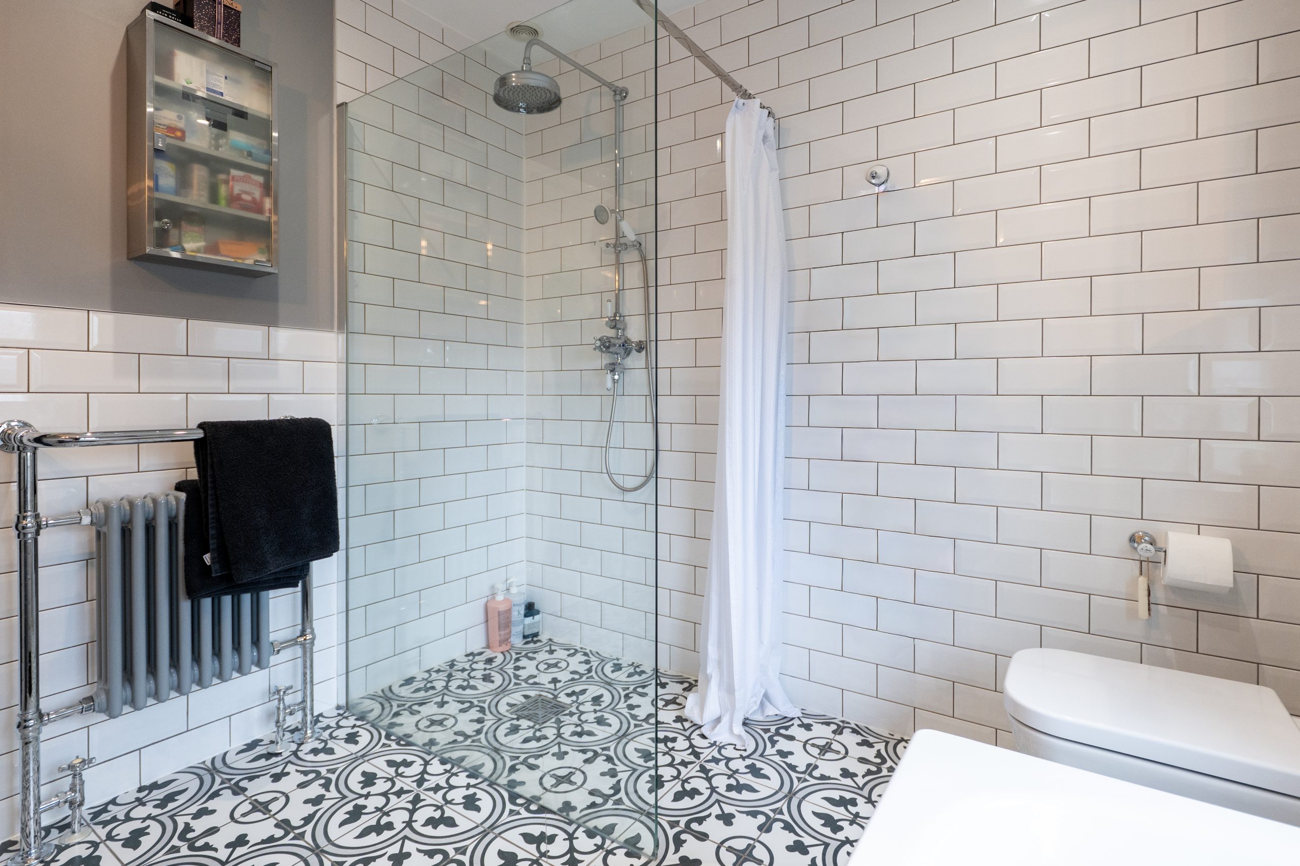 The recently fitted and upgraded family bathroom offers a modern white three piece suite comprising a basin, WC, and bath, along with a separate shower over a wet room style floor. The space is finished with stylish floor to ceiling white metro tiles and complemented by chrome fittings.