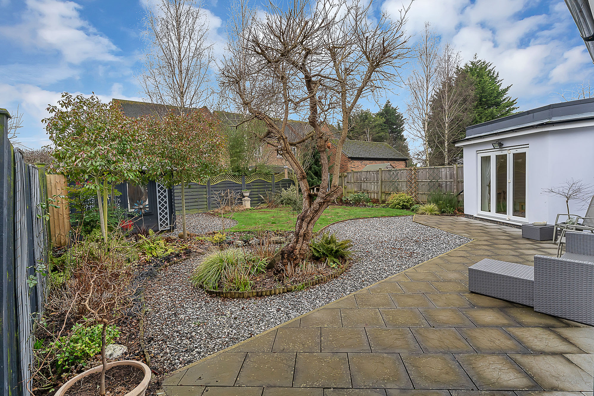 This thoughtfully designed garden is a true sanctuary, blending practicality with aesthetic appeal. There is also an extensive driveway providing off road parking for several vehicles, leading to a garage.