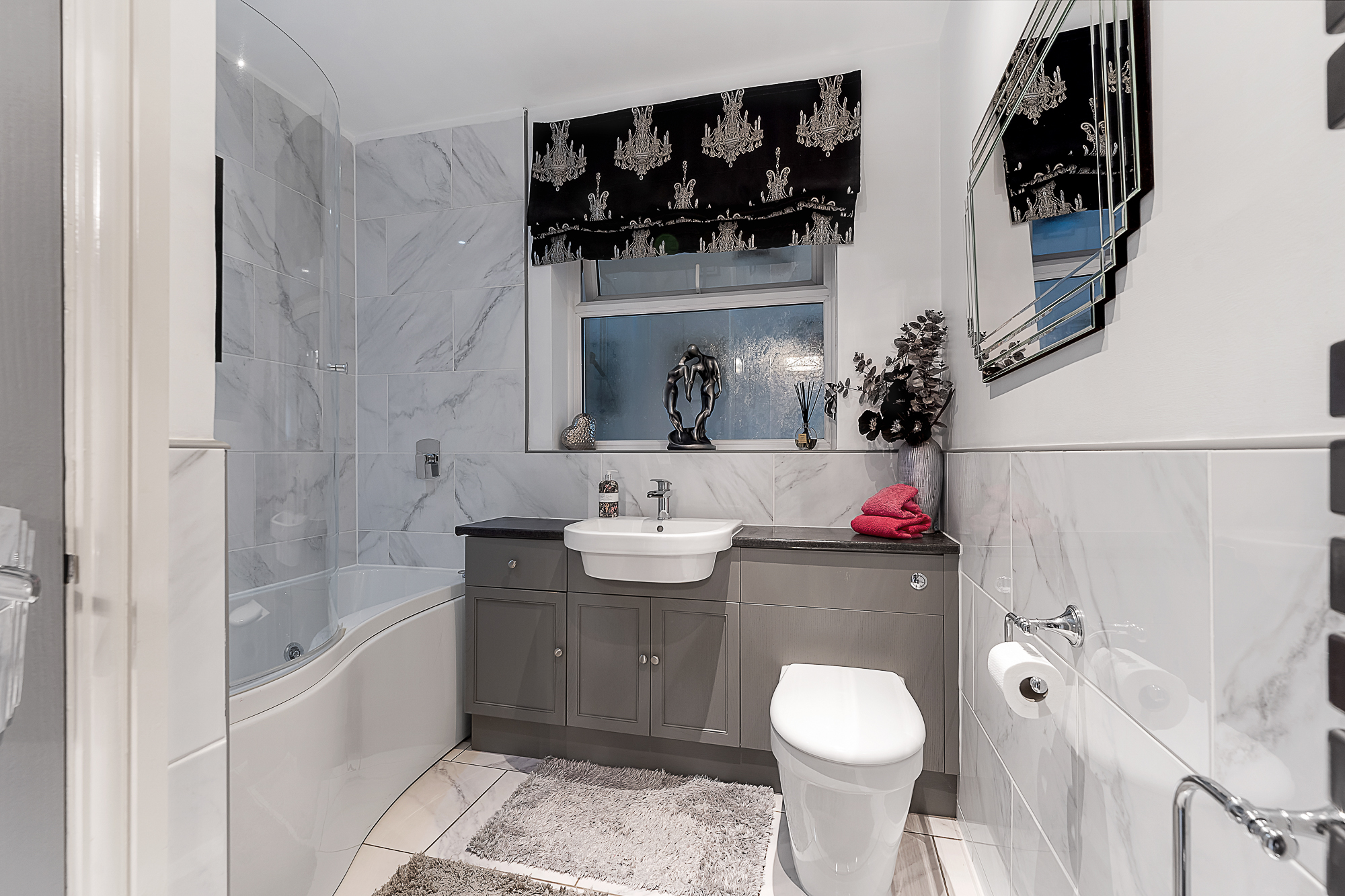 Additionally, there are two further double bedrooms, each equipped with built-in wardrobes, and a refitted family bathroom. The bathroom is designed with bath and a shower overhead, along with a vanity unit that houses the basin and W.C., all adorned with attractive tiling.