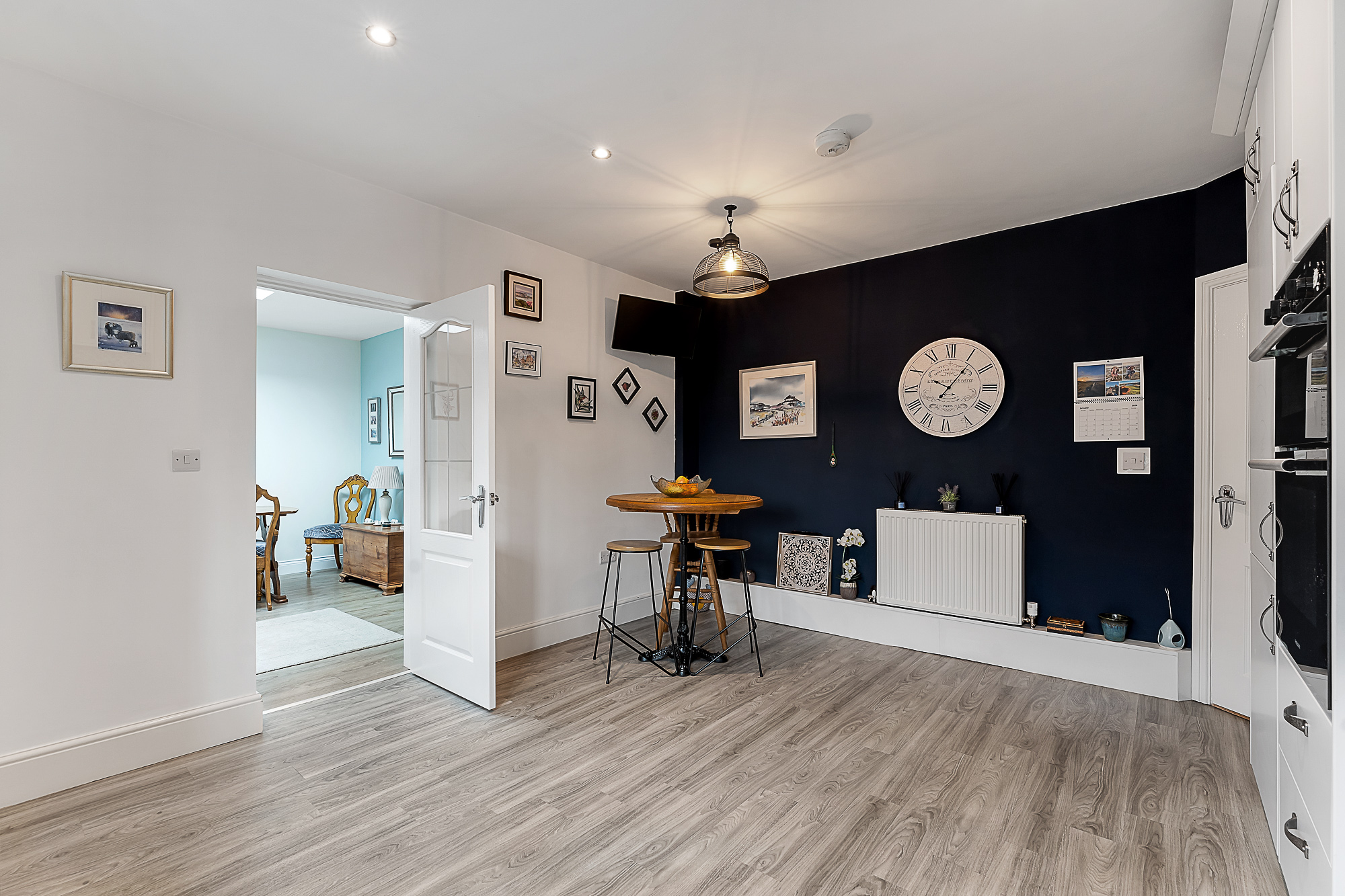 To the left of the hallway, a doorway opens into the generous living room, an impressive space bathed in natural light with doors that opens onto the rear garden. This room could also be used as a bedroom. The spacious, stylish dining kitchen is elegantly fitted with a range of modern cabinetry complemented by worktops and a tiled splashback. It accommodates an integrated double oven, hob and fridge freezer. The versatile living/dining room, is situated at the rear of the home, featuring doors that overlook the rear garden and a large roof lantern that fills the room with natural light.