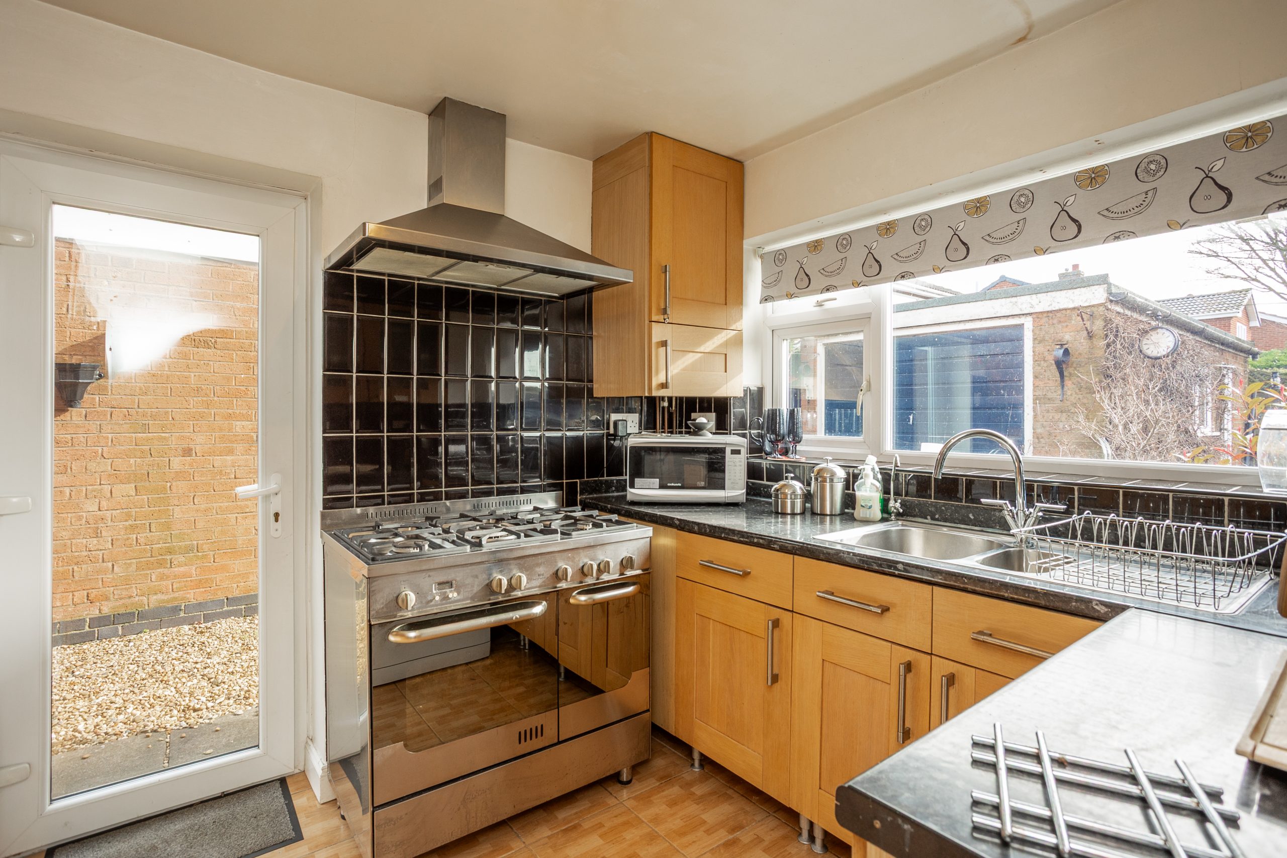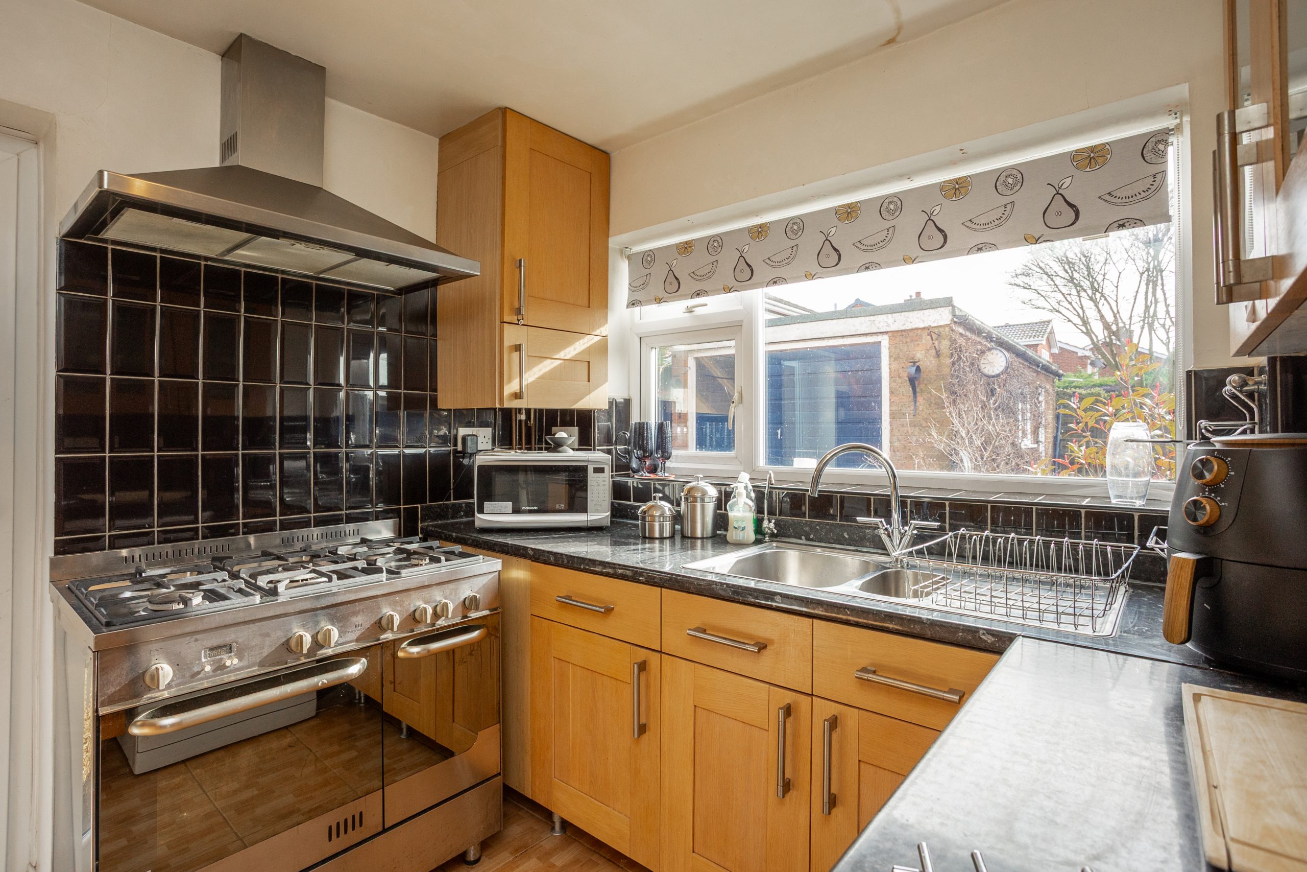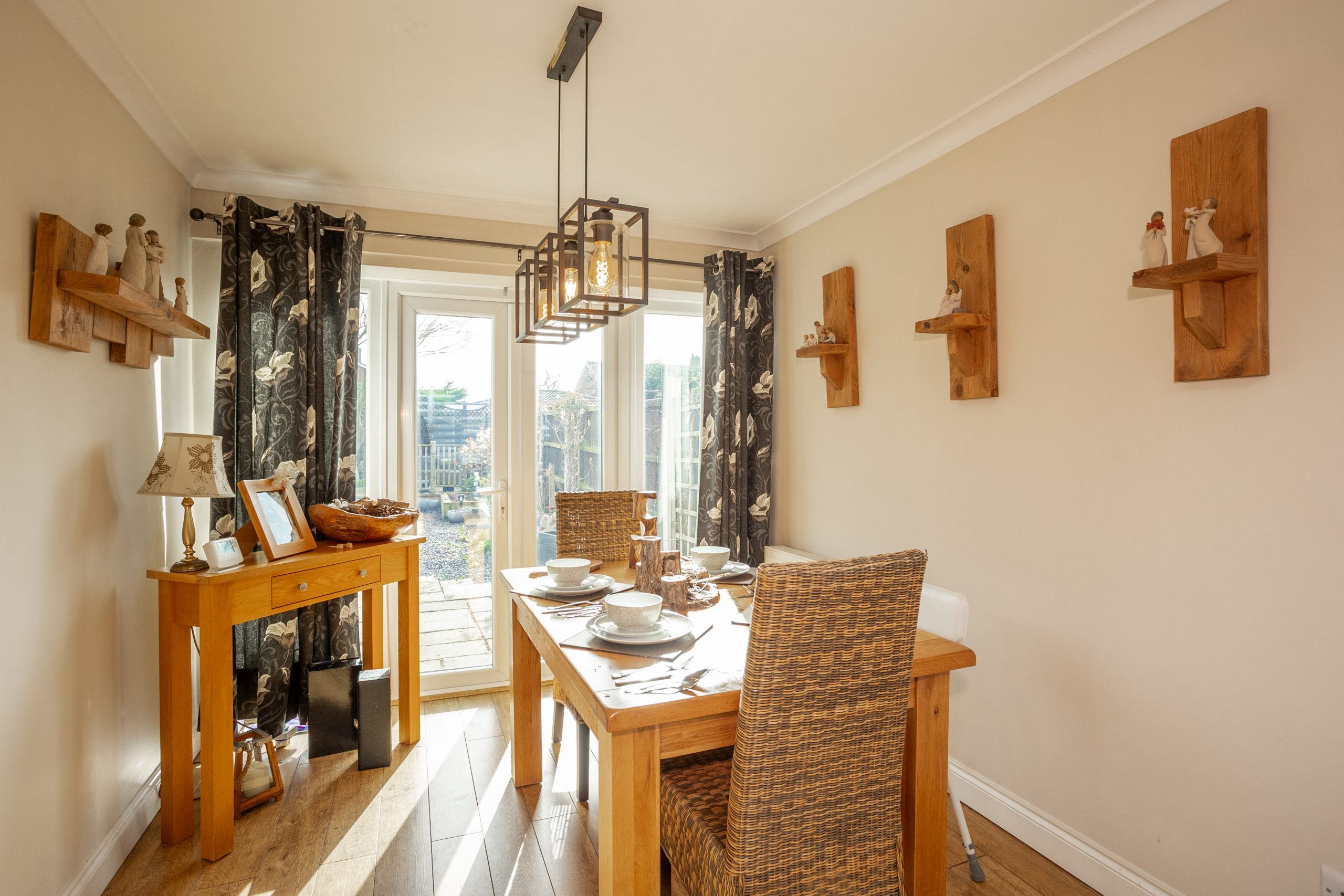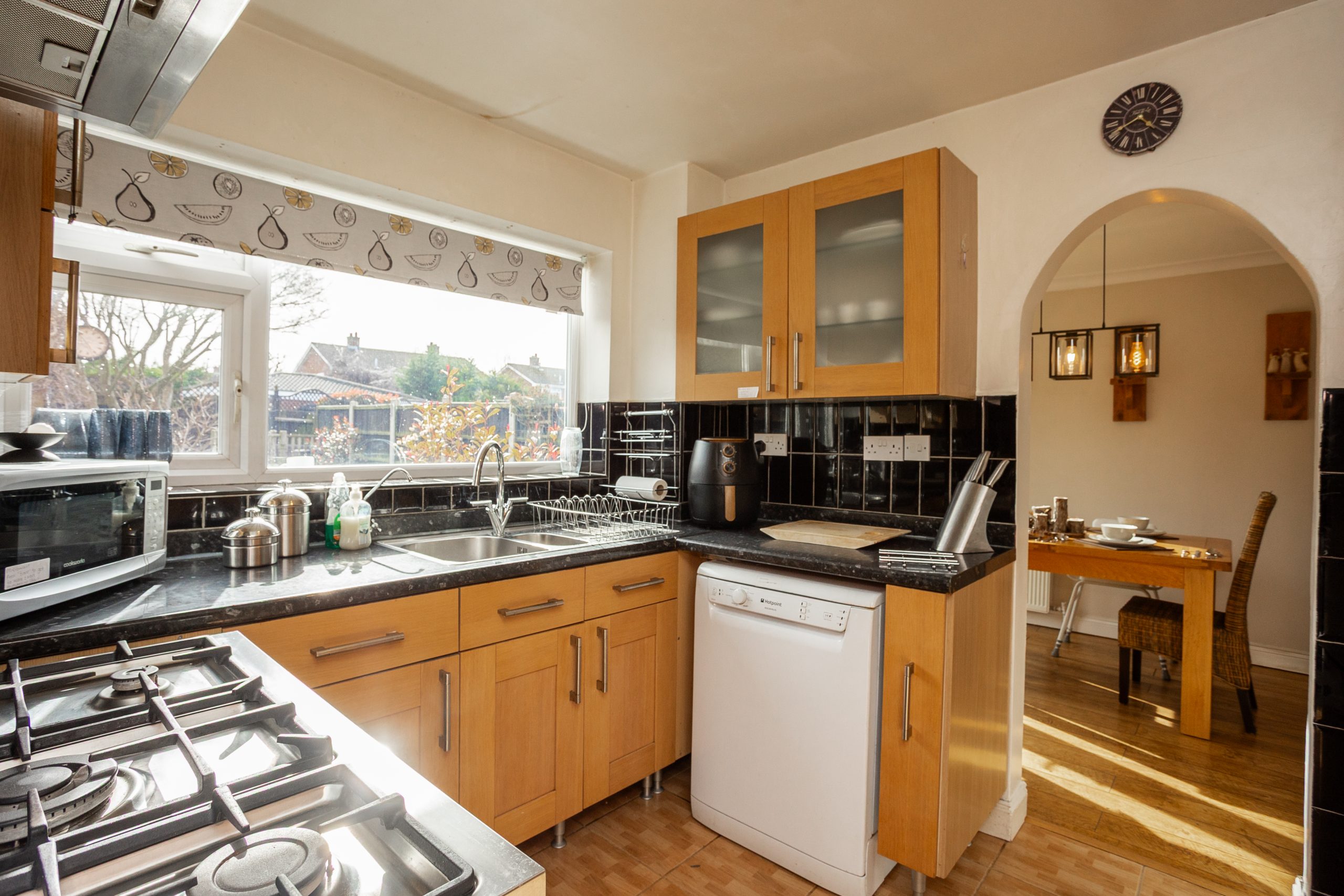 This spacious room features a large full width window overlooking the front garden, matching wood flooring, and an open double doorway into the rear dining area. The dining space enjoys views of the garden through French doors and flows seamlessly into the kitchen via an open archway. Positioned at the rear of the property, the kitchen offers a range of wood effect base and wall units with complementary dark worktops, black tiled splashback, space for several freestanding appliances, and direct access to the rear garden.