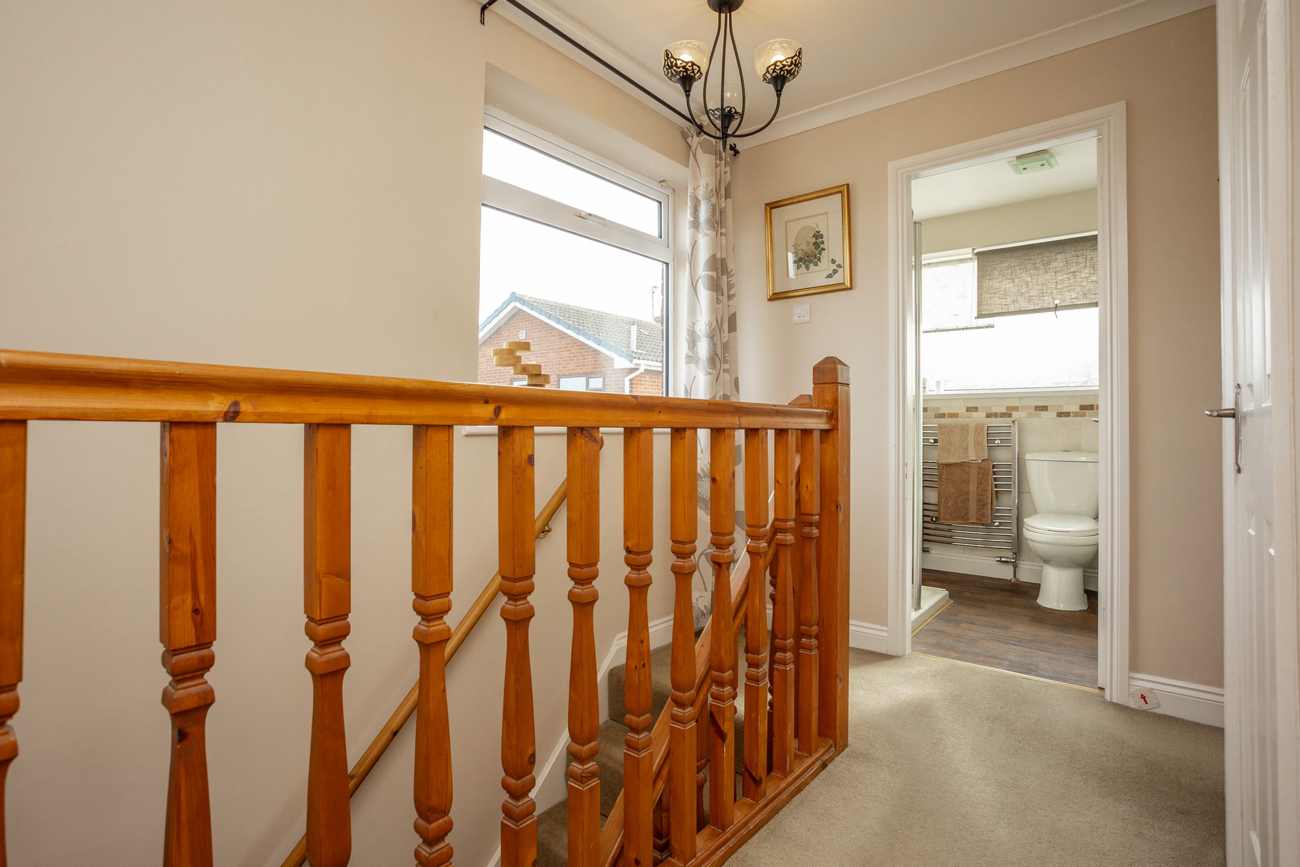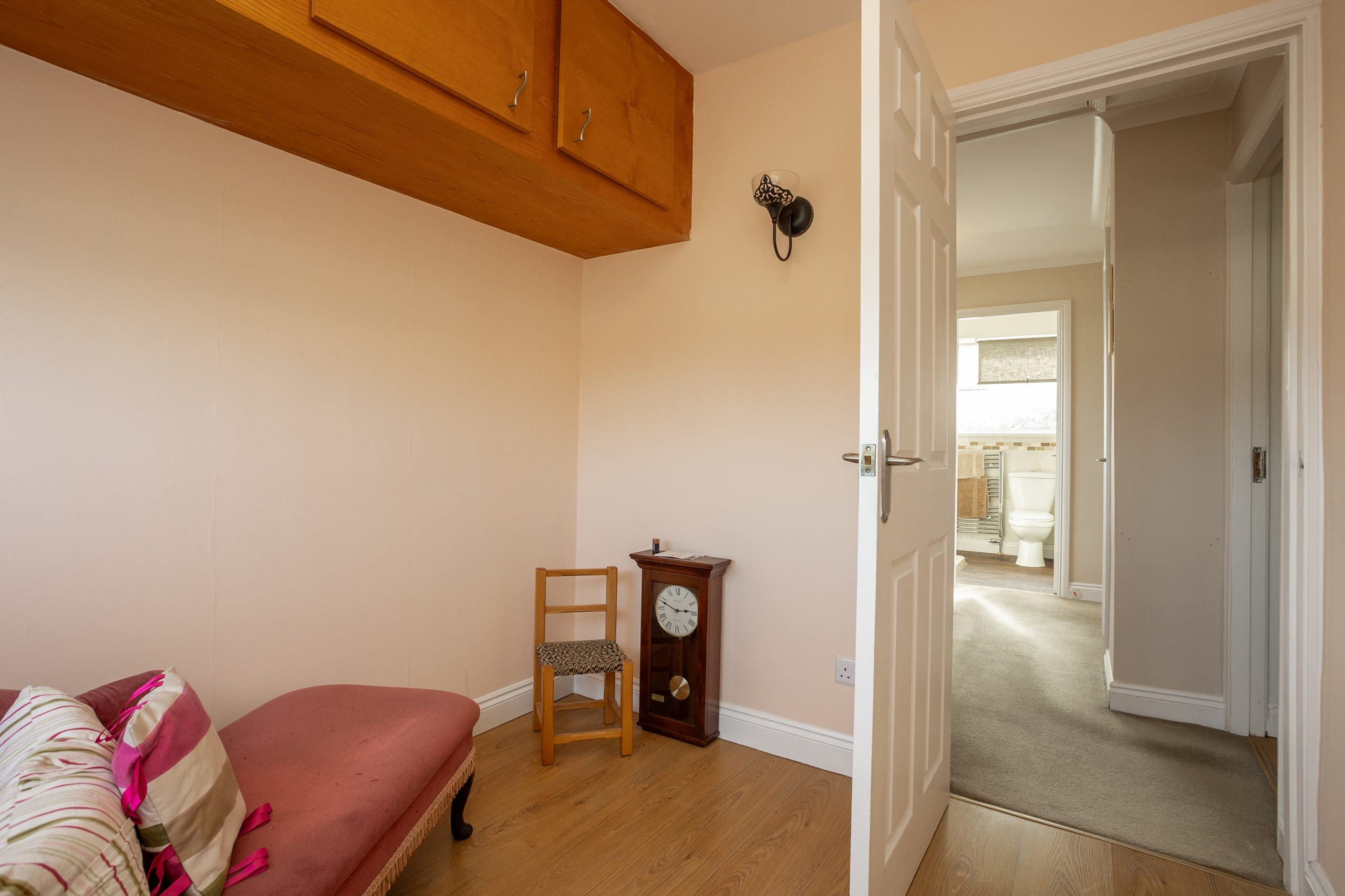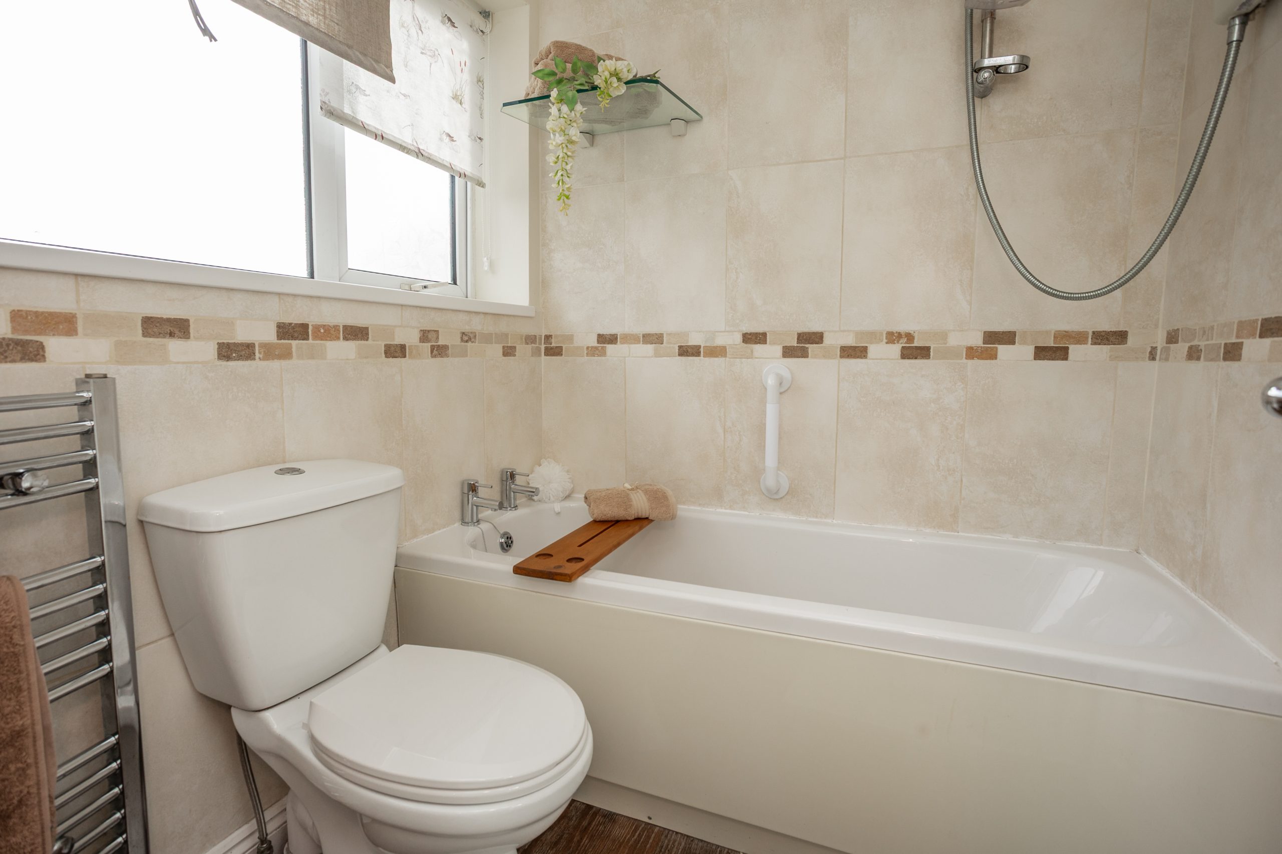 The first-floor landing provides access to all bedrooms and the family bathroom, and features an airing cupboard, a side-facing window, carpeted flooring, and a loft hatch. The main bedroom overlooks the front elevation and includes fitted wardrobes, soft carpet, and a central heating radiator. The second double bedroom enjoys views over the rear garden and offers carpeted flooring, a radiator, and fitted storage, while the third bedroom is a practical single with a front-facing window, wall-mounted storage, carpet flooring, and a radiator. Completing the floor is the family bathroom, fitted with a modern three-piece suite comprising a bath with shower over, a separate free-standing shower cubicle, and a wash hand basin set within a vanity unit, along with a WC. Tasteful tiling, spotlighting, a heated towel radiator, and an obscure rear window provide a stylish and private finish.