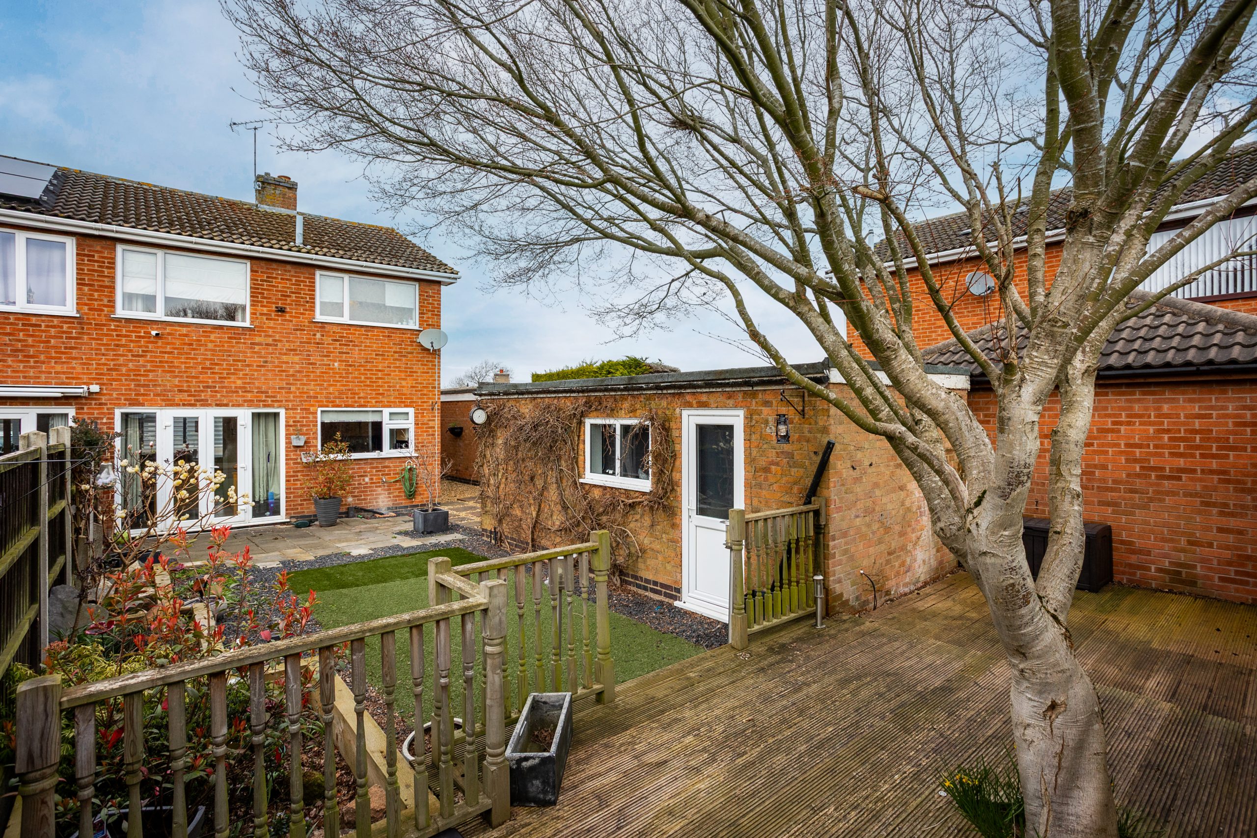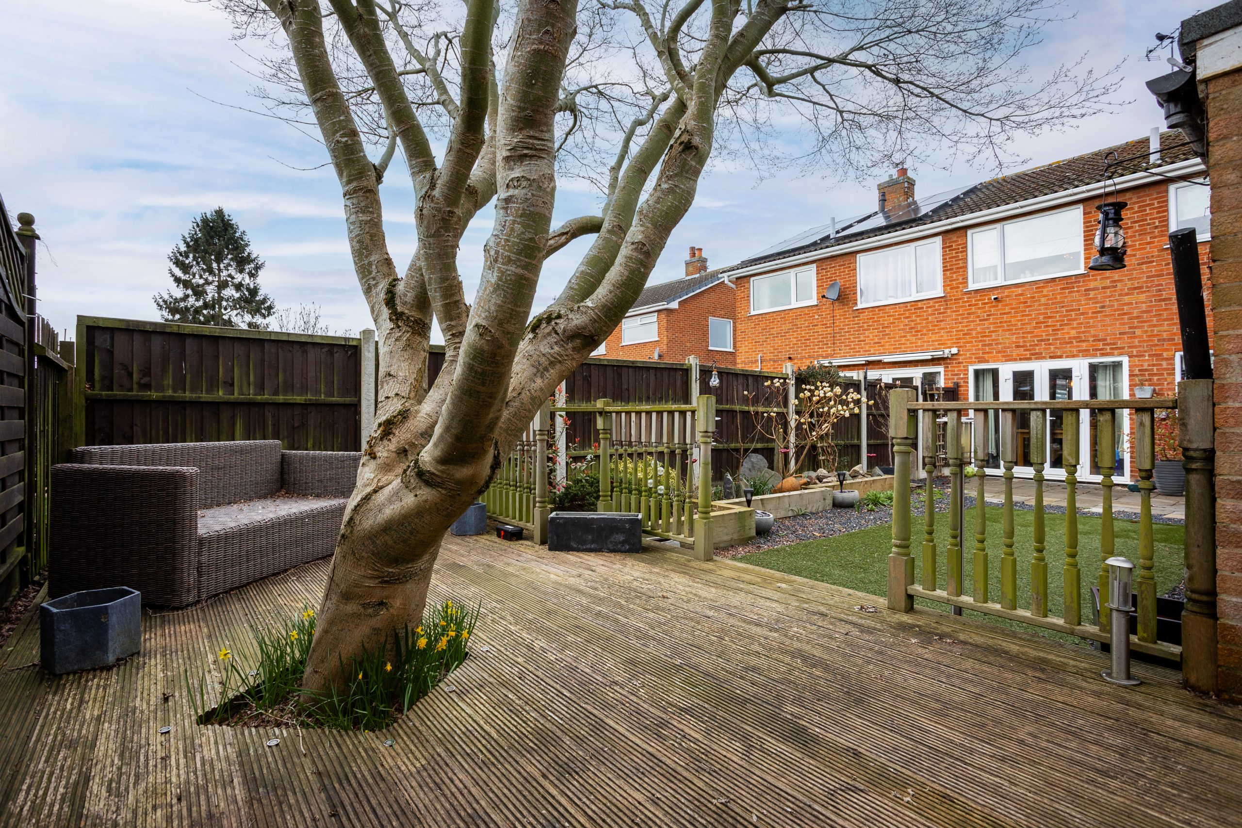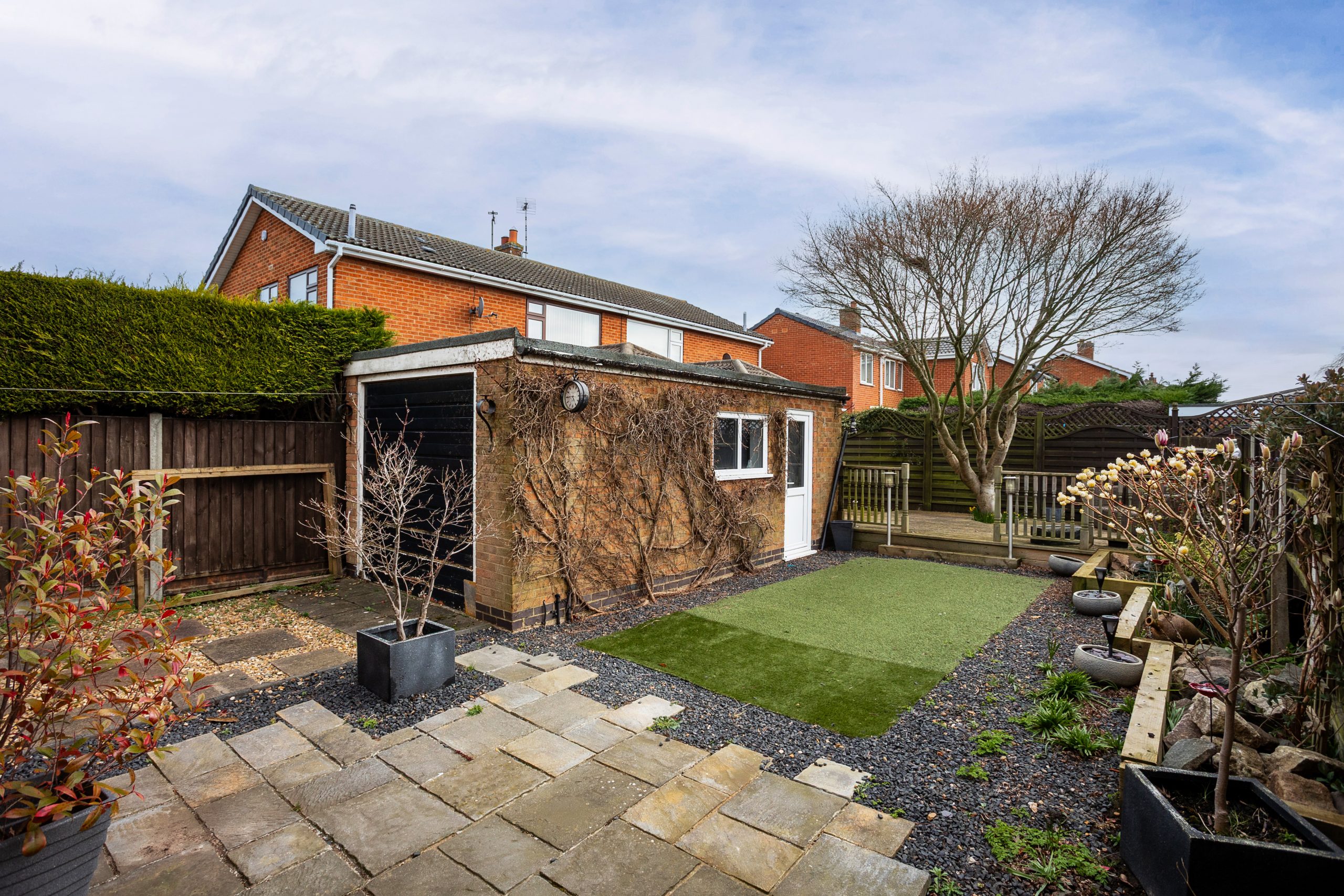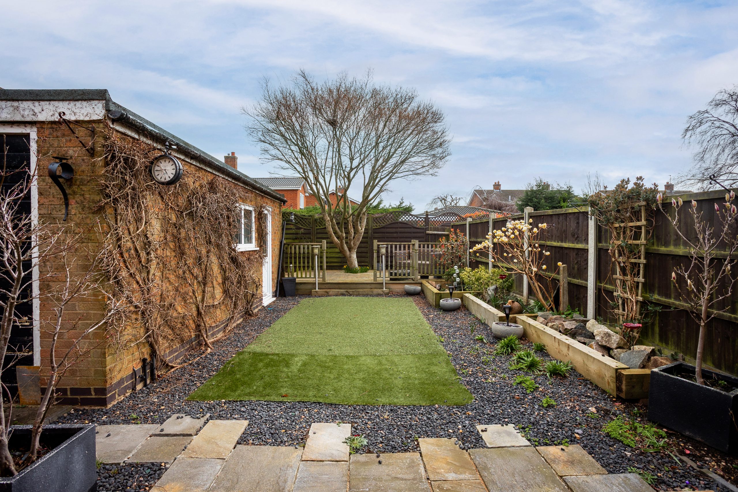 The rear garden continues the low maintenance theme, featuring a patio area, an artificial lawn, decorative slate, and raised borders planted with a variety of shrubs and greenery. A raised patio area at the far end of the garden provides an ideal spot to enjoy the sun, perfect for outdoor dining, relaxing, or entertaining.