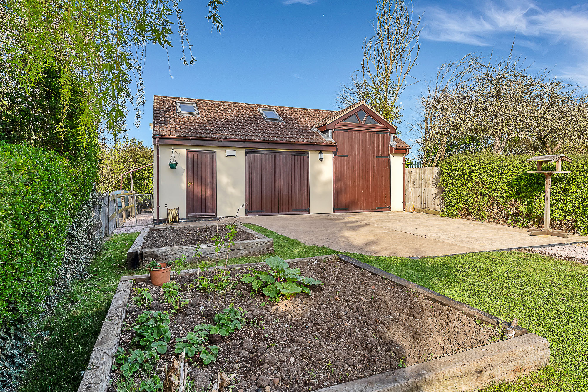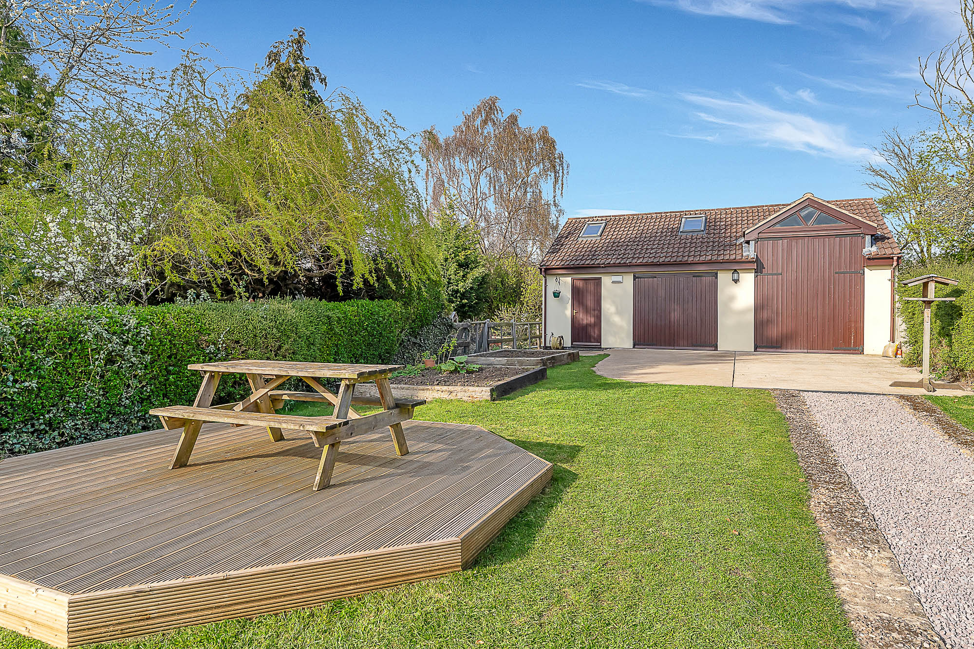 The rear garden is a real highlight, private, secure and thoughtfully designed for both relaxation and entertaining. A patio sits just outside the property, creating an ideal spot for outdoor dining, while the garden itself is mainly laid to lawn and features raised flower and vegetable beds, a well placed decked seating area and a gravelled pathway leading to the detached garage and store, with mezzanine level, complete with toilet and sink facilities. The space is framed by a variety of vibrant shrubs and greenery, offering colour and interest throughout the seasons.