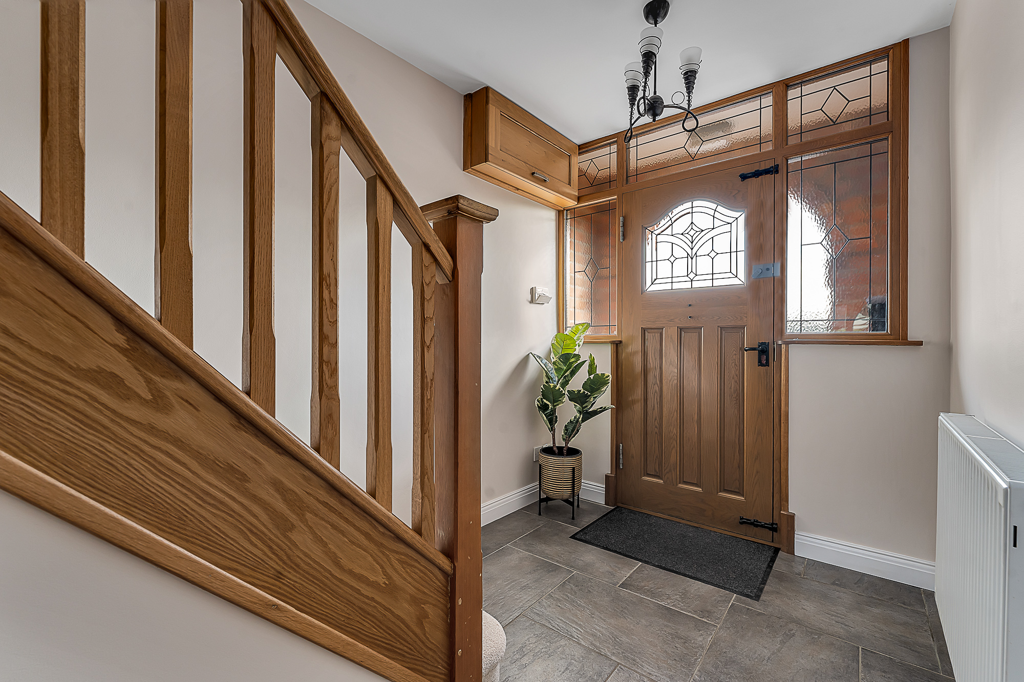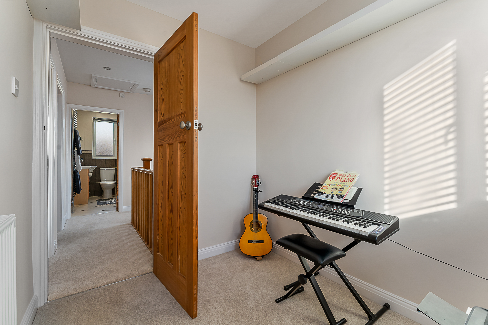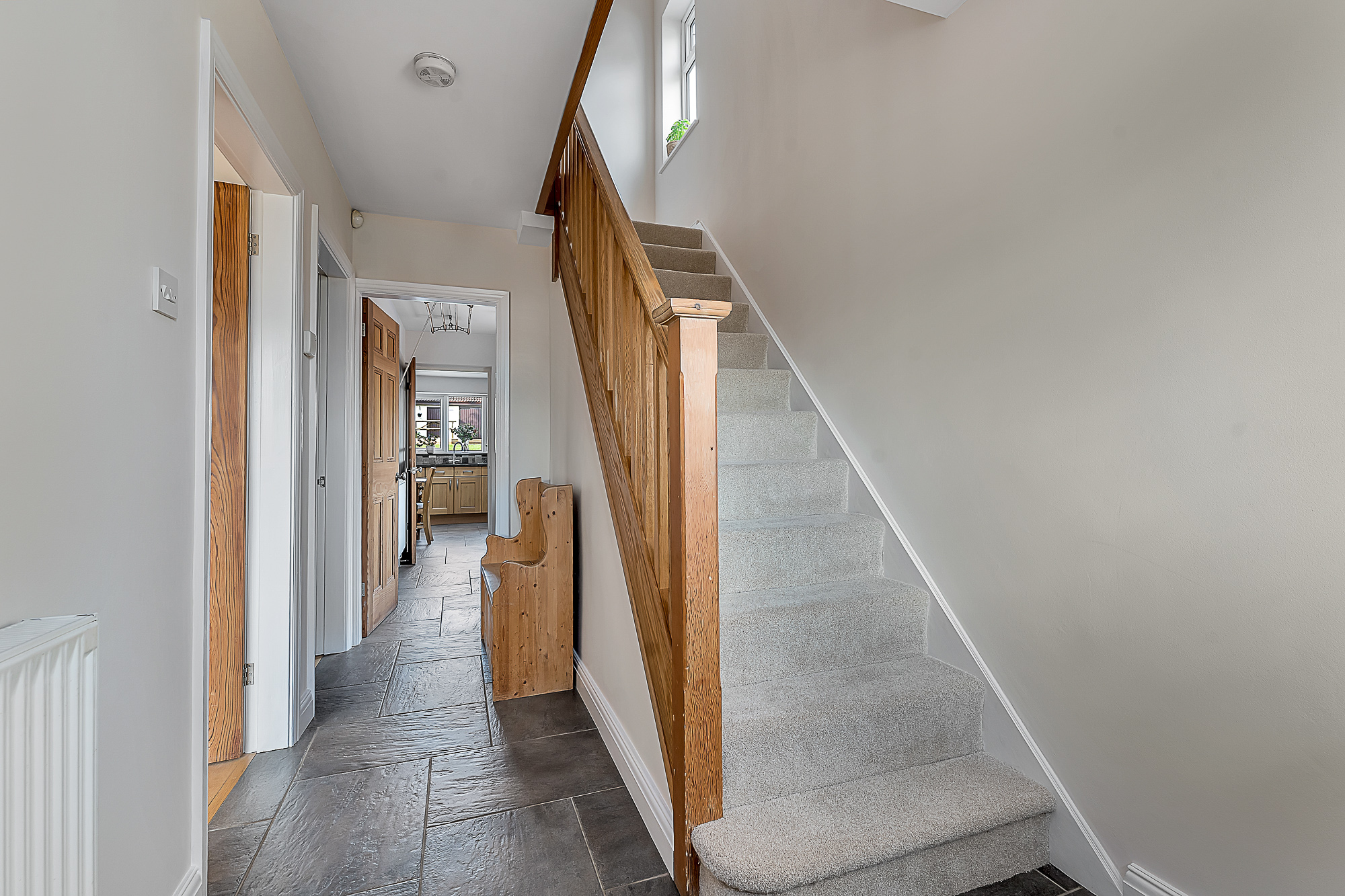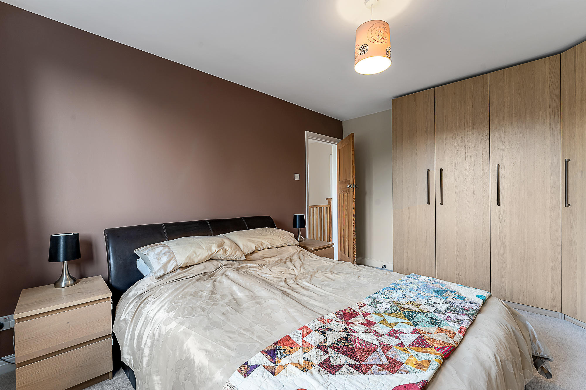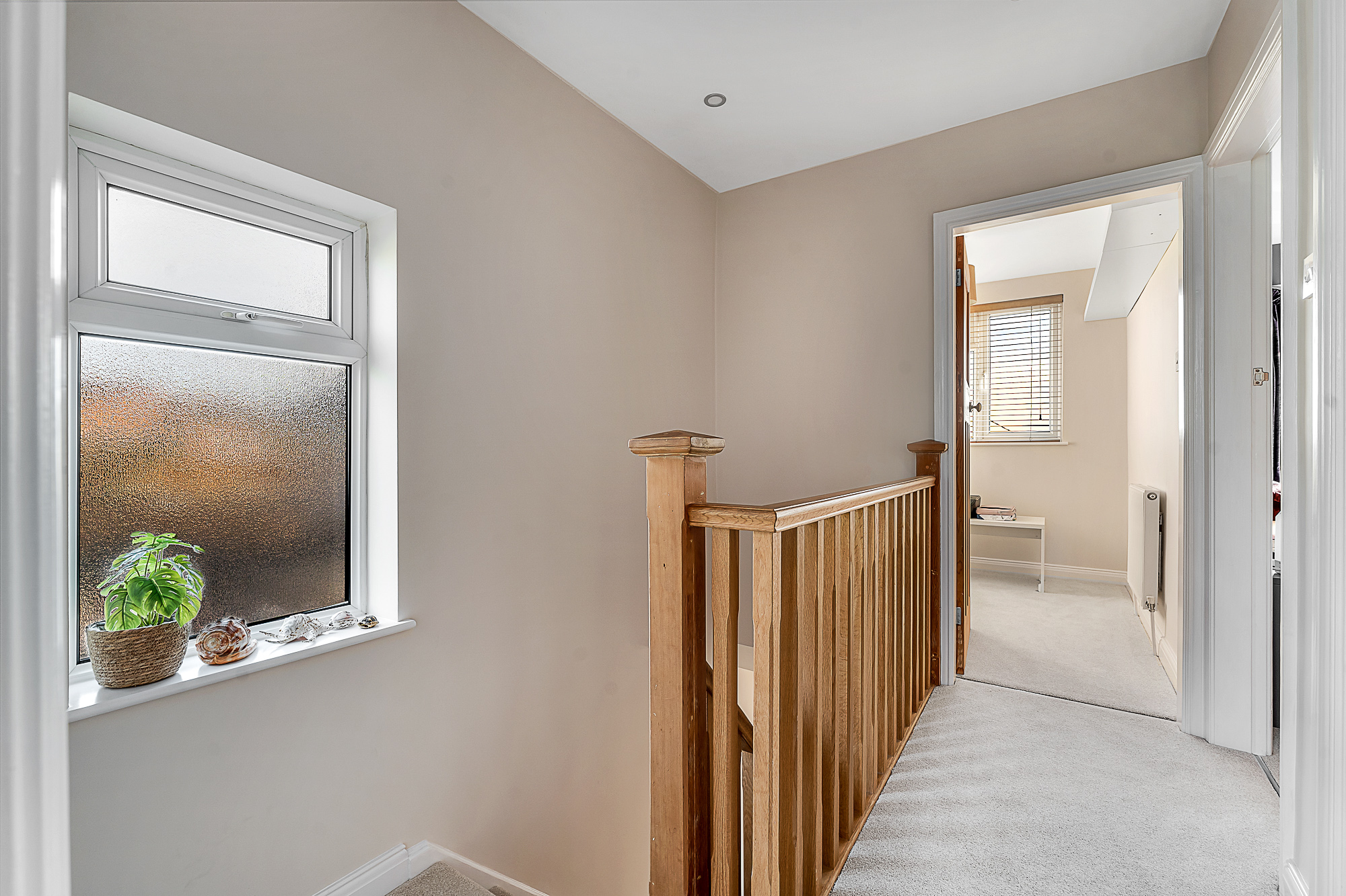The staircase to the first floor is fitted with a neutral cream carpet, complemented by a wooden banister, with the same carpeting continuing throughout all upstairs bedrooms to create a cohesive and modern feel.
