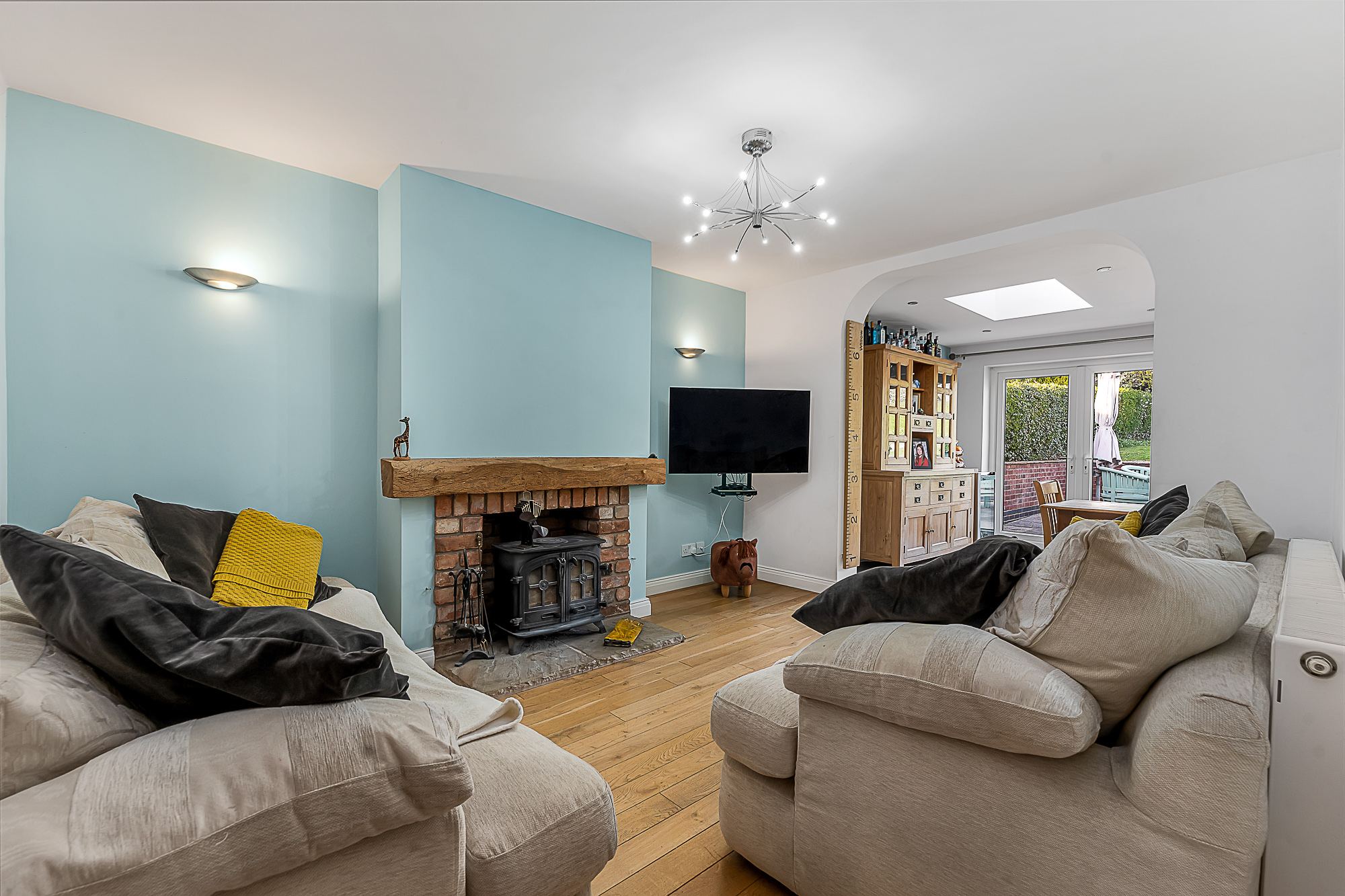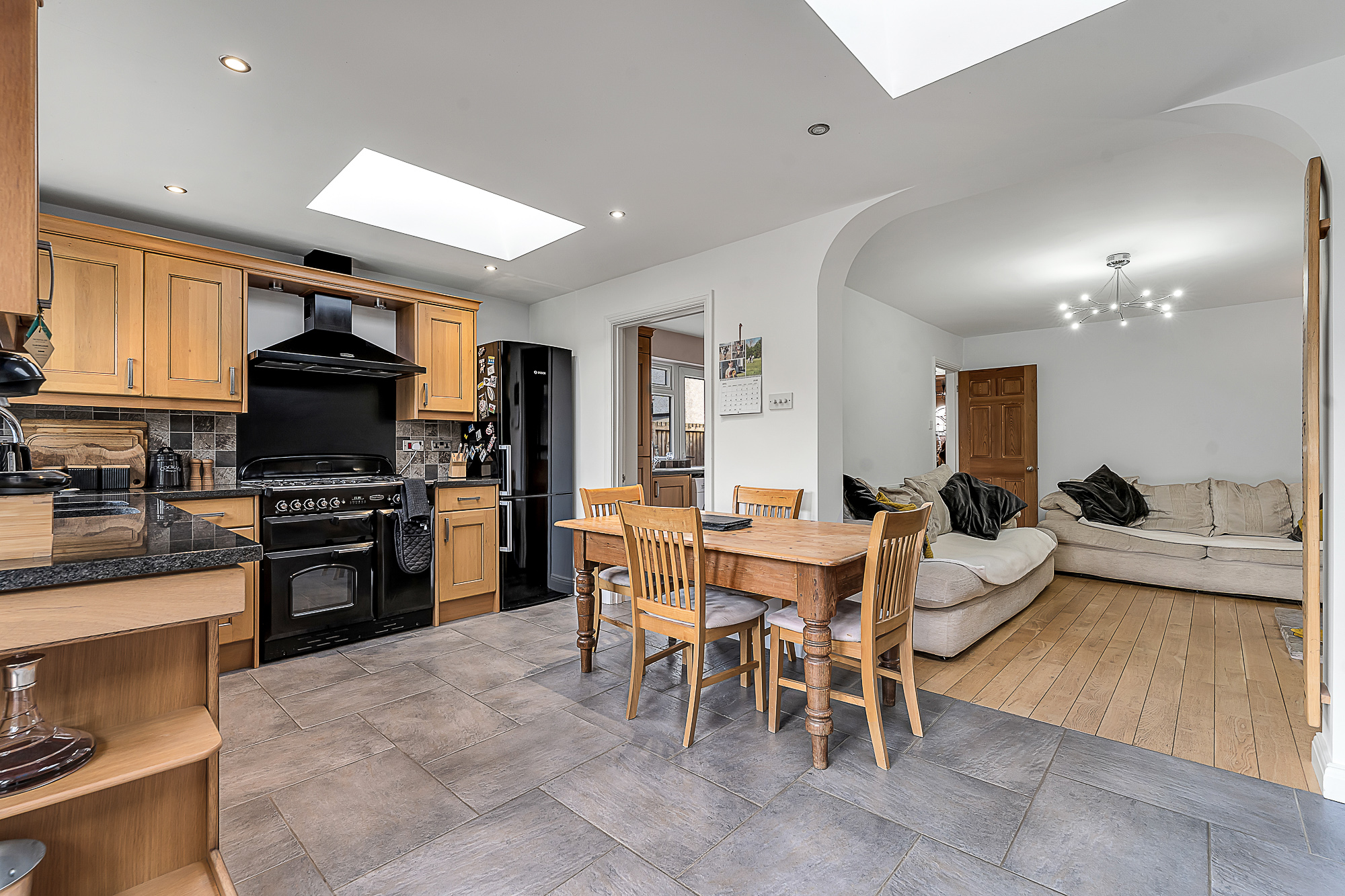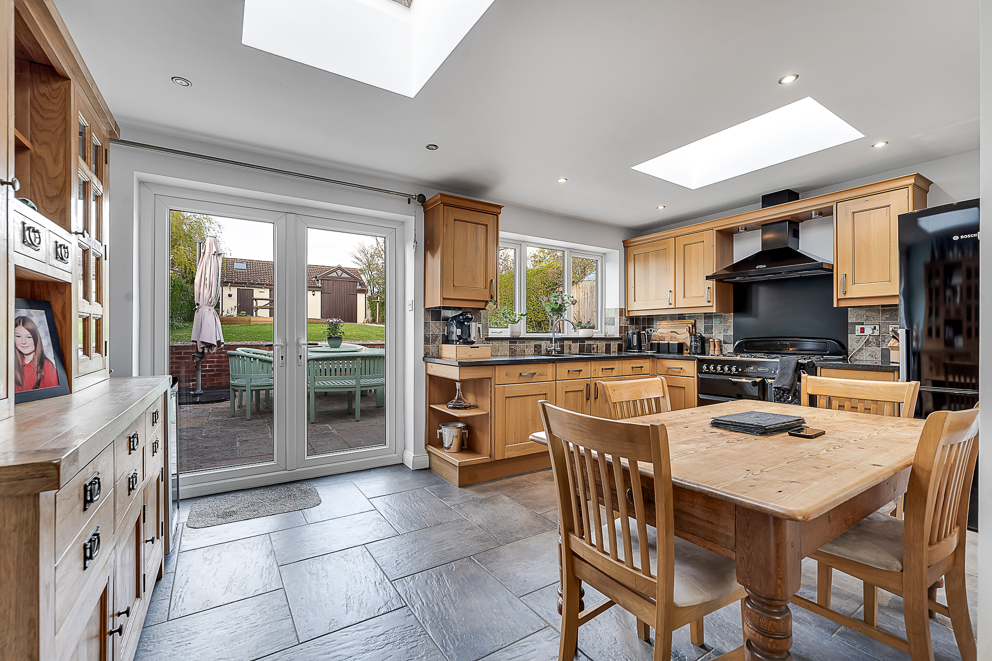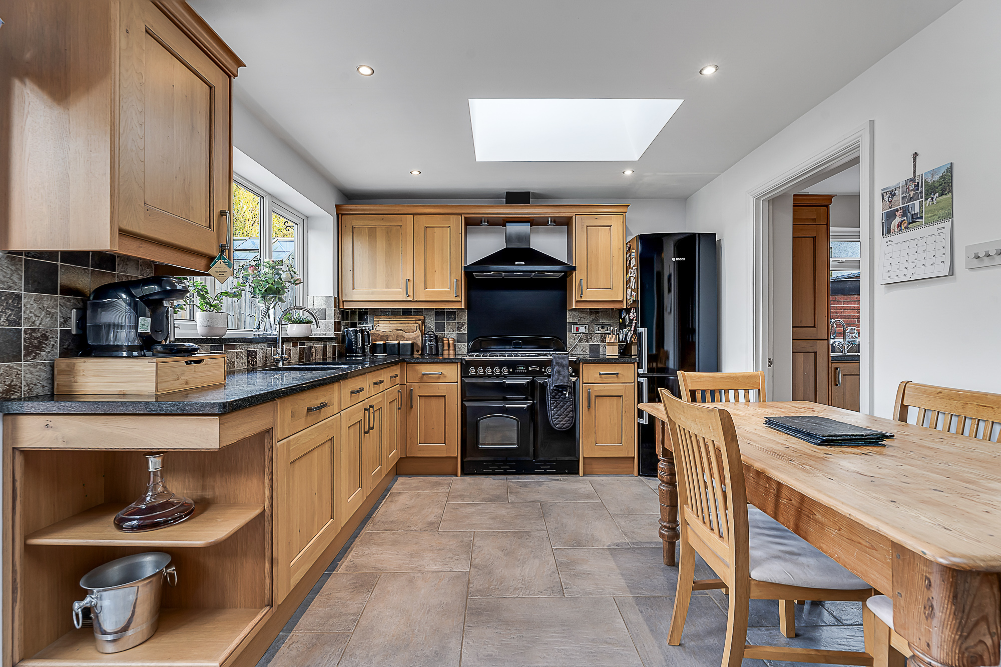 A further doorway opens into the cosy reception area, continuing the same wooden flooring and offering another charming feature fireplace with a rustic wooden mantel. This room flows seamlessly into the extended kitchen dining area at the rear. The kitchen has been thoughtfully designed with a range of wooden shaker style base and wall units, complementary black worktops, spotlights and two ceiling skylights that enhance the natural light. The flagstone flooring continues through this space, which also includes a black gas range with extractor, an integrated dishwasher, space for a fridge freezer and patio doors leading out to the rear patio.