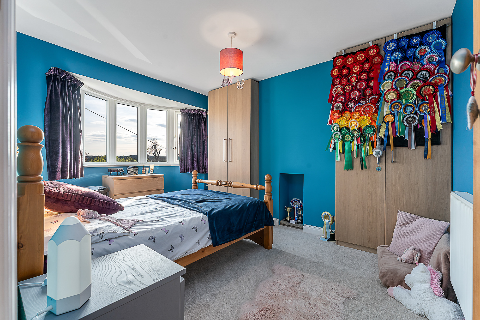 To the front of the property are bedrooms two and three. Bedroom two is a spacious double room with a large bay window overlooking the front aspect and includes two fitted wardrobes, providing ample storage. Bedroom three also enjoys a front-facing window, bringing in good natural light, and is ideally suited as a home office, nursery, or single bedroom.