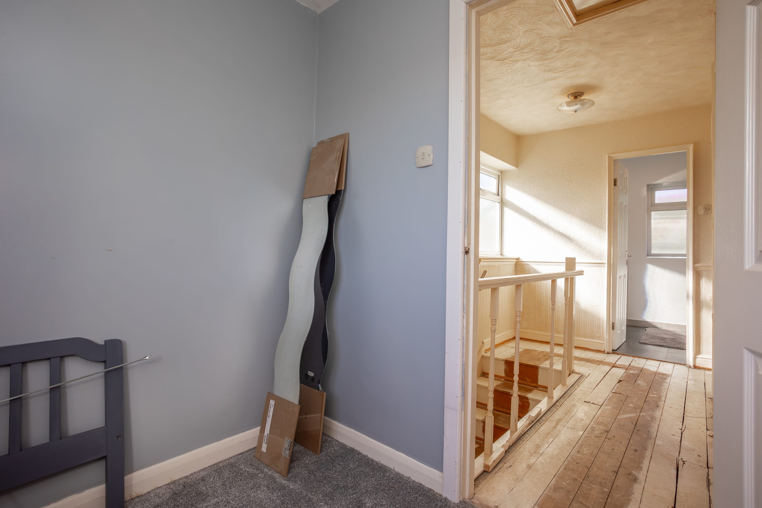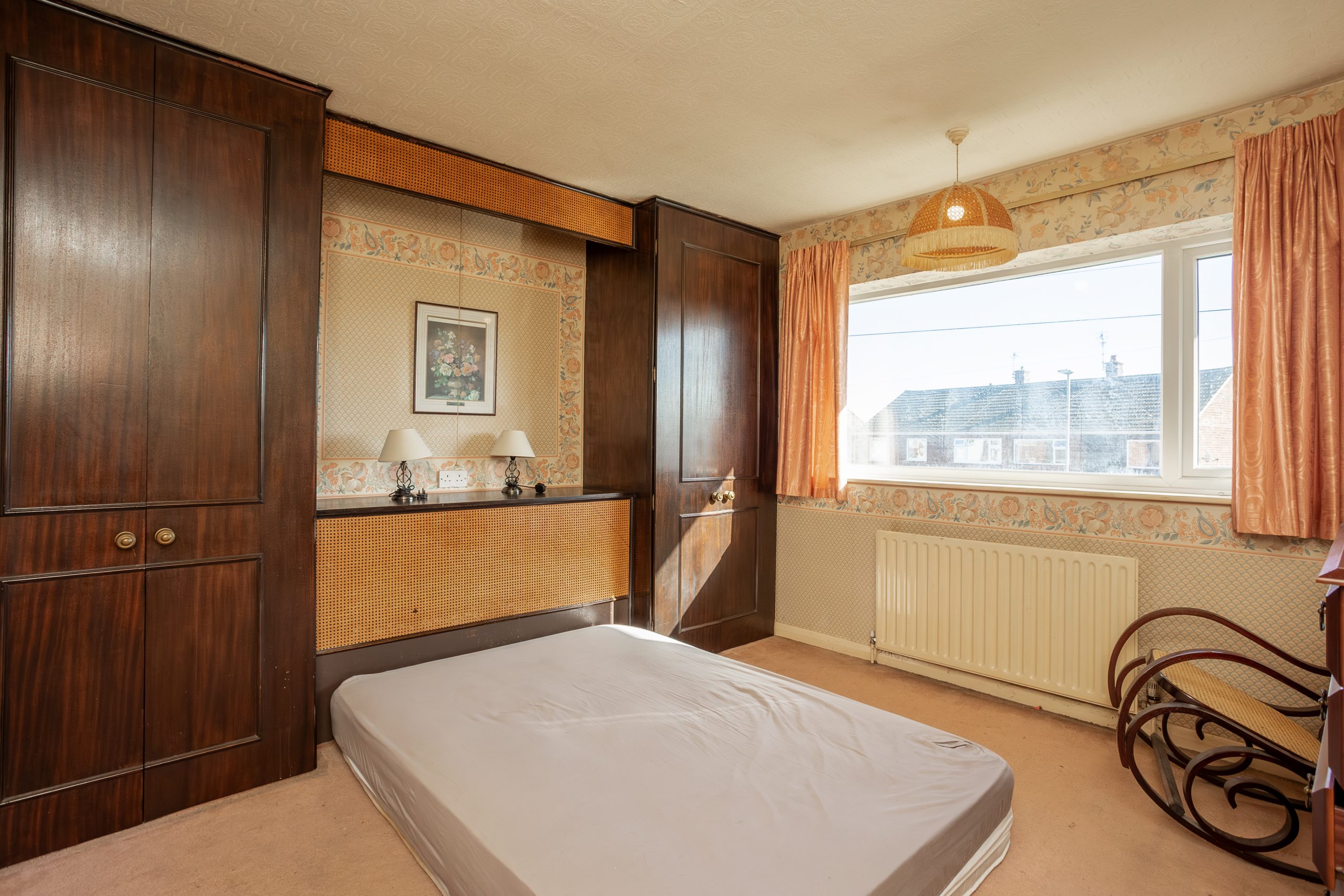The first-floor landing offers access to three bedrooms, a storage cupboard, and loft hatch. The primary bedroom, positioned to the front elevation, benefits from fitted wardrobes and a large window that floods the room with natural light. The second bedroom, a generous double located at the rear, features built-in storage cupboards and another large window. The third bedroom, also to the front, is a single. Completing the floor is a recently refitted, stylish shower room, finished with contemporary tiling and comprising a large walk-in shower, low-level WC, hand basin set within a built-in vanity unit, and a chrome heated towel rail.