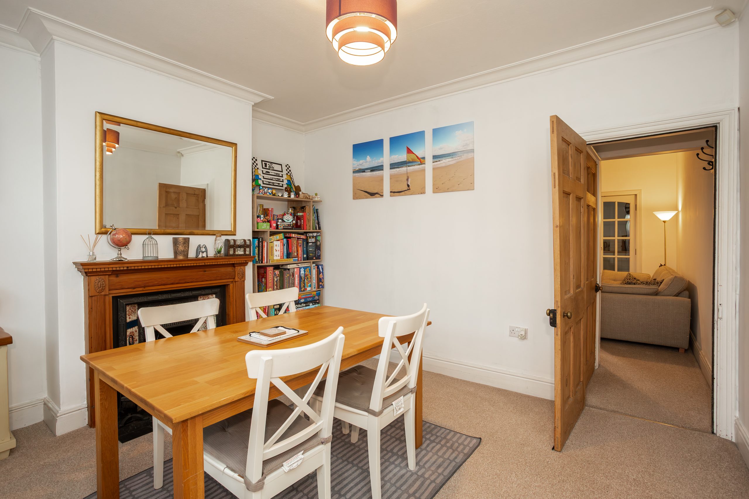 The welcoming, bright and airy dining room is positioned at the front of the property, with a charming Victorian fireplace featuring a wooden surround with open fire.