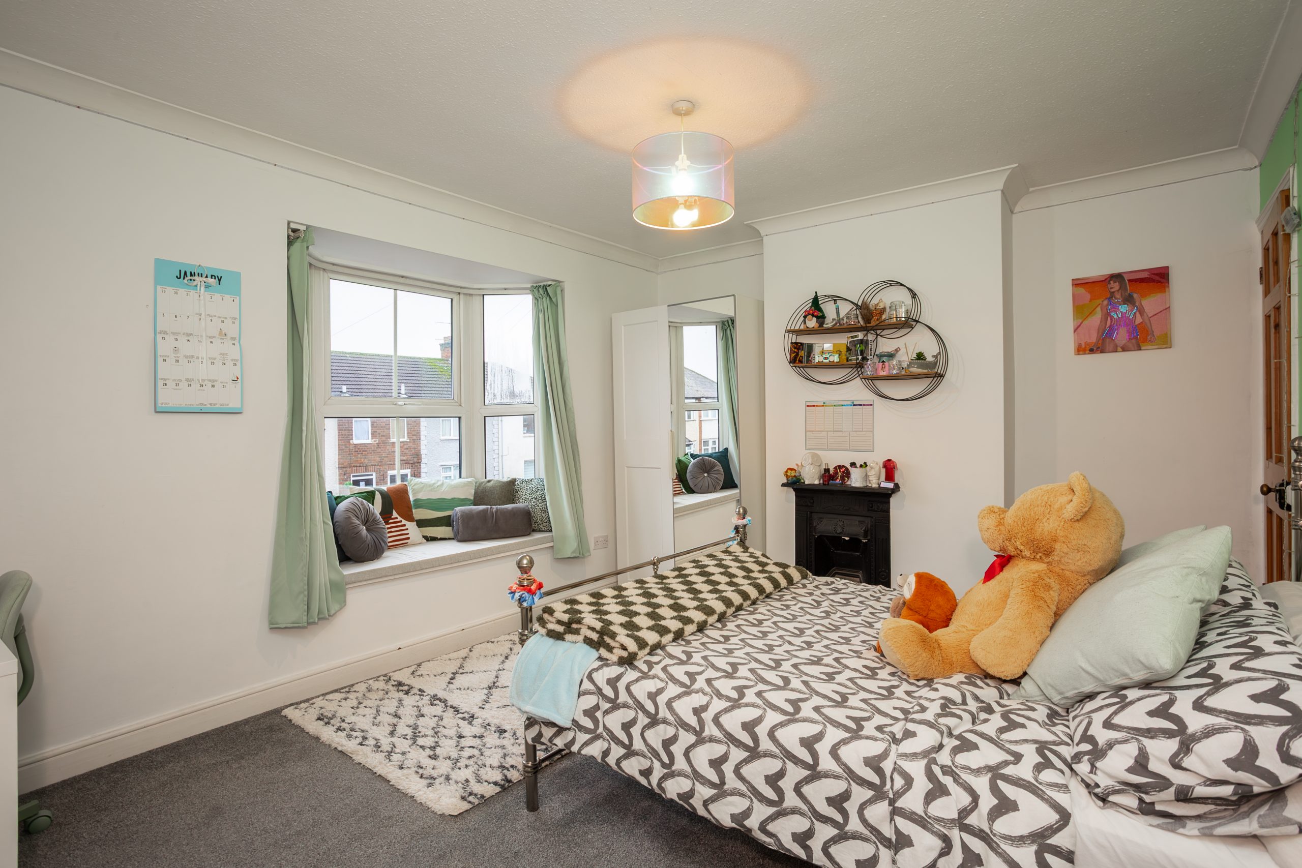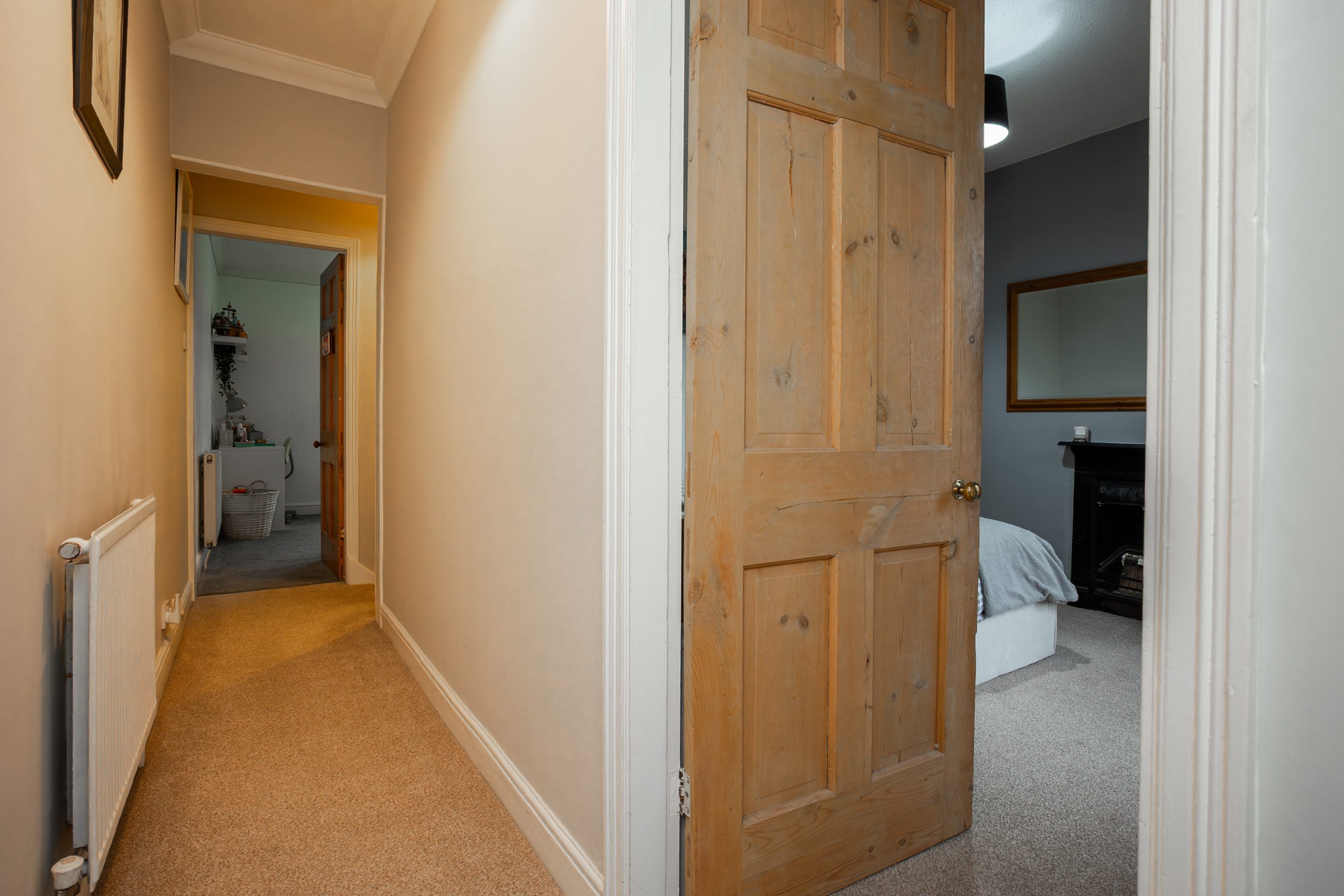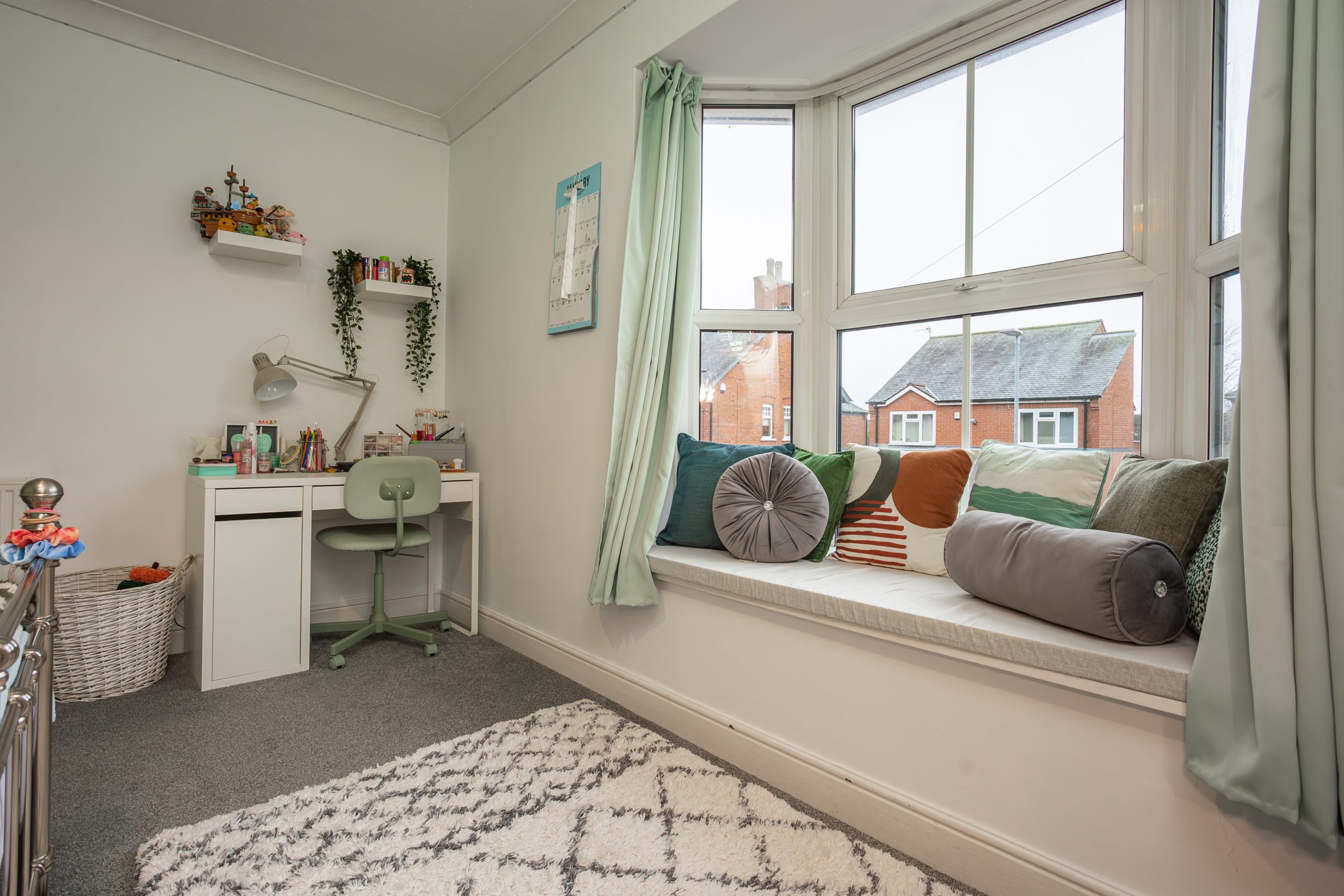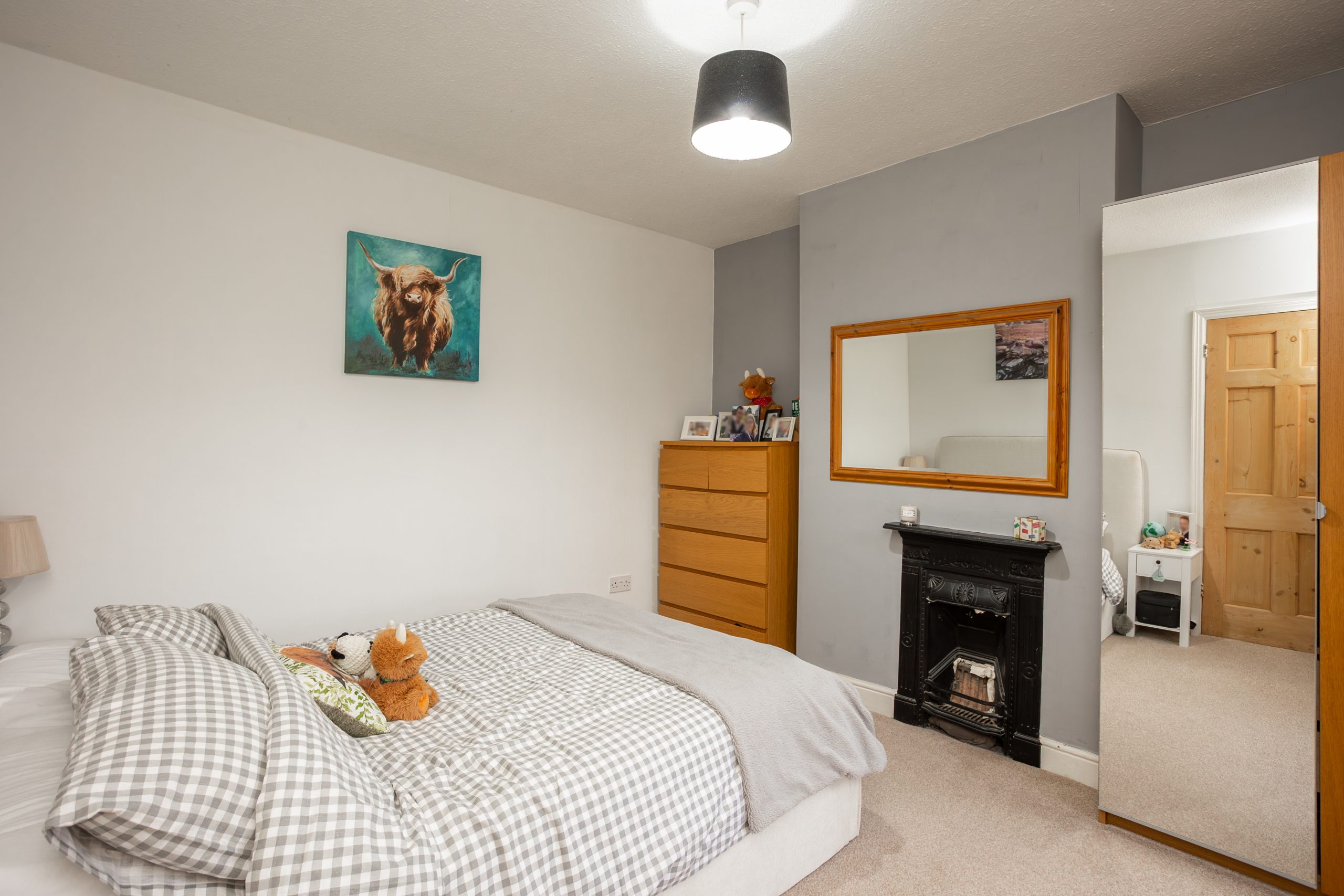 A staircase from the living room leads to the first-floor landing, which provides access to two double bedrooms and a family bathroom. The primary bedroom is located at the front of the property, this spacious double bedroom features a built-in cupboard, stylish window seat and a Victorian feature fireplace. The second double bedroom is positioned towards the rear of the home, this room benefits from natural light and a comfortable, homely ambiance with Victorian feature fireplace. Plush carpeting throughout the first floor enhances the welcoming atmosphere. The family bathroom is equipped with a freestanding bath, a separate shower, W.C. For added convenience, a built-in vanity unit housing the basin and heated towel rail.