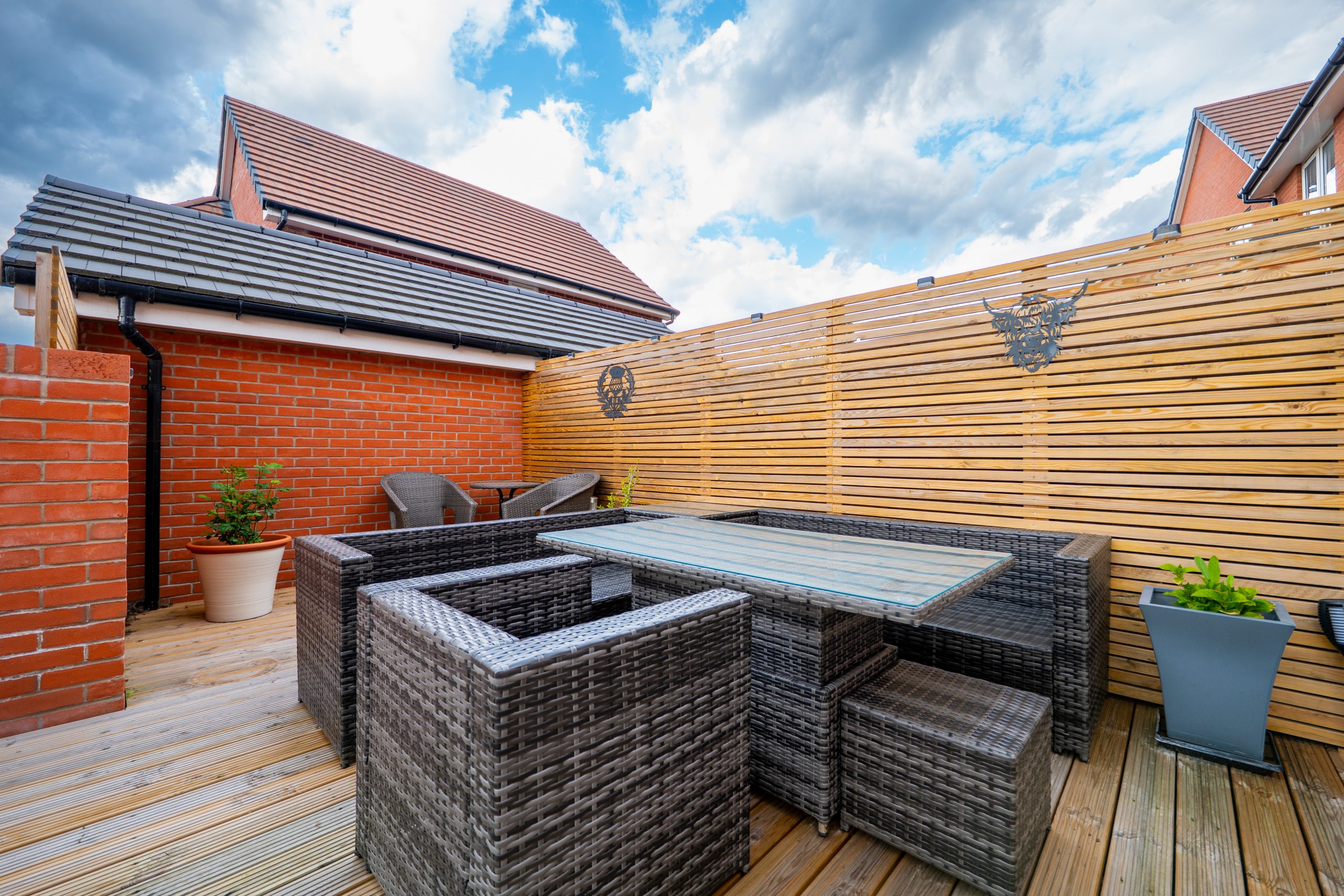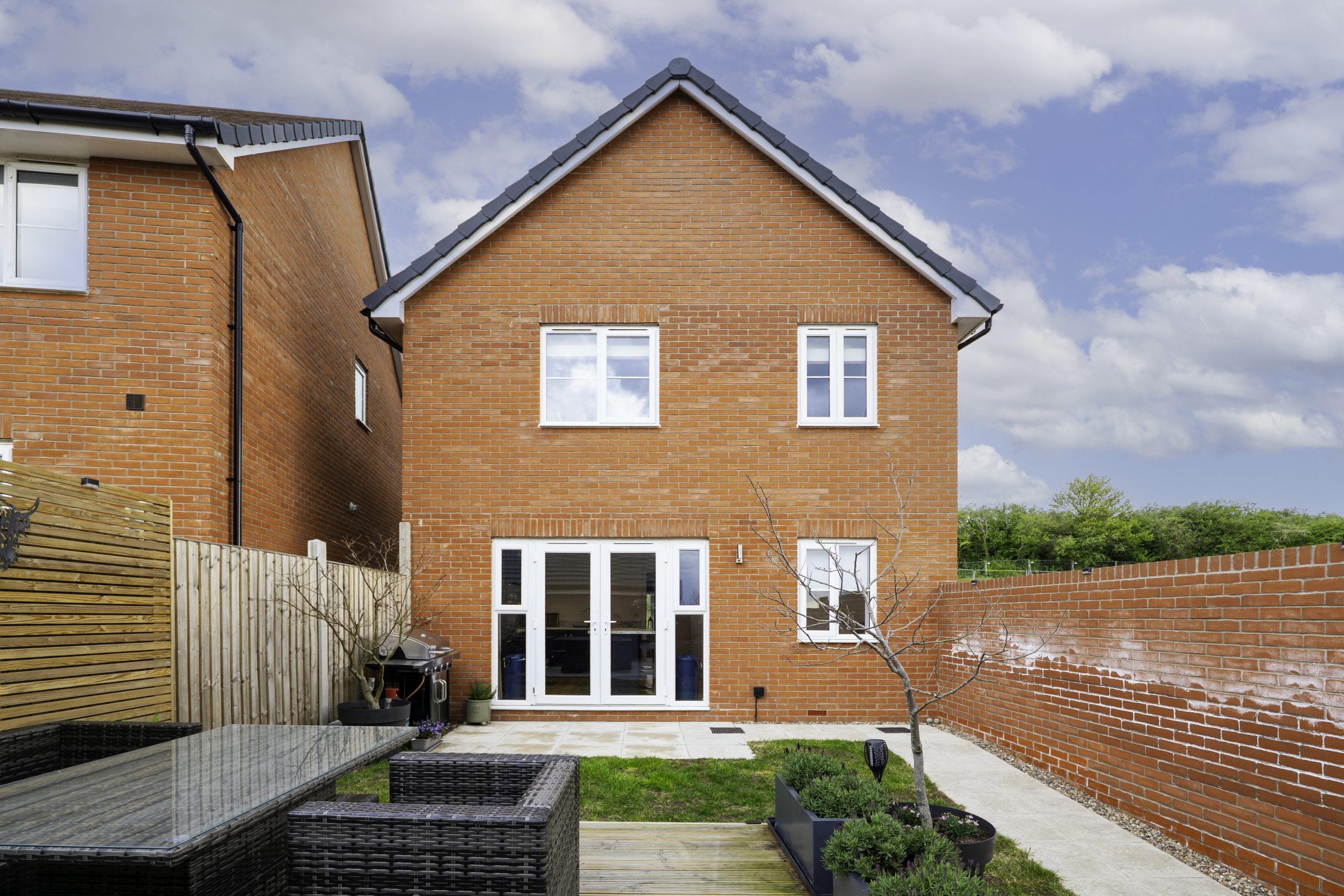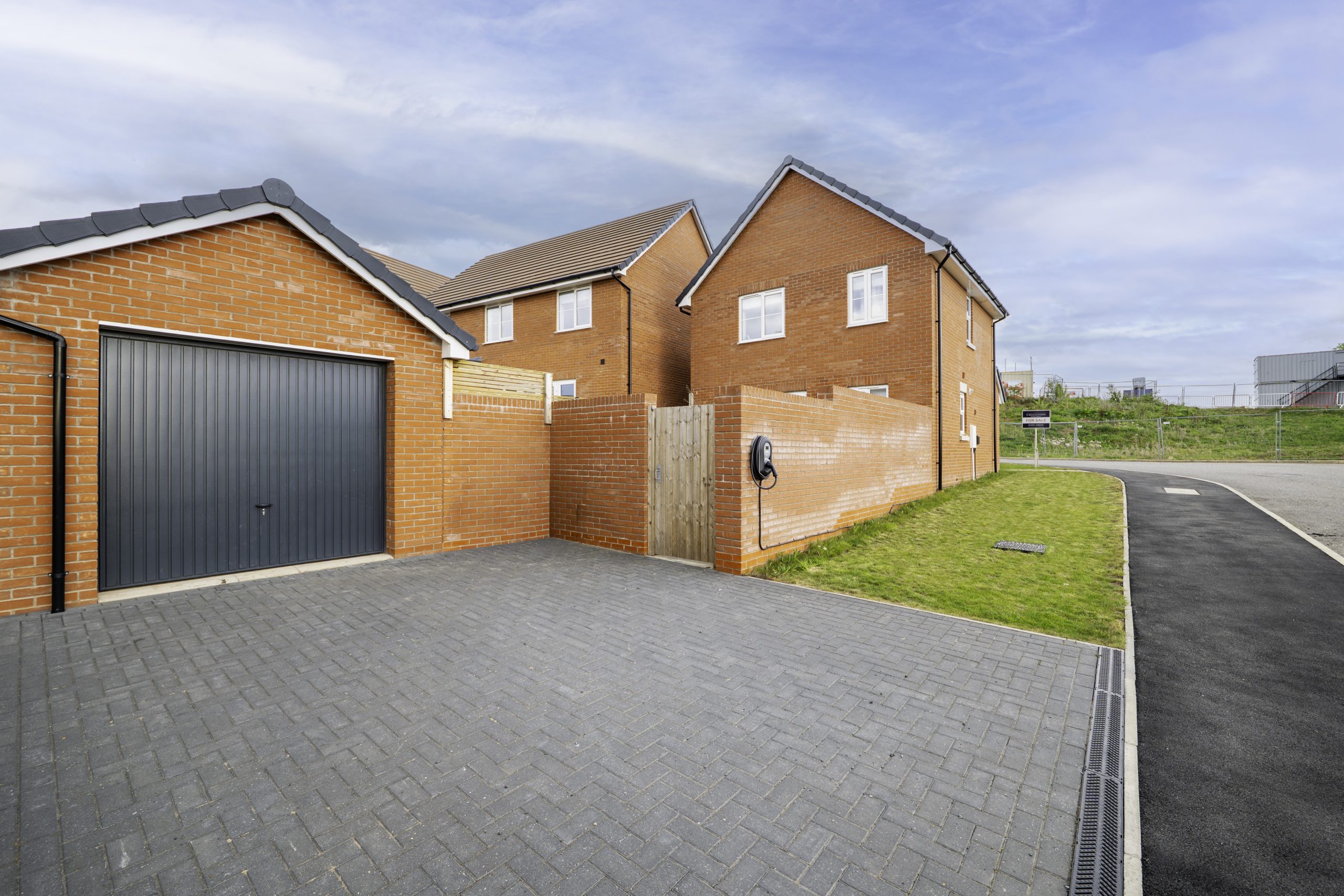 The property enjoys strong kerb appeal, with a neatly maintained frontage featuring a lawn, bark topped borders and a central pathway. The block-paved driveway sits to the side of the home, offering low maintenance parking and is already wired for an electric vehicle charging point. This leads to a spacious detached garage, ideal for storage or secure parking. Gated access opens into the rear garden, which is enclosed by walls to two sides and designed for easy outdoor living. It includes a patio area, a lawn and a contemporary decked seating space, creating a modern and versatile setting for relaxing or entertaining.