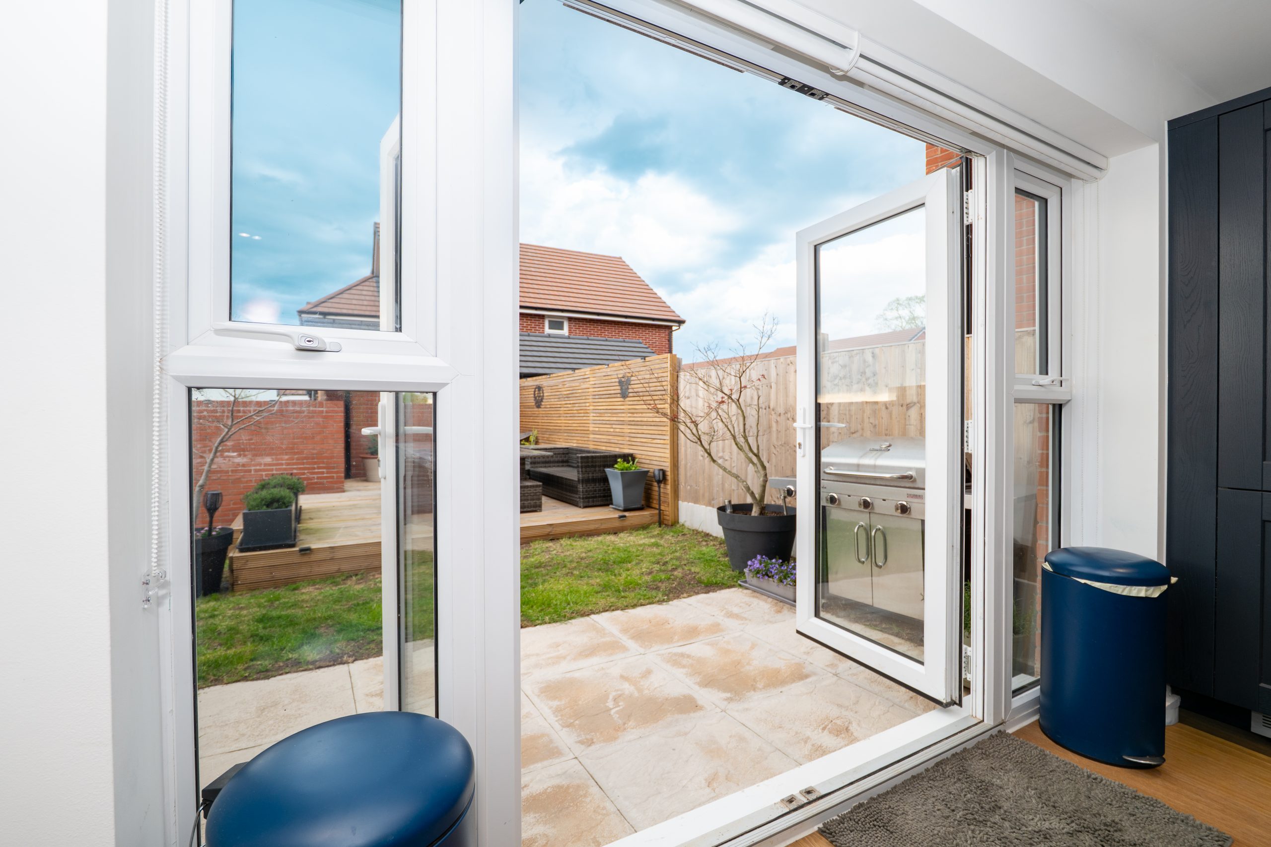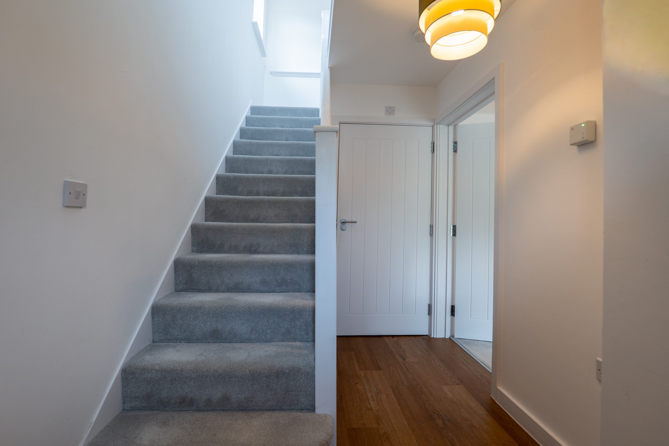 The property is entered via a south west facing front door, allowing natural light to pour into the bright and airy hallway. This welcoming space features Karndean wood effect flooring and provides access to the downstairs WC, the front facing sitting room, the staircase to the first floor and a useful understairs storage alcove. The ground floor WC is finished with the same Karndean flooring and includes a white low level WC and a wall mounted wash hand basin. The front facing sitting room enjoys a large window that floods the room with light, complemented by light grey carpeting and neutral décor. From here, a doorway leads into the stunning kitchen diner at the rear of the property. This impressive space features navy shaker style base and wall units, a central island, marble effect work surfaces, integrated dishwasher, fridge freezer, Indesit oven, induction hob and extractor fan. The Karndean flooring continues throughout, while both patio doors and a rear window provide lovely views over the garden. There is ample space for a dining table, and the kitchen also offers access to the separate utility room, which provides further appliance space and houses the Vaillant boiler.