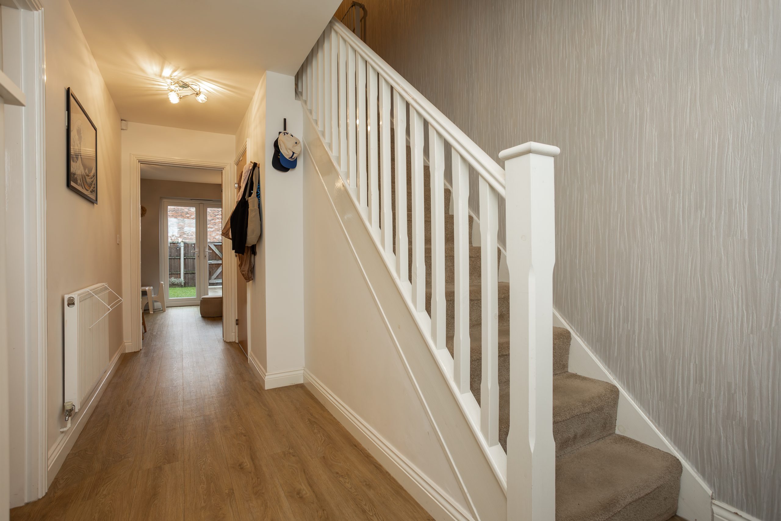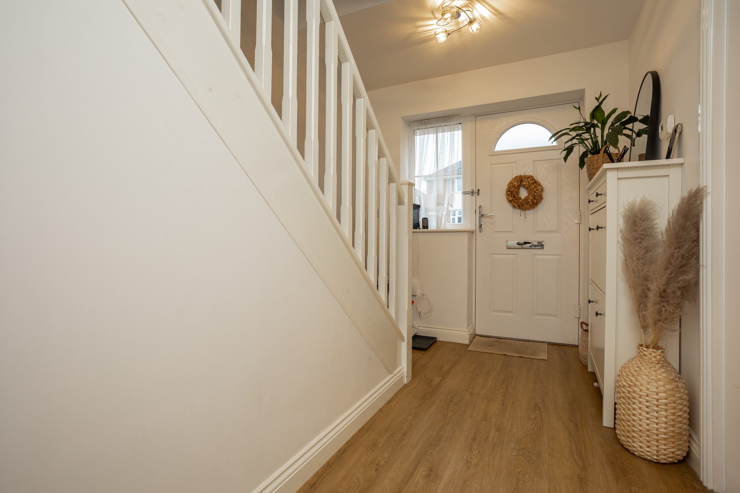Stepping through the canopied front door, you are welcomed into a bright and spacious hallway, finished with laminate flooring and a front facing window that fills the space with natural light. From here, stairs rise to the first floor, with access provided to the front kitchen/dining room, the rear lounge, a useful ground floor W.C., and an understairs storage cupboard.