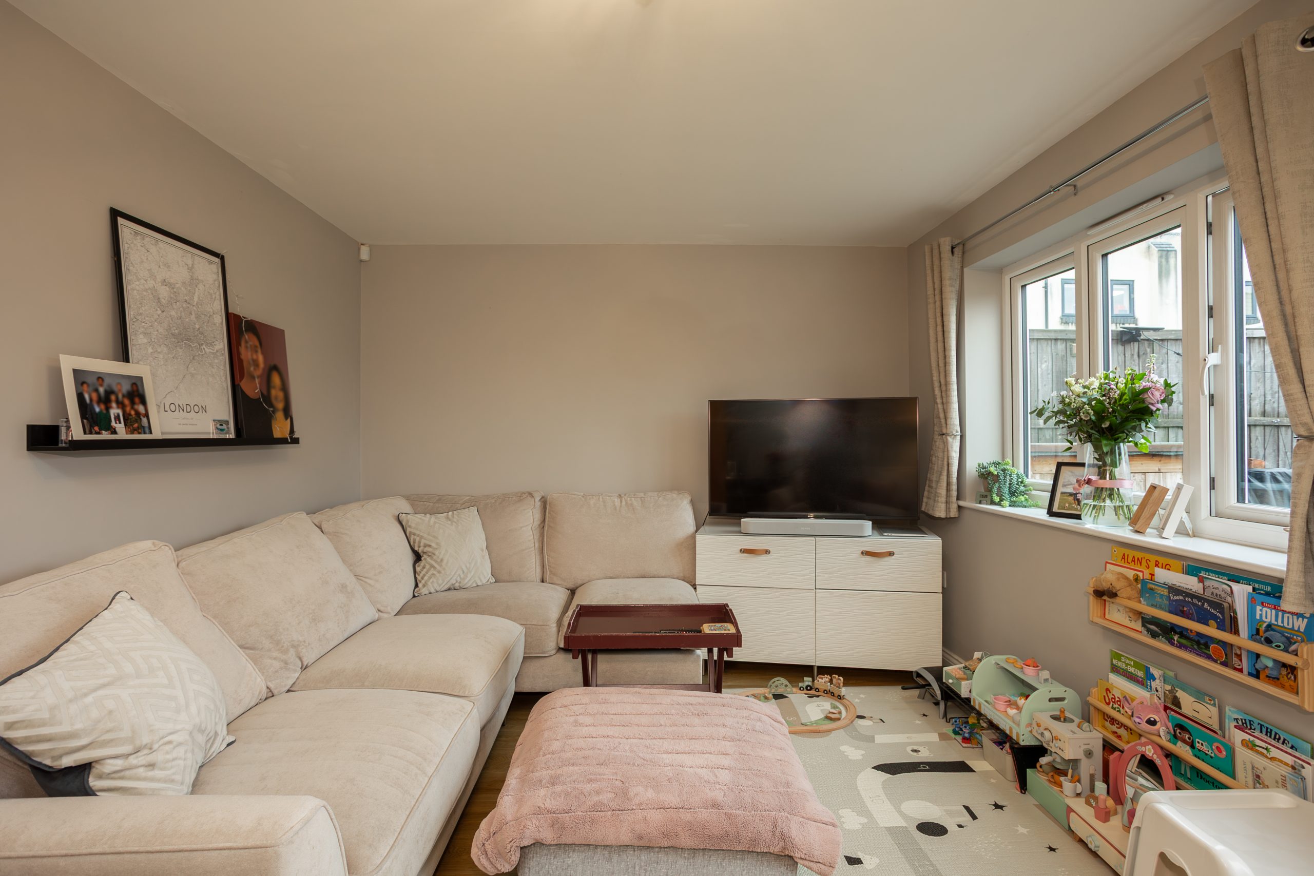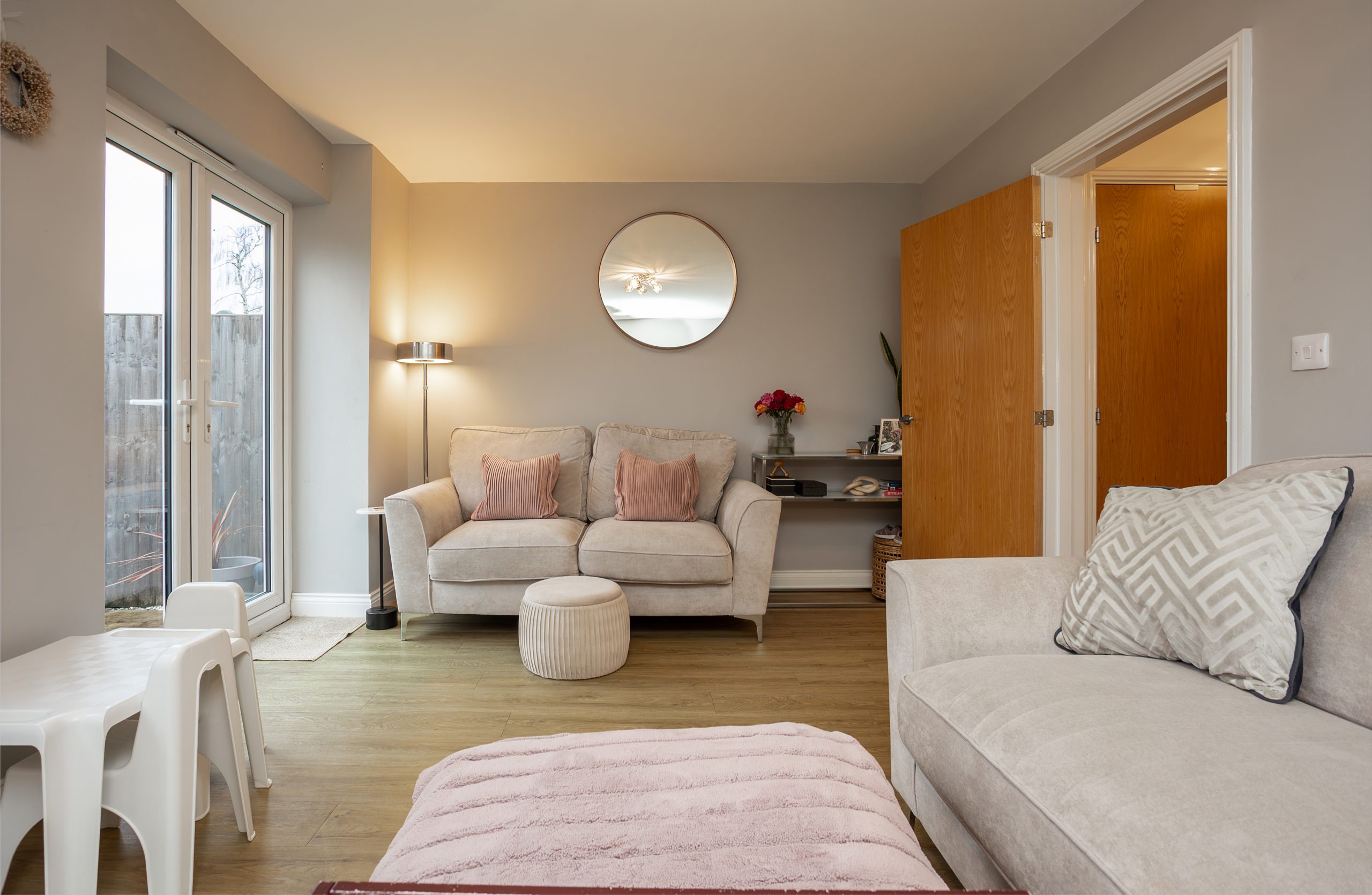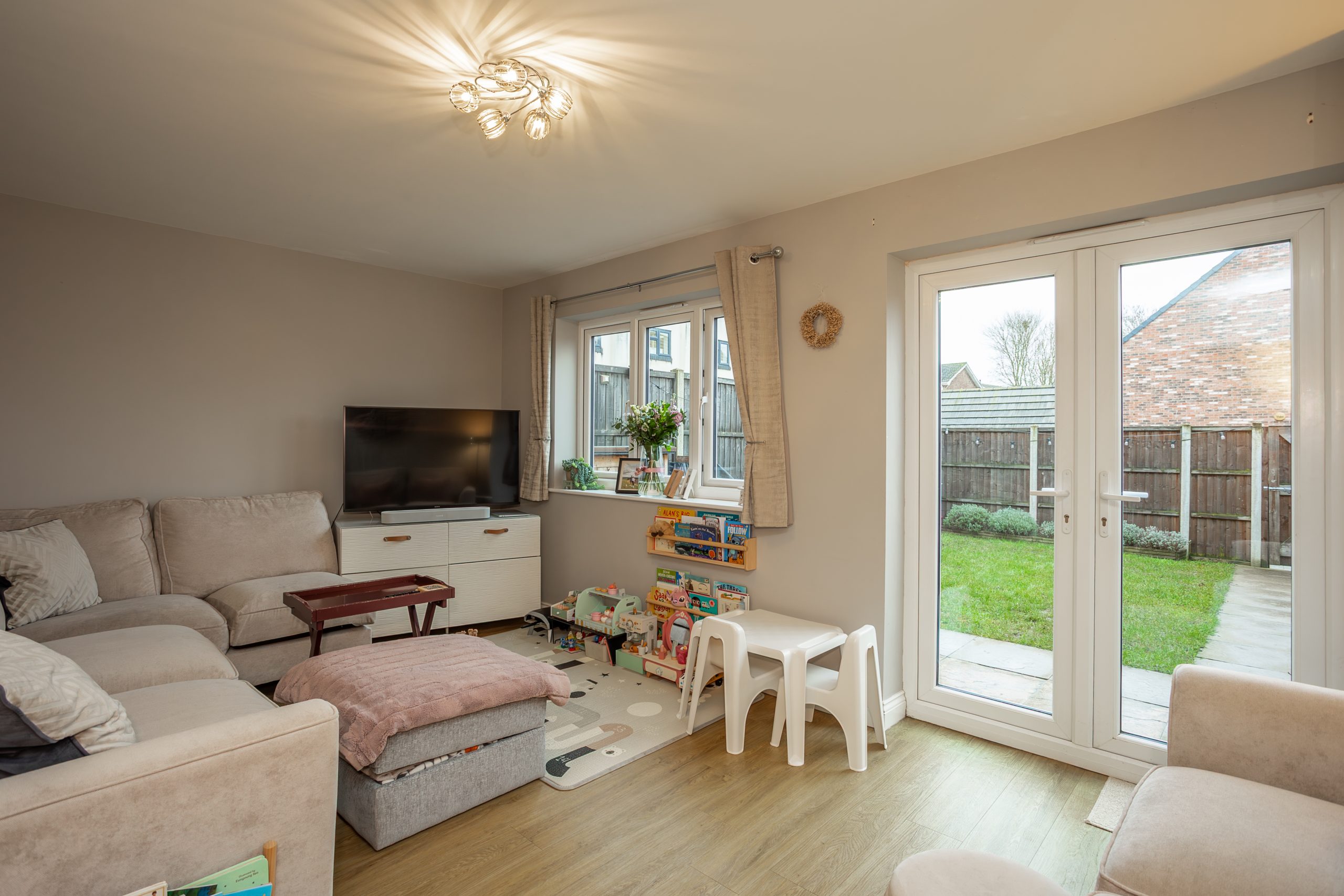 To the rear, the lounge enjoys a private outlook and an abundance of natural light thanks to a window and patio doors opening directly onto the garden. The room flows seamlessly from the hallway and kitchen, featuring laminate flooring and neutral décor to create a warm and inviting living space.
