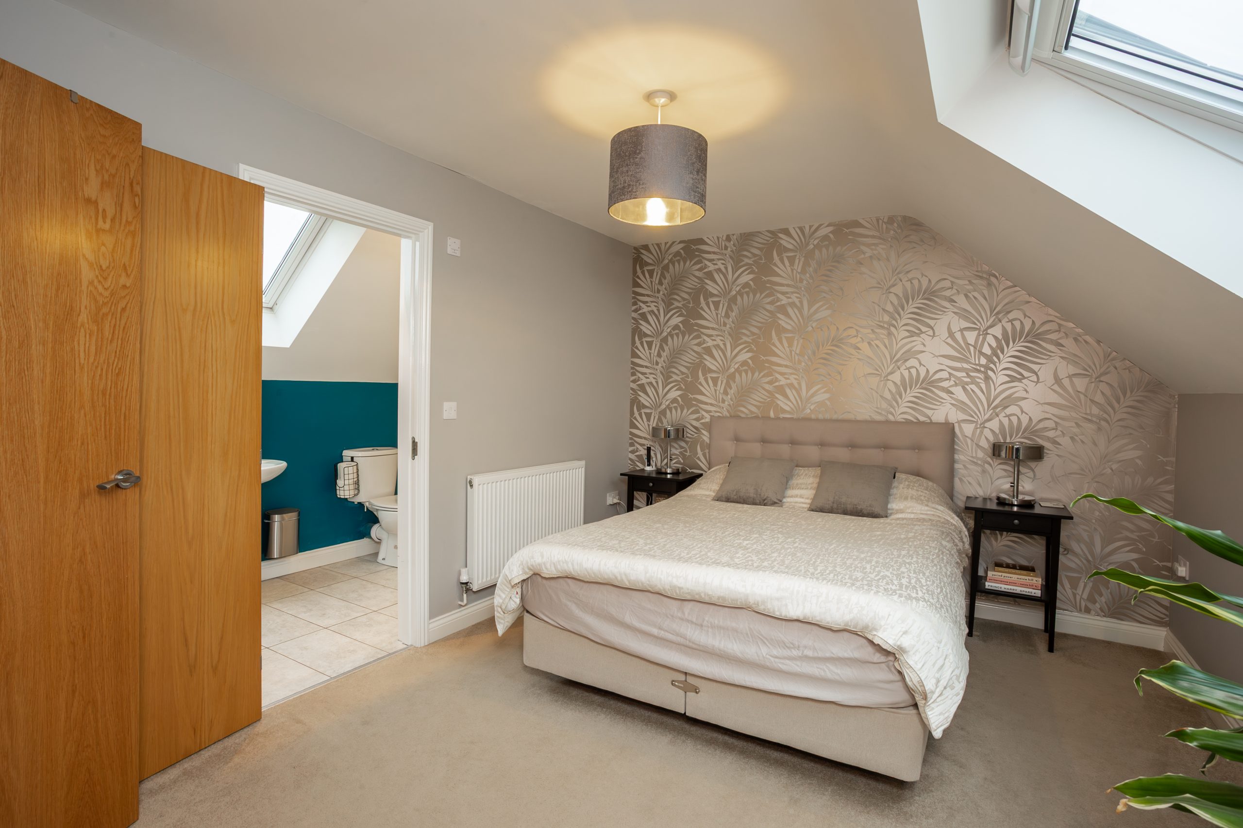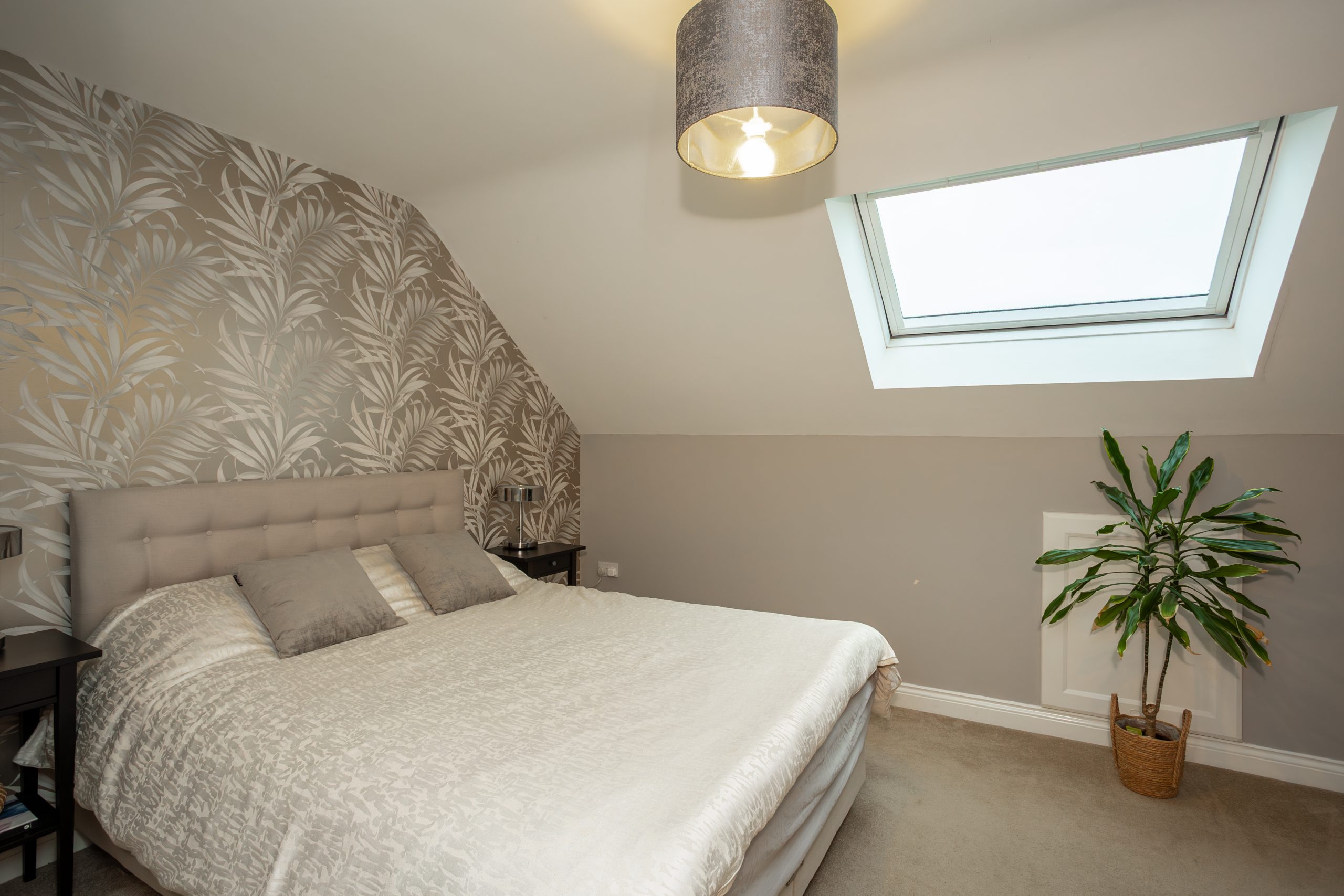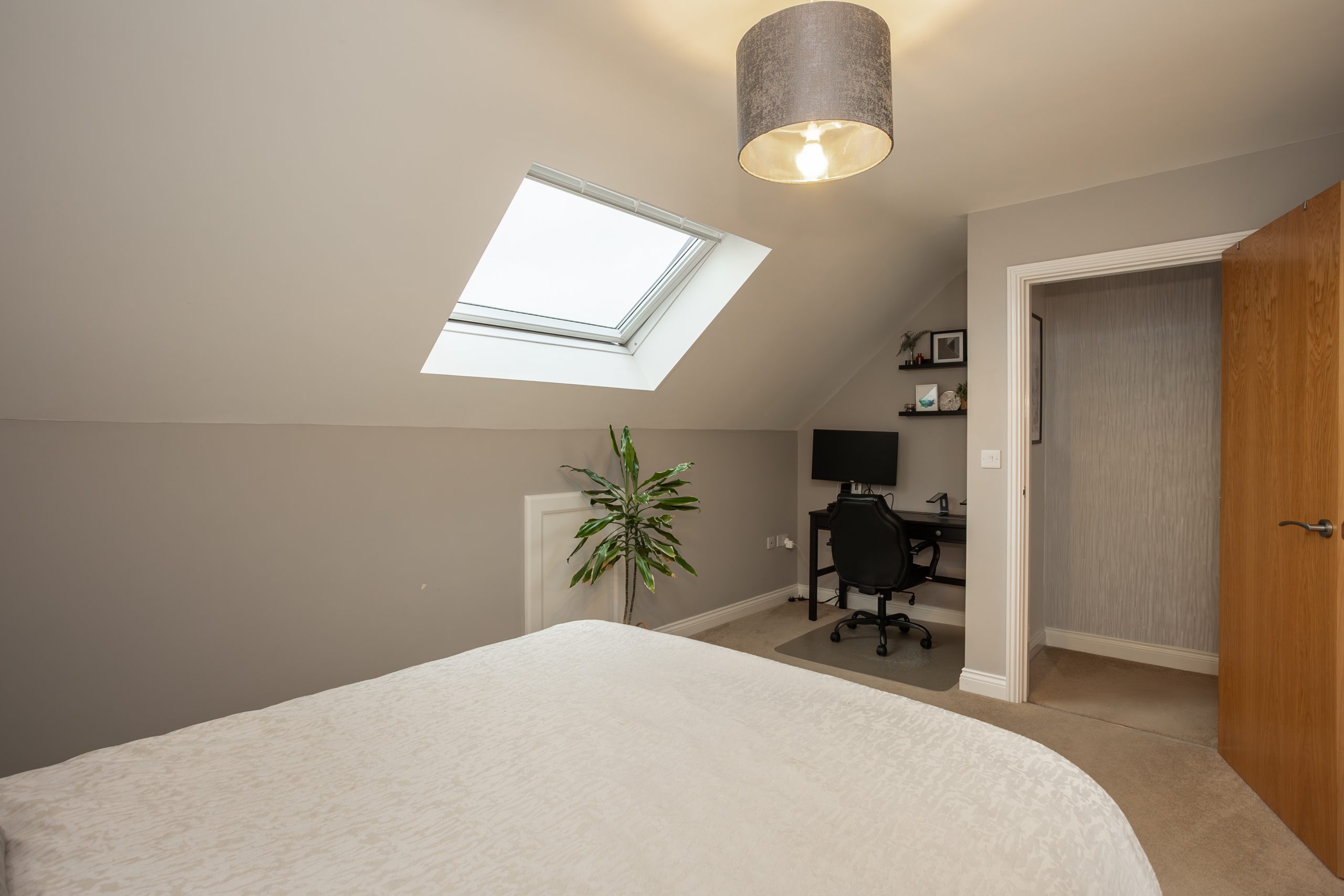 A superb top floor retreat, this impressive principal bedroom spans the full depth of the house, offering excellent privacy and a calm, loft style feel. Plenty of space for wardrobes, dressing furniture, or a cosy reading corner and plenty of natural light from the skylight window and has storage within the eaves.