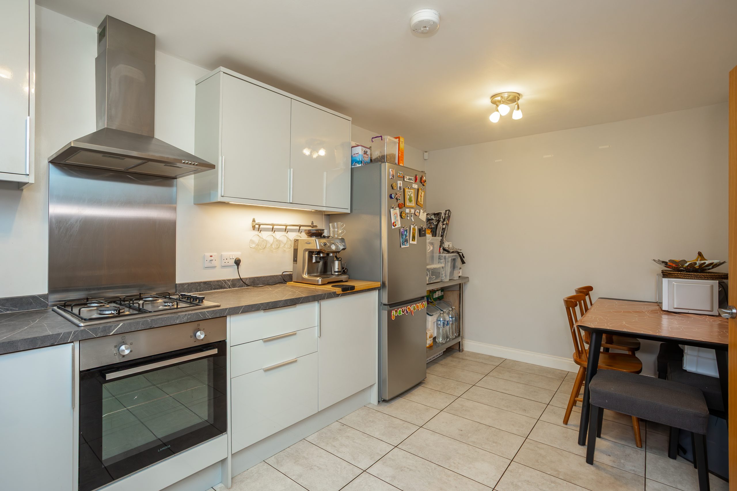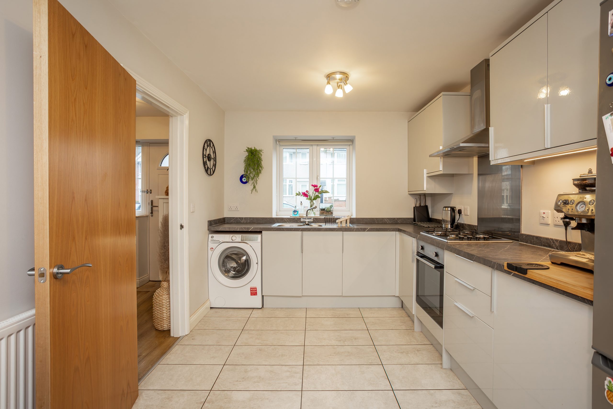 The impressive dining kitchen offers a contemporary selection of dove grey wall and base units paired with a complementary dark marble effect worktop. Integrated appliances include an oven, hob, and extractor fan, with additional space for further appliances. A tiled floor completes the look, while the front facing window provides pleasant views and space for a dining table.