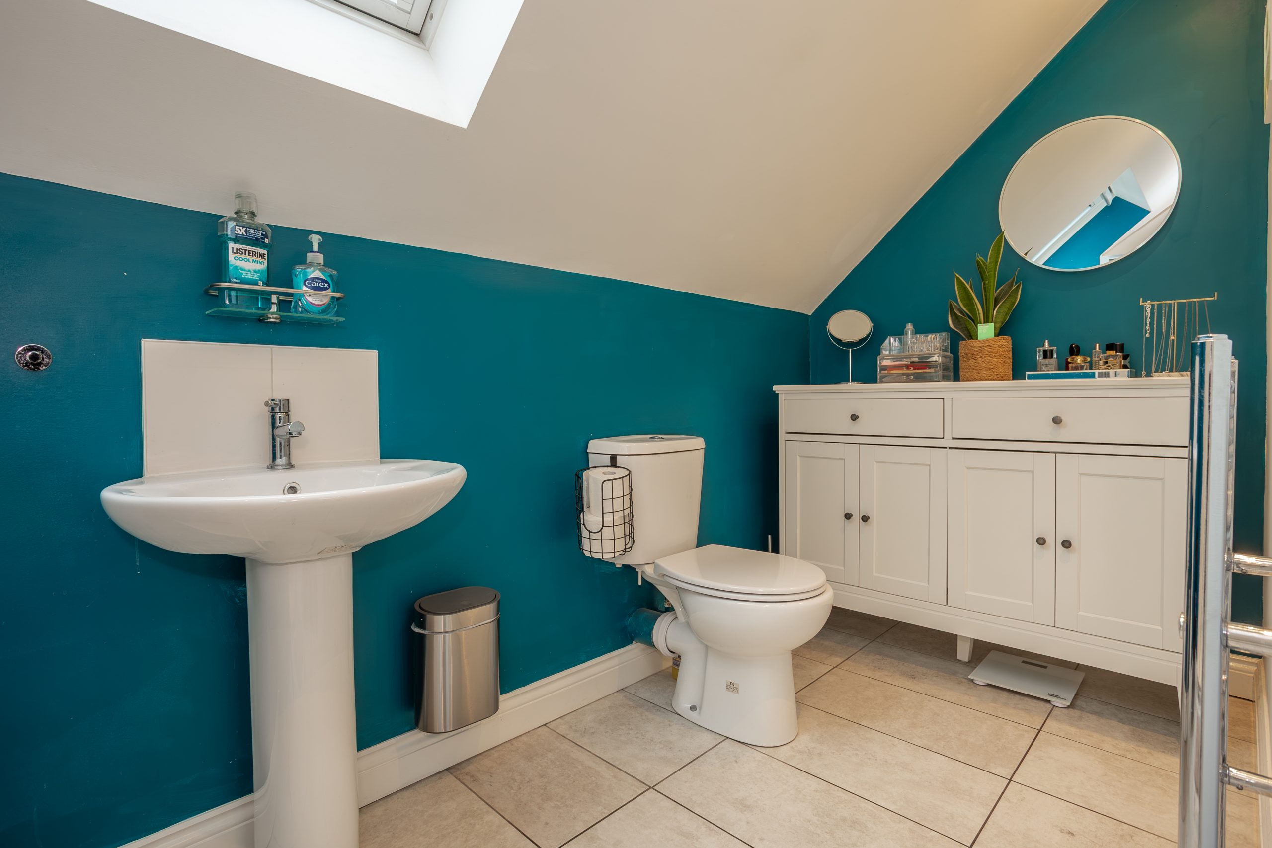 A private en suite shower room serving the top floor bedroom, creating a self contained suite ideal for owners or guests with its skylight window and tiled floor.