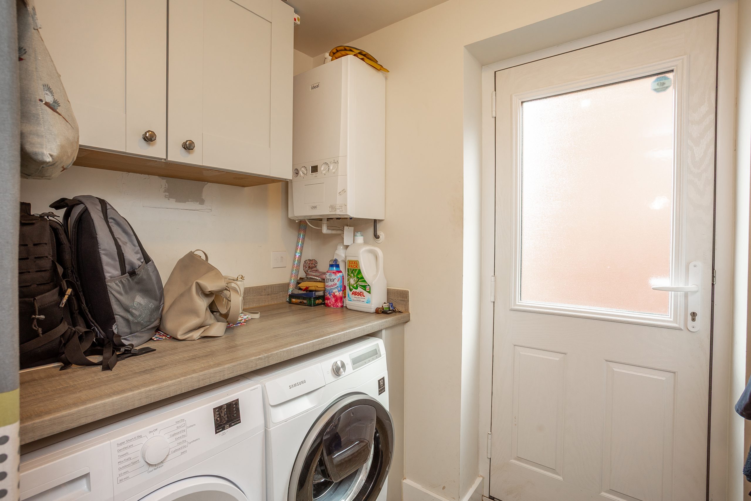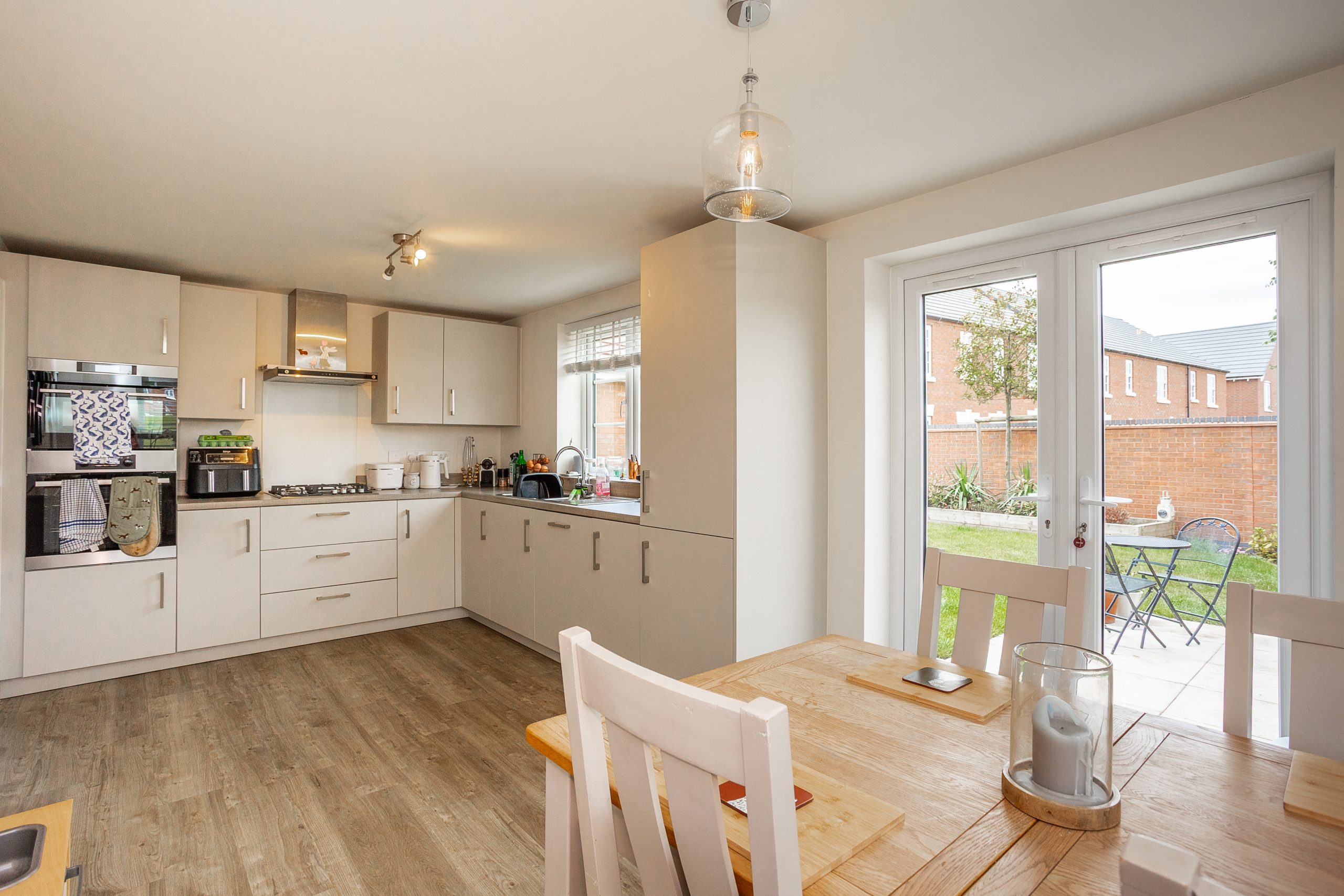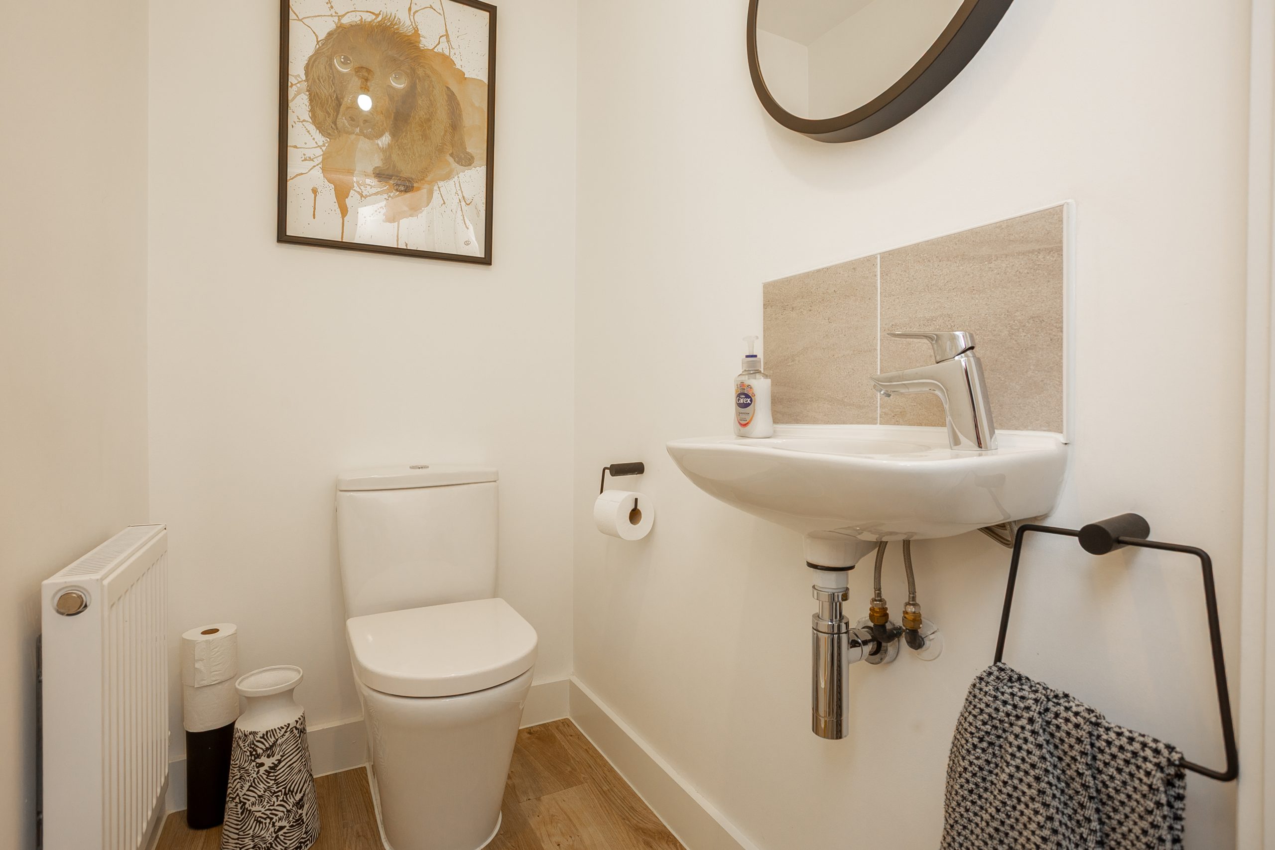 The spacious entrance hallway welcomes you into this beautifully designed home, leading to a bright and airy sitting room on the left, a convenient downstairs WC, and an impressive open-plan kitchen/dining area to the right. A staircase ascends to the first floor, ensuring a seamless flow throughout the property. The sitting room benefits from dual-aspect windows, flooding the space with natural light and enhancing its stylish, modern décor, creating a warm and inviting atmosphere. The downstairs WC features a sleek white low-level WC and wash hand basin, complemented by neutral, contemporary styling. The open-plan kitchen/dining area is a true highlight, boasting dual-aspect windows with stunning views overlooking the park and patio doors that open onto a beautifully private, non-overlooked rear garden. The kitchen is fitted with a range of elegant light grey wall and base units, complemented by a stylish worktop and high-quality integrated appliances, including a double oven, hob, extractor fan, dishwasher, and fridge freezer. A separate utility area provides additional space for appliances, houses the boiler, provides further handy understairs storage and offers direct access to the rear garden, ensuring practicality and efficiency for modern family living.