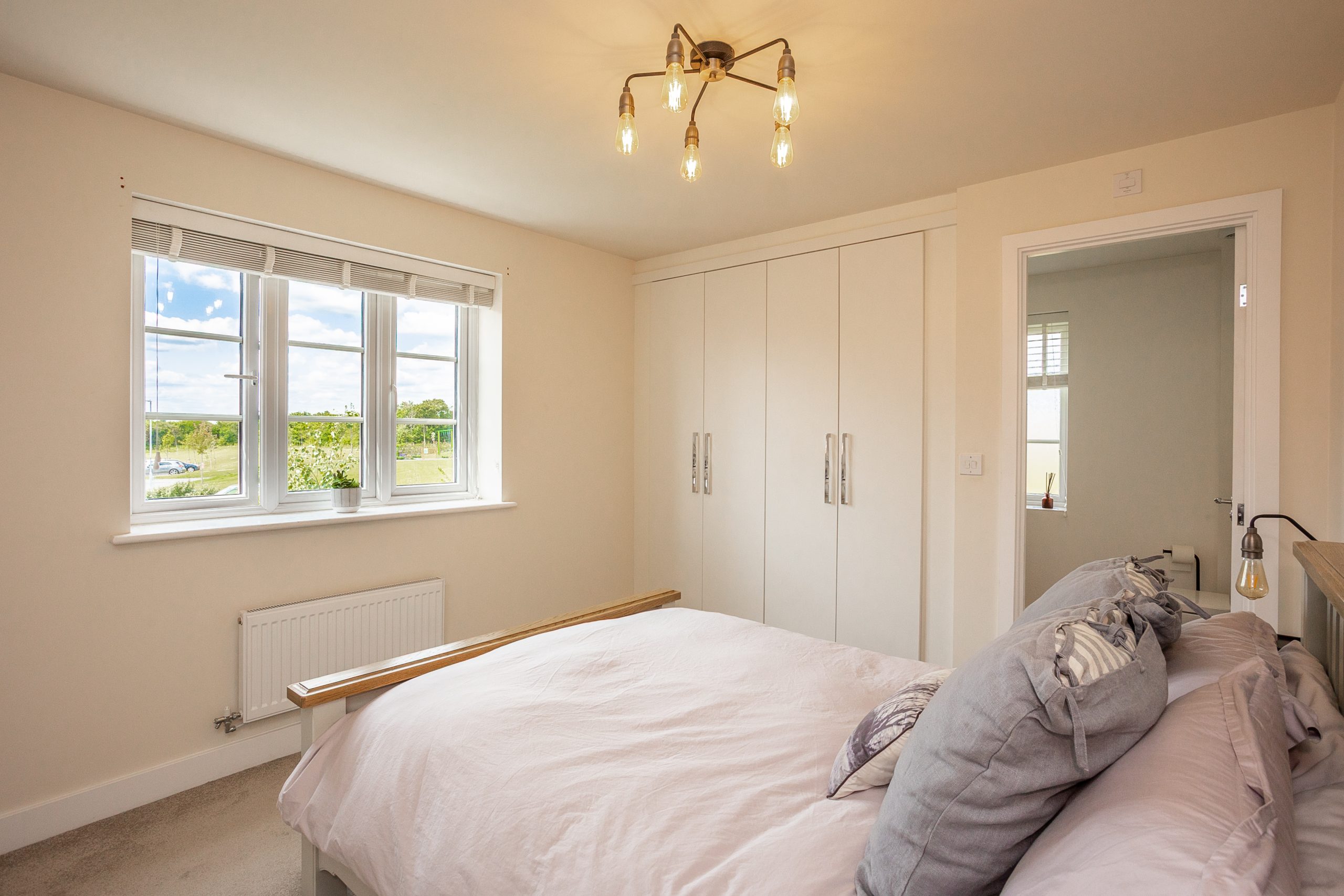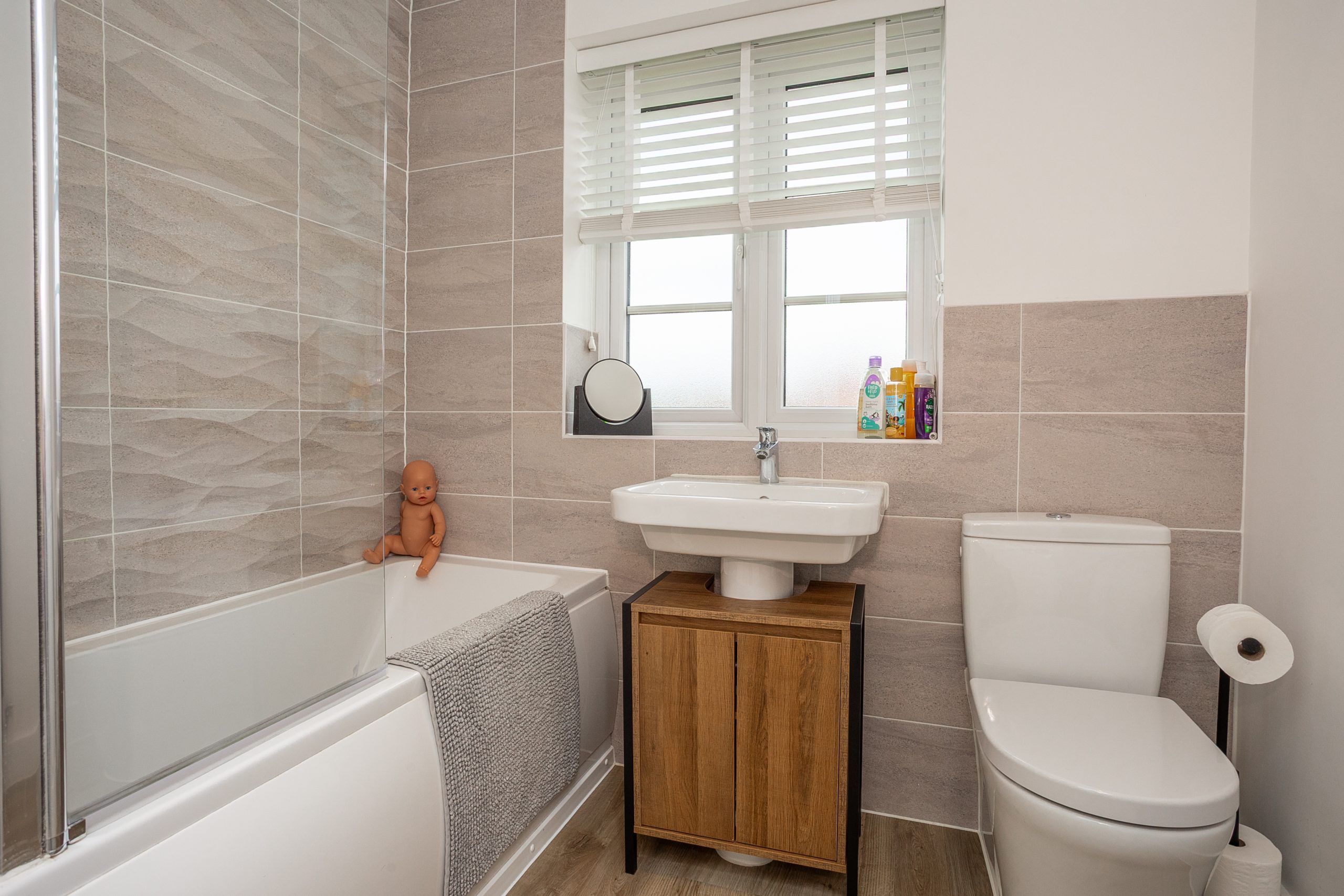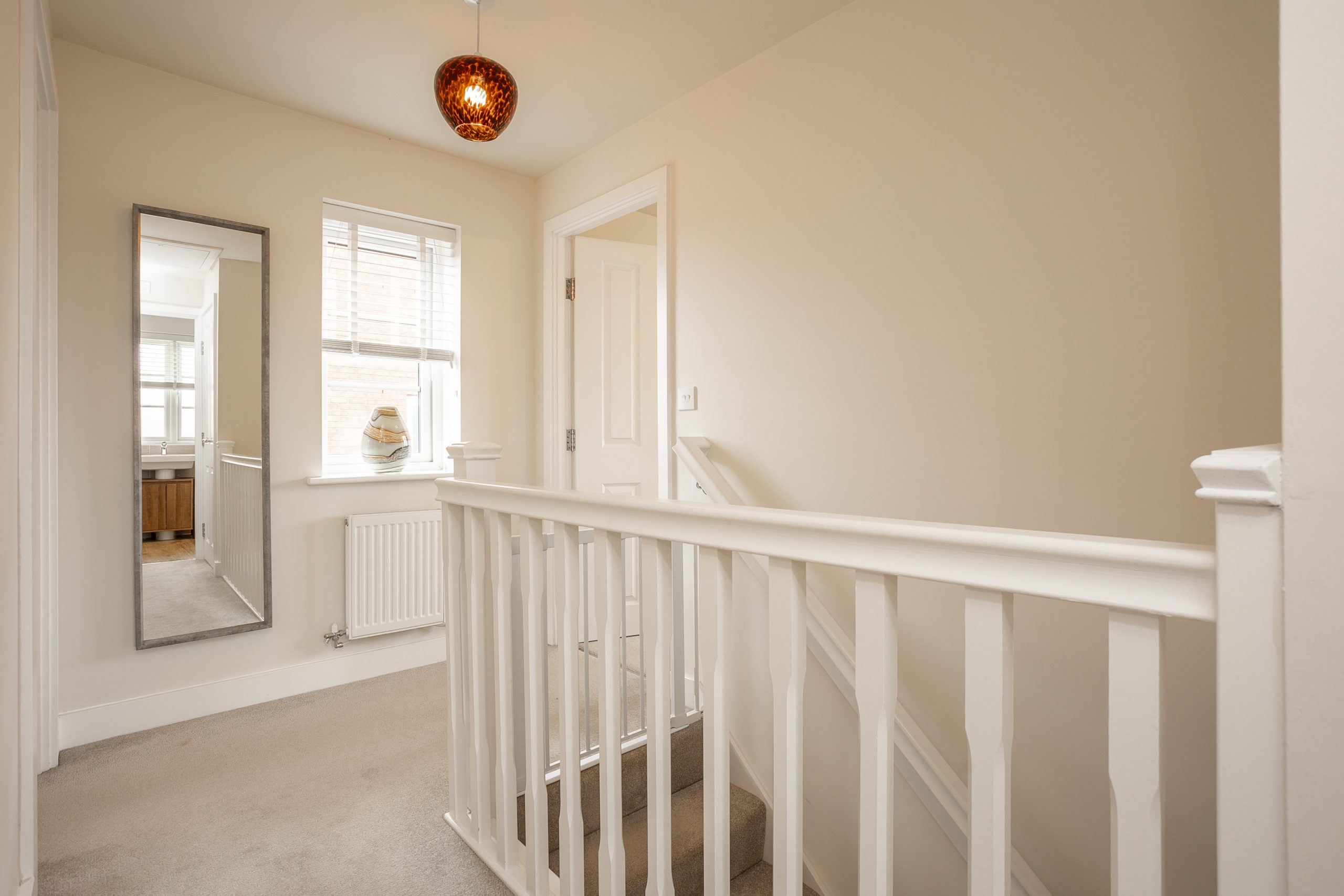 The first-floor landing provides access to three generously sized bedrooms, a beautifully presented family bathroom, a handy storage cupboard, and loft access, while a well-placed window fills the space with natural light. The primary bedroom enjoys picturesque views overlooking the park and benefits from a stylish ensuite, featuring a walk-in shower, low-level WC, and wash hand basin, all designed for modern comfort. The second and third bedrooms are both spacious, with neutral modern décor, offering versatility and an inviting atmosphere. The family bathroom is elegantly finished, featuring a white three-piece suite, including a low-level WC, a vanity unit with wash hand basin, and a bath with an overhead shower and screen. Contemporary grey wall tiles and wood-effect flooring complete the space, adding a sleek and sophisticated touch.