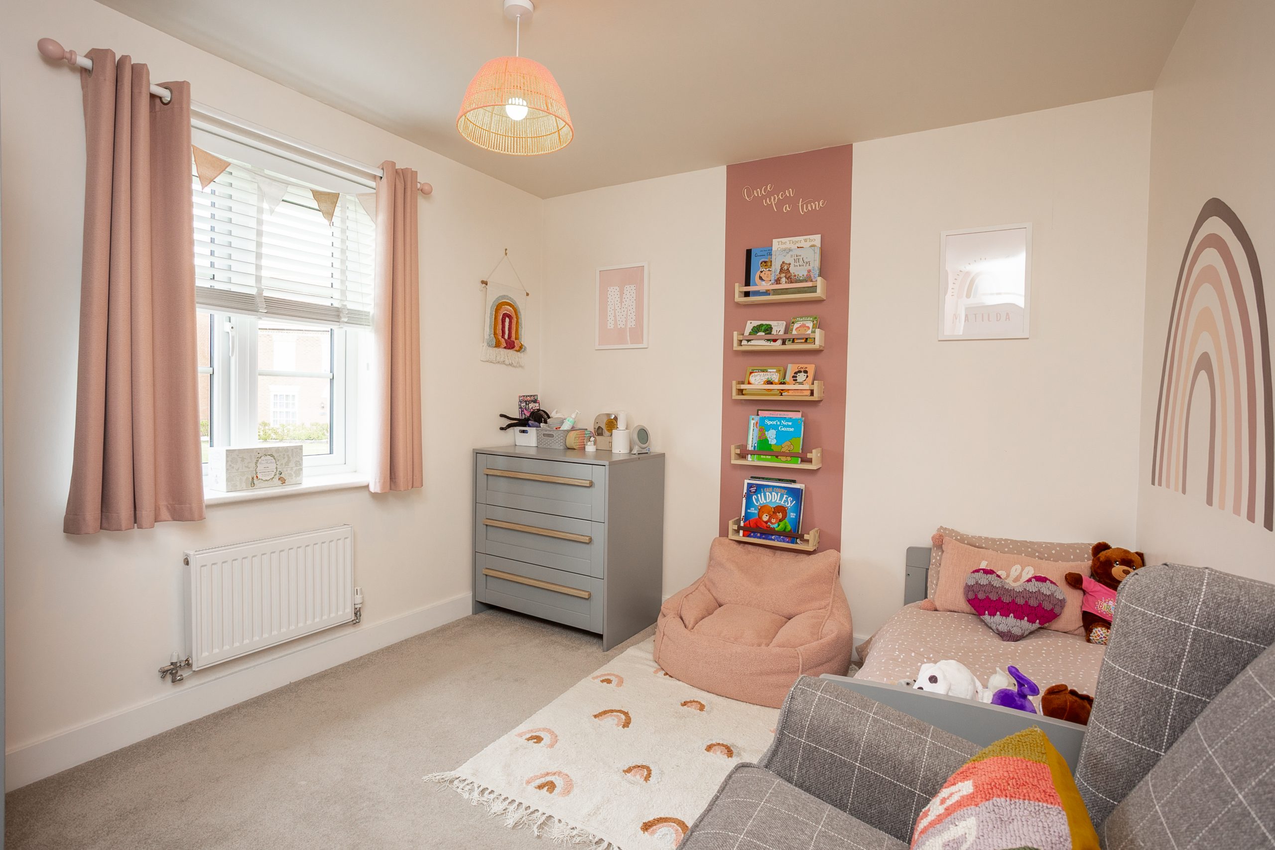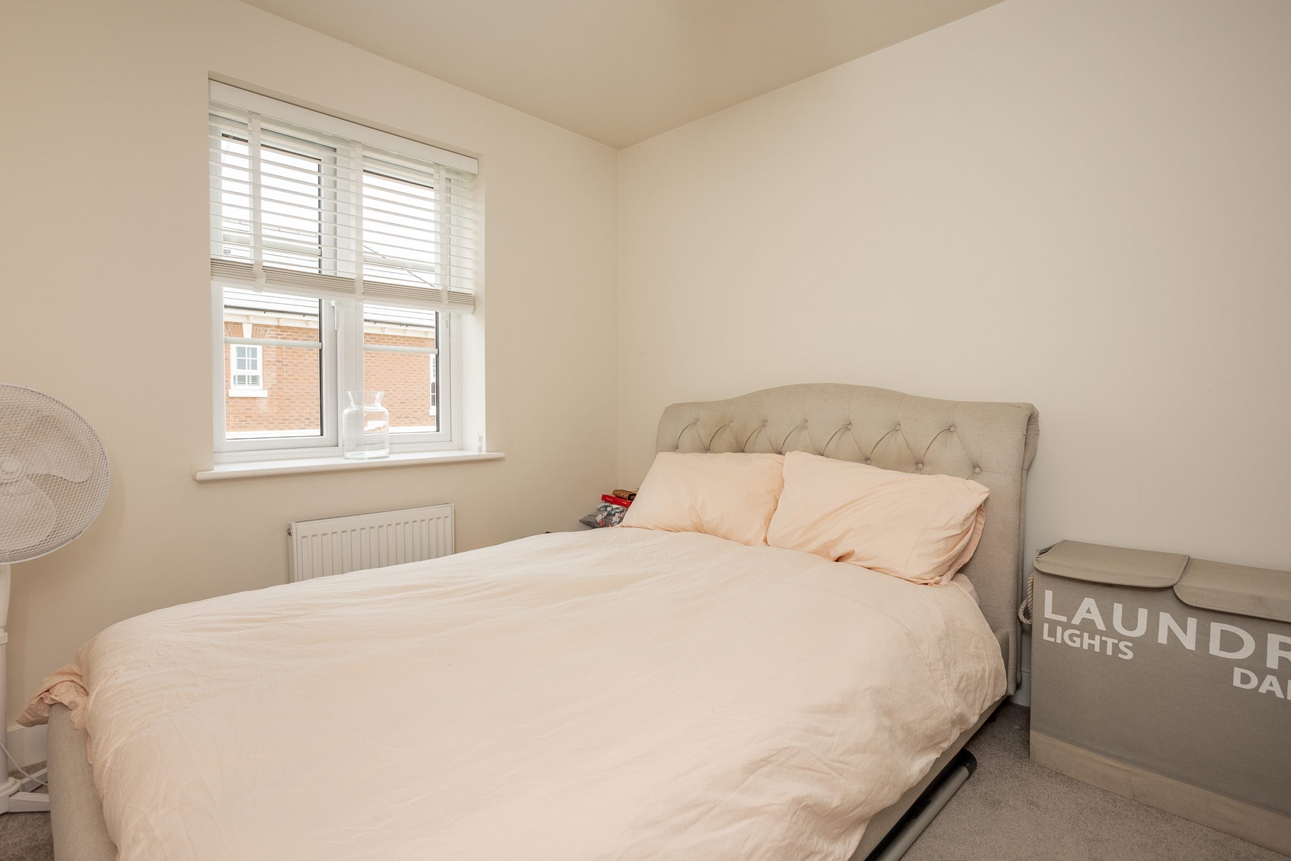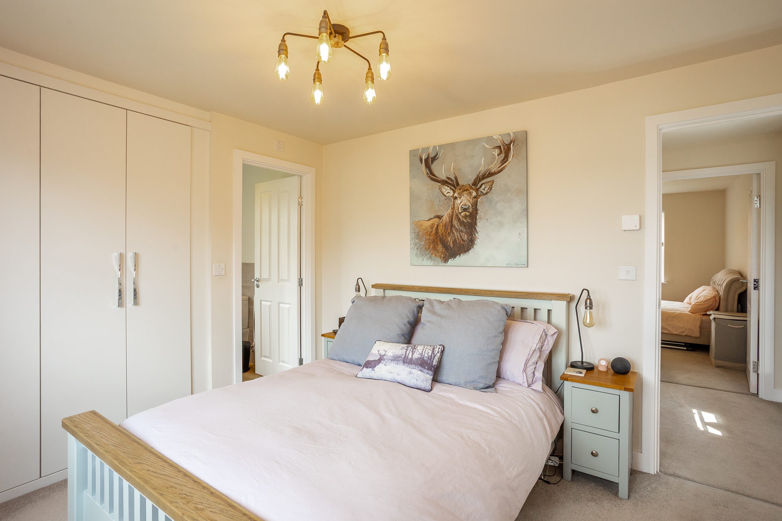 The first-floor landing provides access to three generously sized bedrooms, a beautifully presented family bathroom, a handy storage cupboard, and loft access, while a well-placed window fills the space with natural light. The primary bedroom enjoys picturesque views overlooking the park and benefits from a stylish ensuite, featuring a walk-in shower, low-level WC, and wash hand basin, all designed for modern comfort. The second and third bedrooms are both spacious, with neutral modern décor, offering versatility and an inviting atmosphere. The family bathroom is elegantly finished, featuring a white three-piece suite, including a low-level WC, a vanity unit with wash hand basin, and a bath with an overhead shower and screen. Contemporary grey wall tiles and wood-effect flooring complete the space, adding a sleek and sophisticated touch.