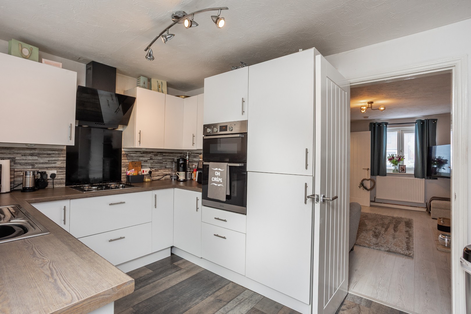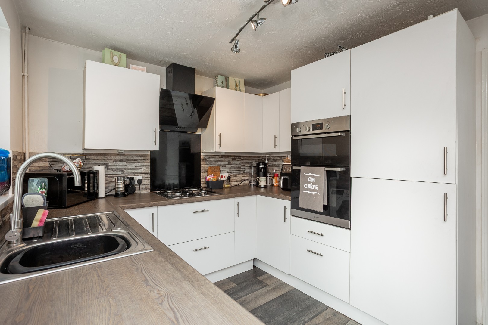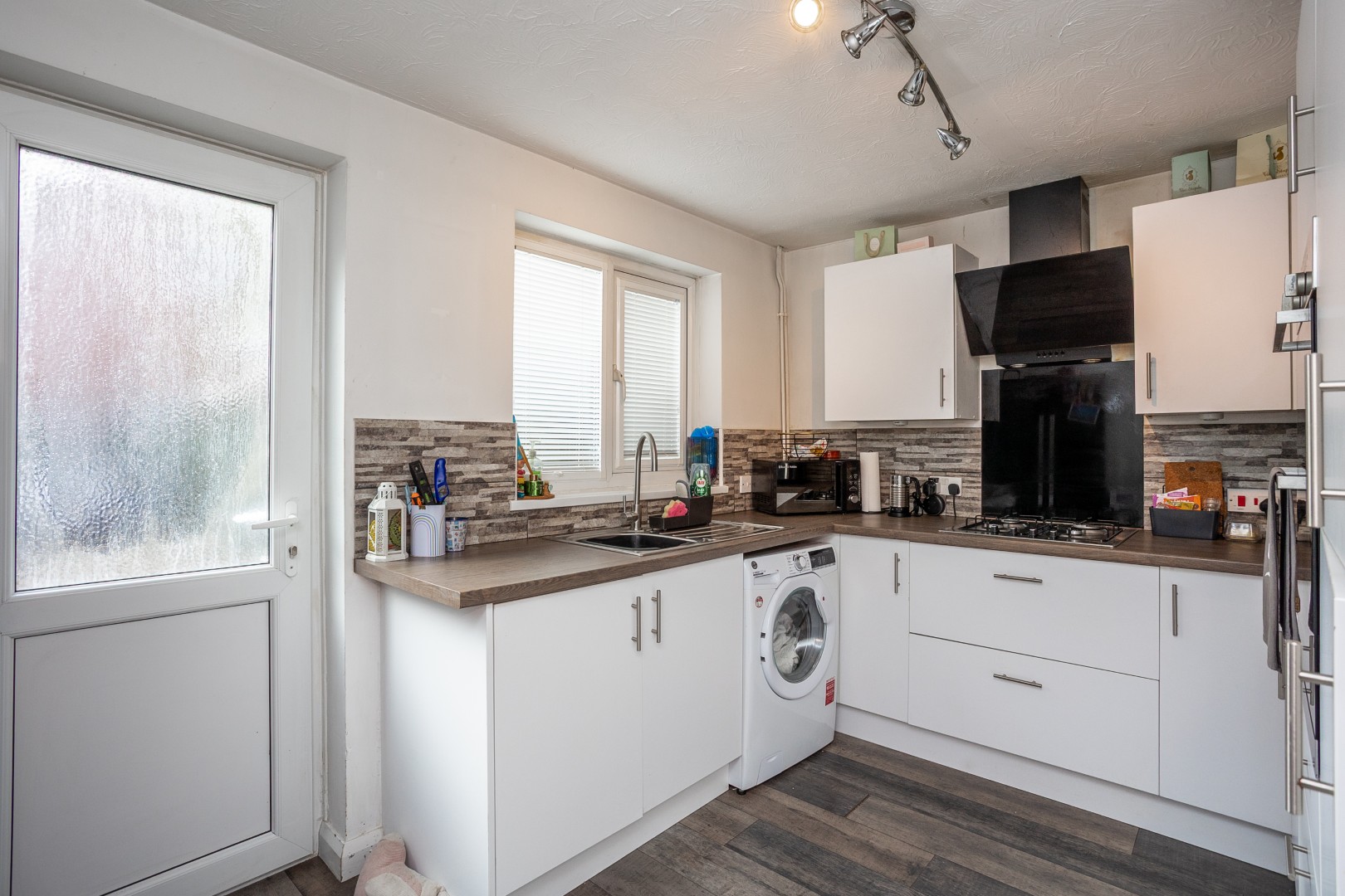 To the rear of the property is a bright and airy breakfast kitchen, overlooking the garden. The kitchen is fitted with contemporary white cabinetry, complemented by sleek worktops and a stylish tiled splashback. It is equipped with integrated appliances including an oven, gas hob, and stainless-steel extractor fan, ensuring modern convenience. There is ample space for a washing machine and fridge/freezer, catering to everyday needs. A door from the kitchen provides direct access to the rear garden, facilitating outdoor dining and easy outdoor access.
