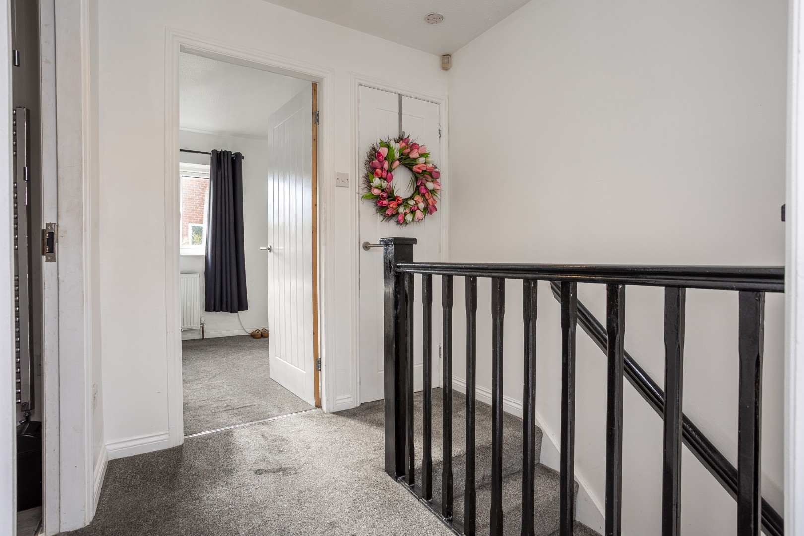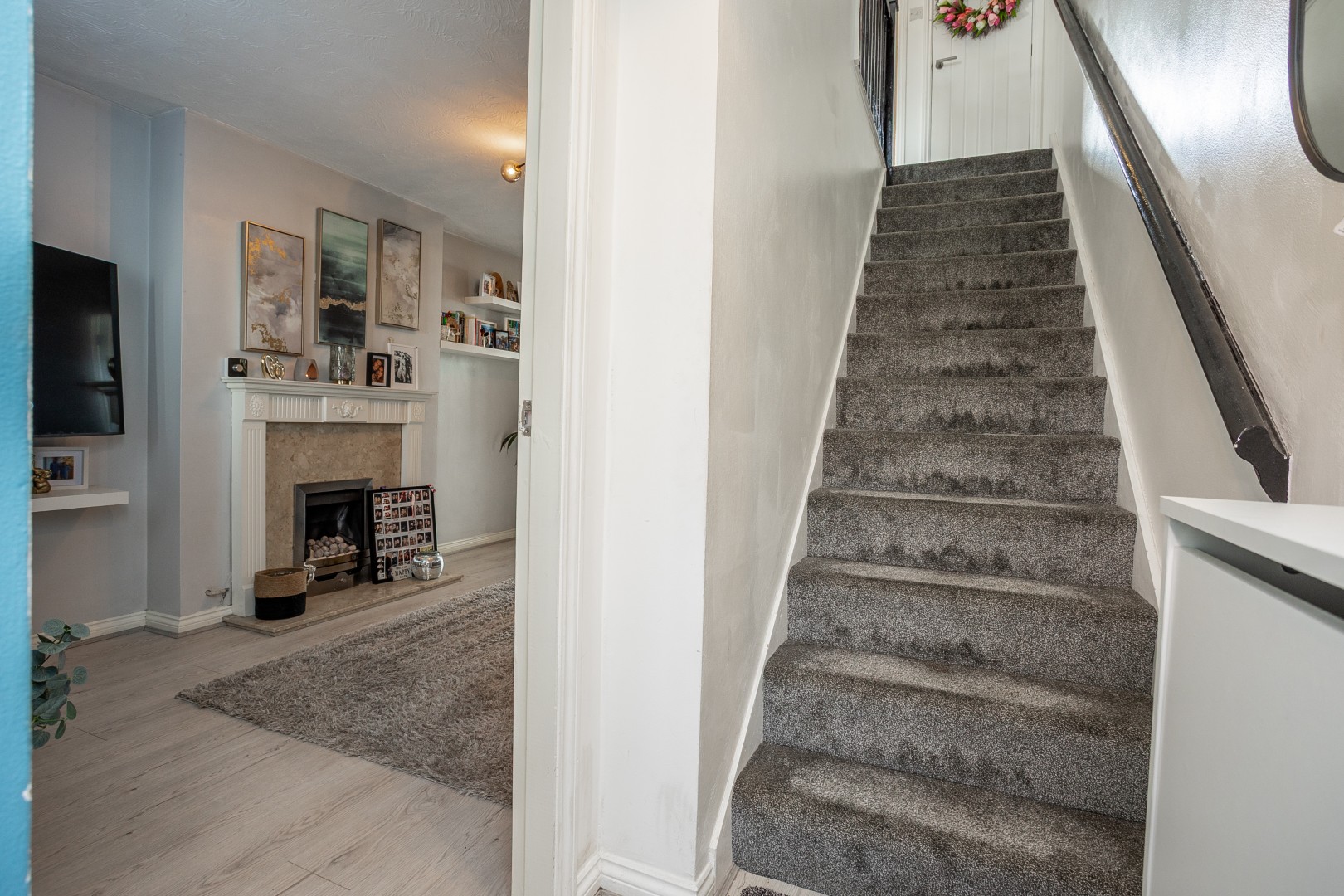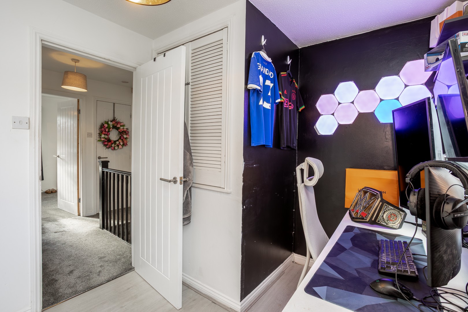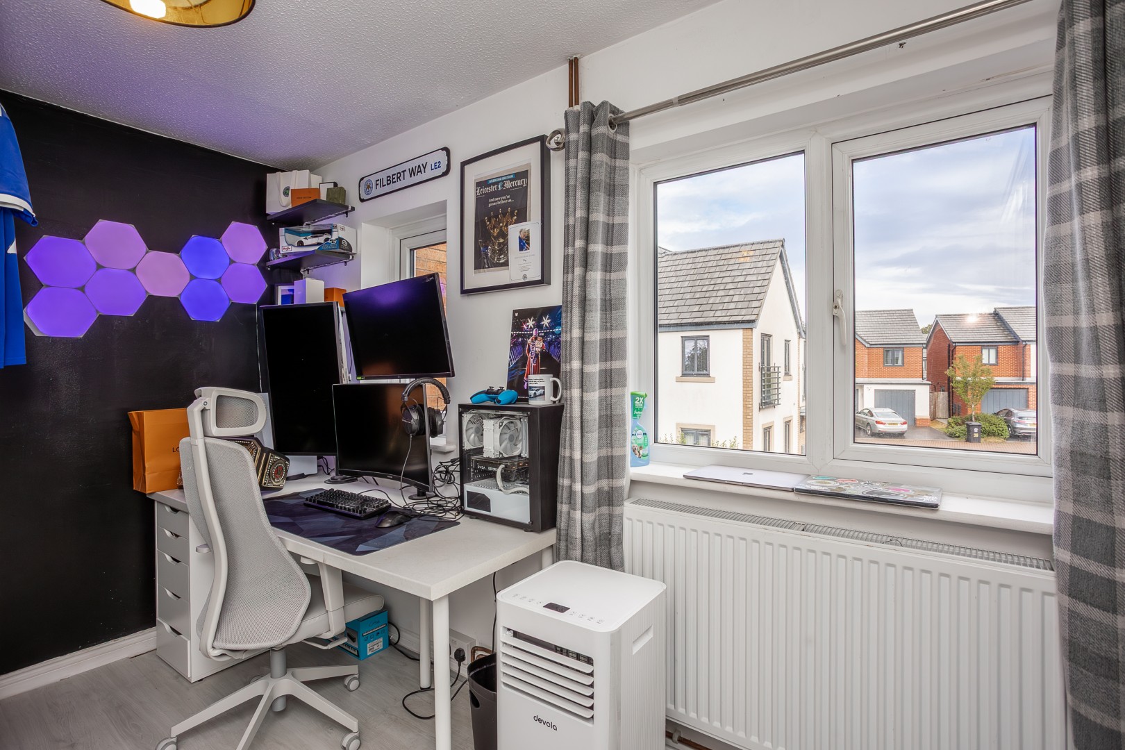 A staircase from the hallway leads to the first-floor landing, which provides access to the main bedroom overlooking the rear garden. The second bedroom, located at the front of the home, is currently utilised as a versatile study or home office, offering flexible space for modern living.