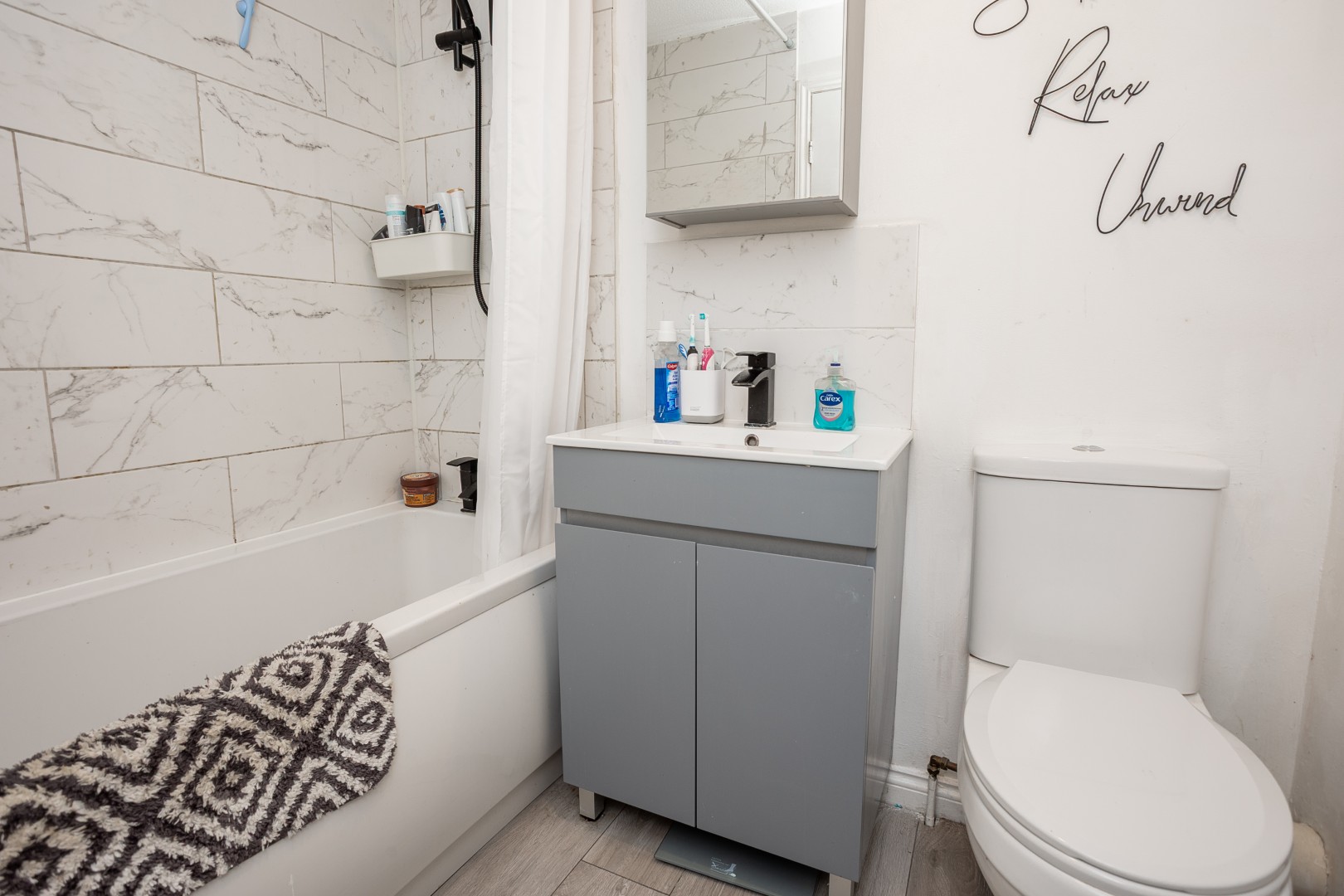 The family bathroom has been thoughtfully refitted to feature a contemporary suite comprising a bathtub with a shower over, a WC, and a wash hand basin with a vanity cupboard. The space is finished with elegant marble effect tiling and oak-effect flooring, enhancing its modern aesthetic and functionality.