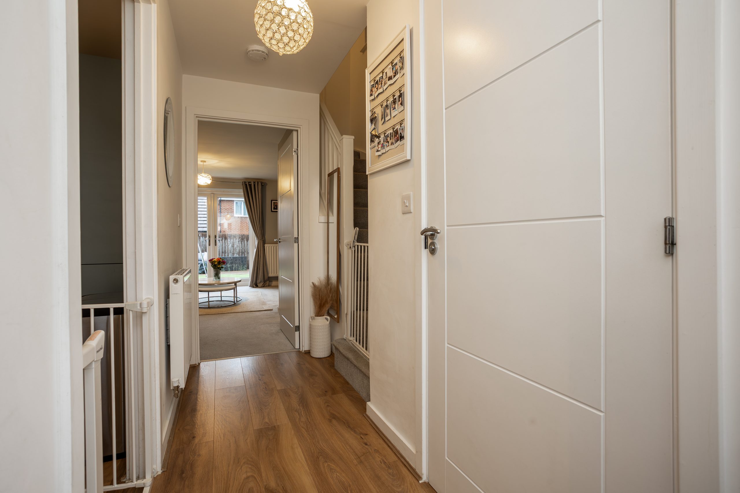 The property is entered via a welcoming hallway with laminate flooring, giving access to the downstairs WC, the front facing kitchen, the staircase to the first floor, and the spacious lounge/diner at the rear.