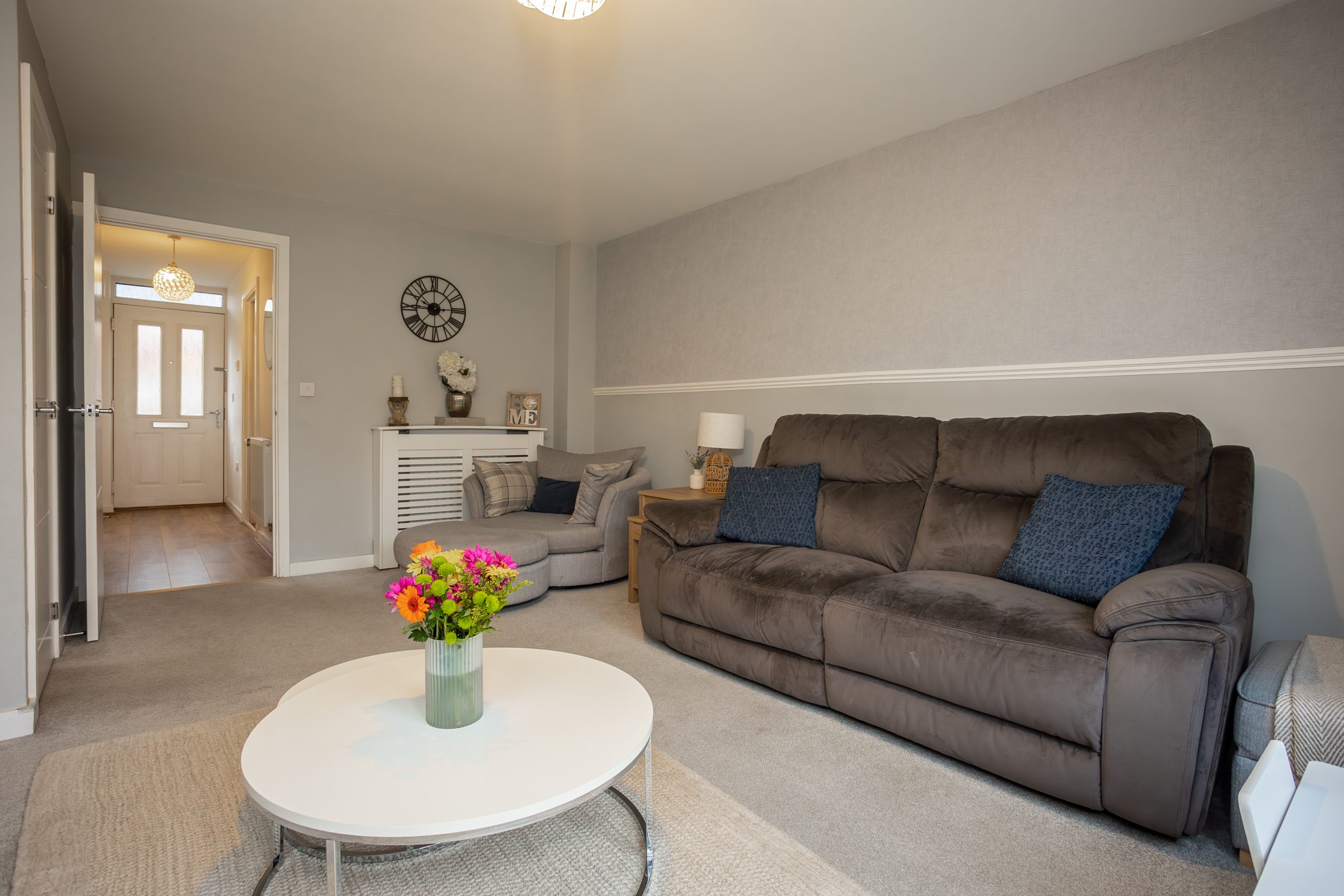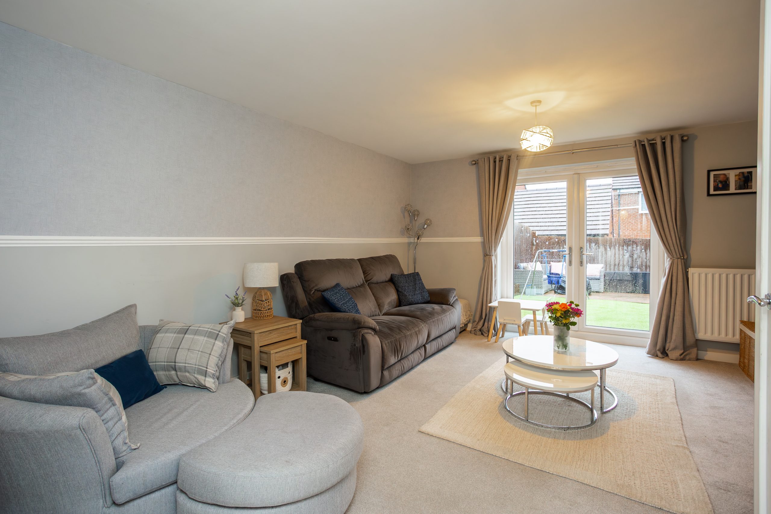 The generous lounge/diner enjoys plenty of natural light thanks to the patio doors opening onto the rear garden. It also features a decorative dado rail, well-maintained grey carpeting and a useful under stairs cupboard for additional storage.