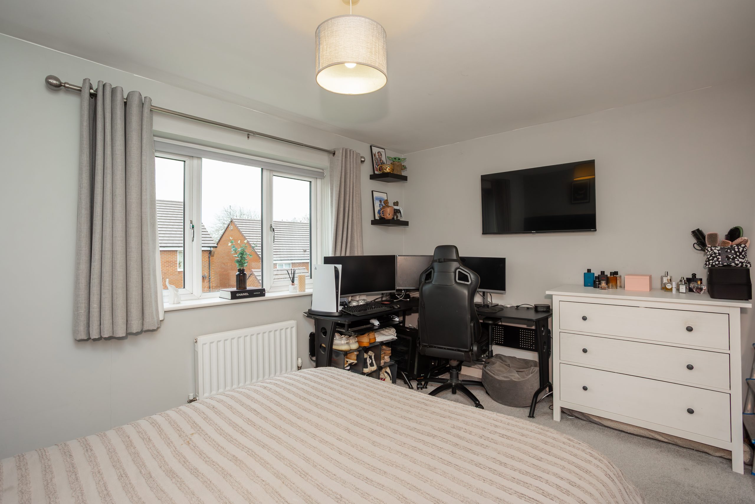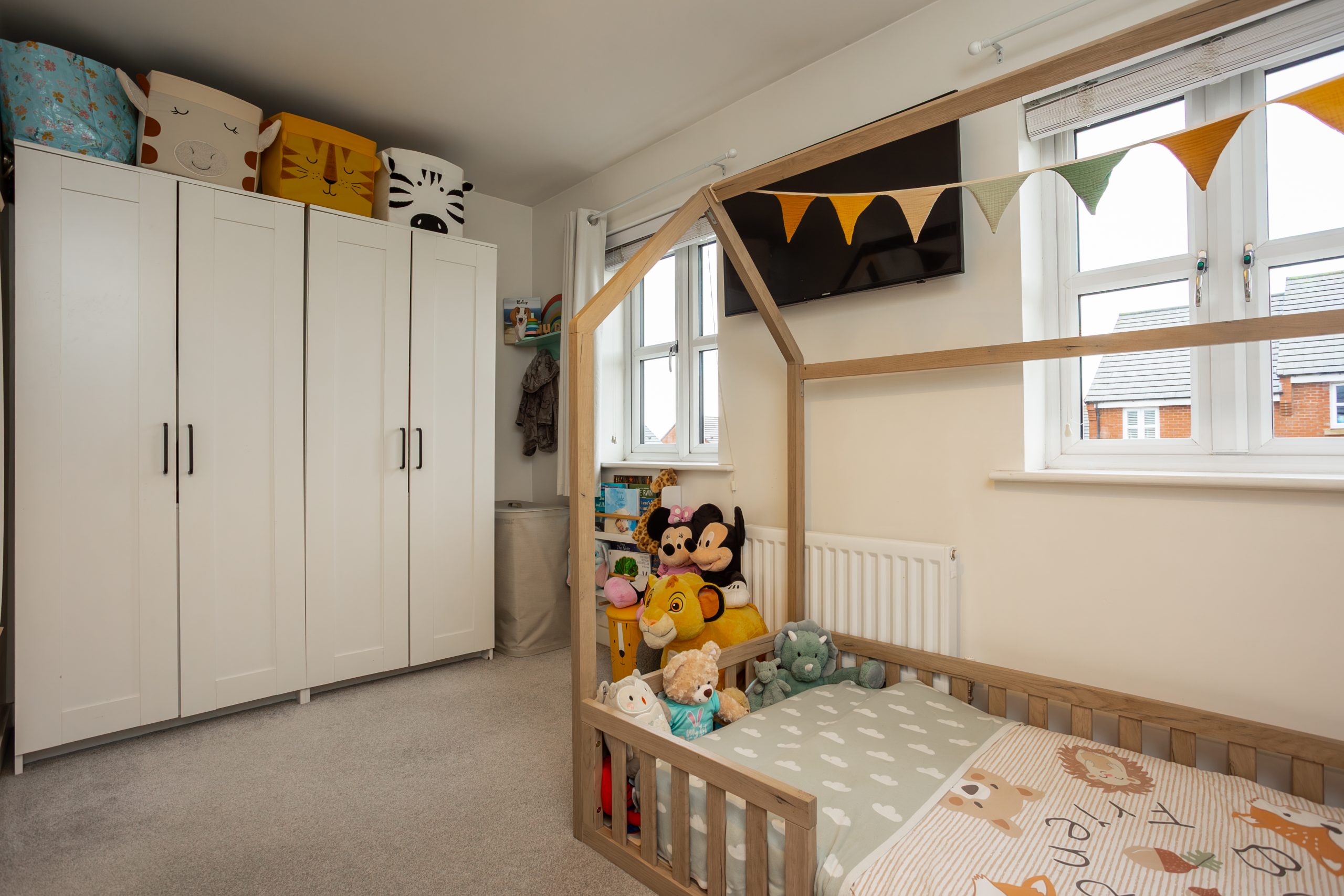 Bedroom two is of near equal proportions and sits at the front of the home. It offers two windows overlooking the front elevation, useful storage over the stairs, and the same grey carpet for a cohesive finish.