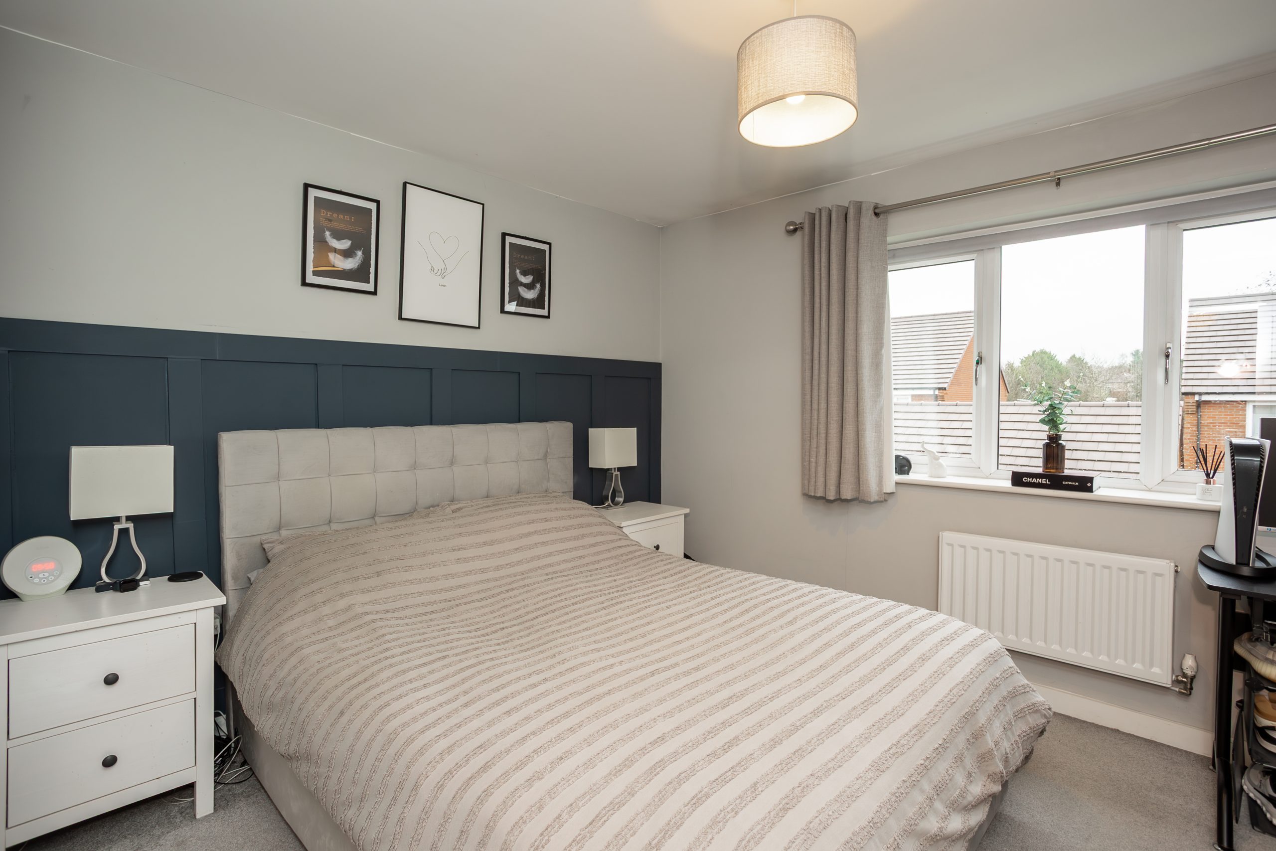 The primary bedroom is a generous double positioned at the rear of the property, enjoying pleasant views over the garden. It features attractive wall panelling and well maintained grey carpeting.
