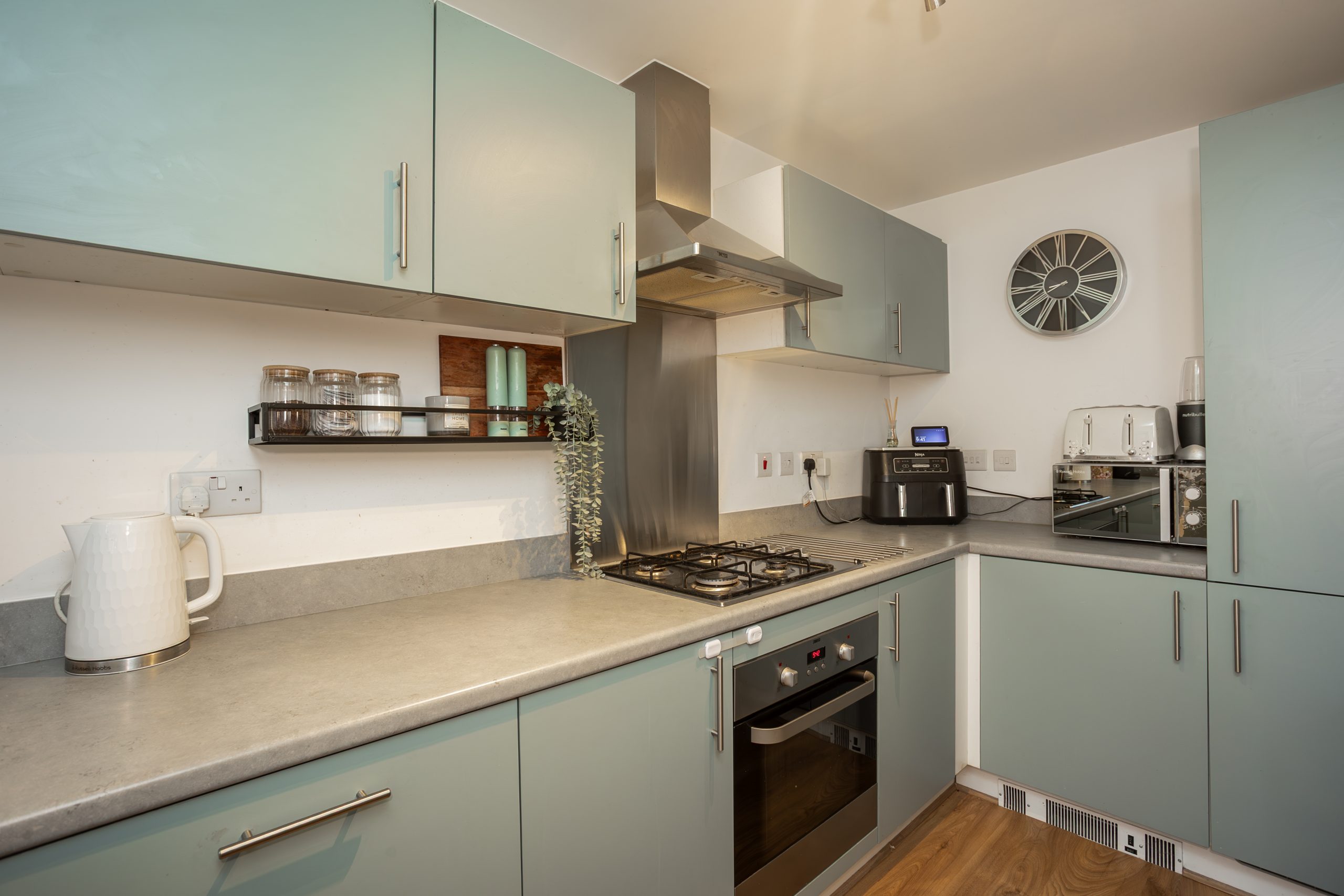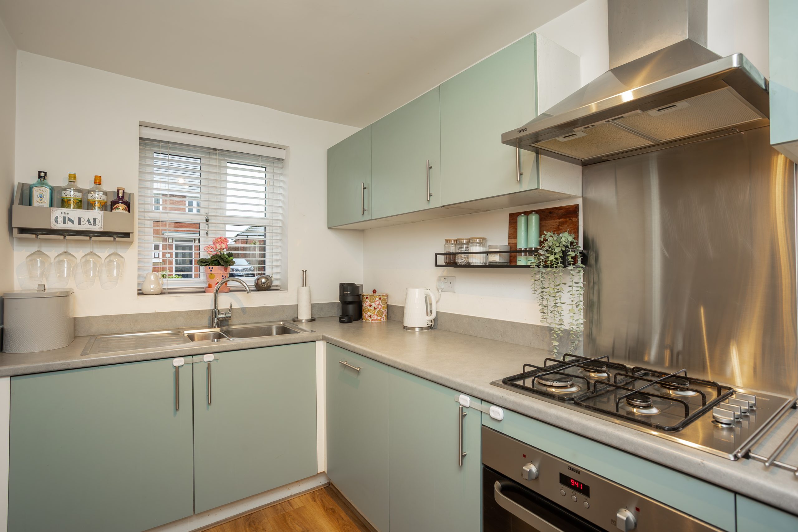 The kitchen is fitted with contemporary sage green base and wall units paired with grey worktops. Appliances include an integrated oven, hob, extractor fan, dishwasher, washer/dryer and fridge freezer. The space is finished with laminate flooring and a window to the front elevation.