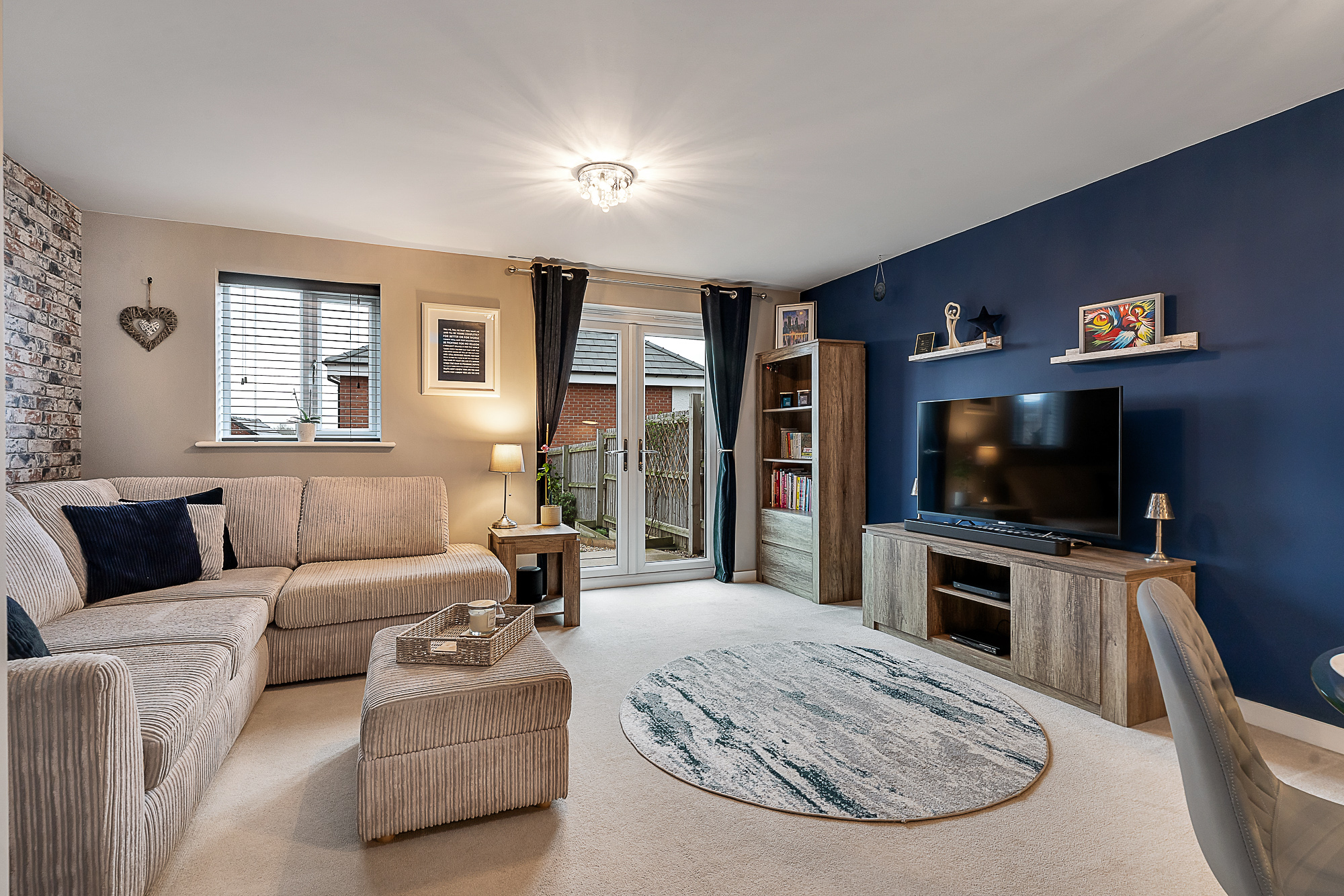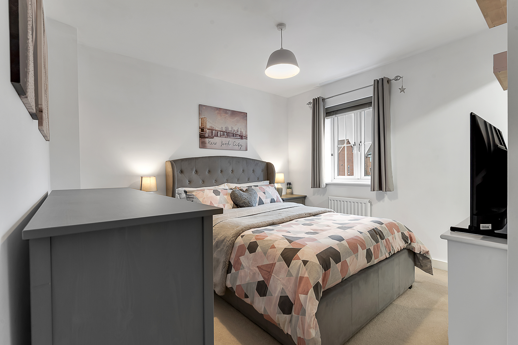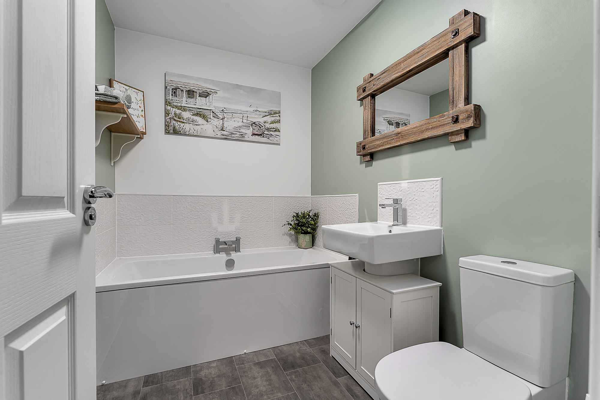 All three bedrooms are finished with light cream carpeting and are served by the family bathroom, which includes a bath, low-level WC and wash hand basin. The bathroom features white patterned tiling above the bath and sink and is completed with dark grey tiled-effect vinyl flooring.