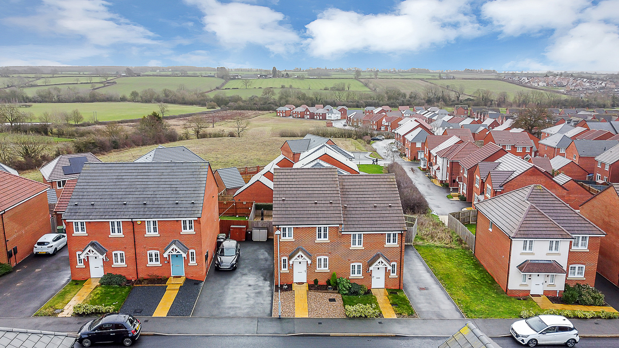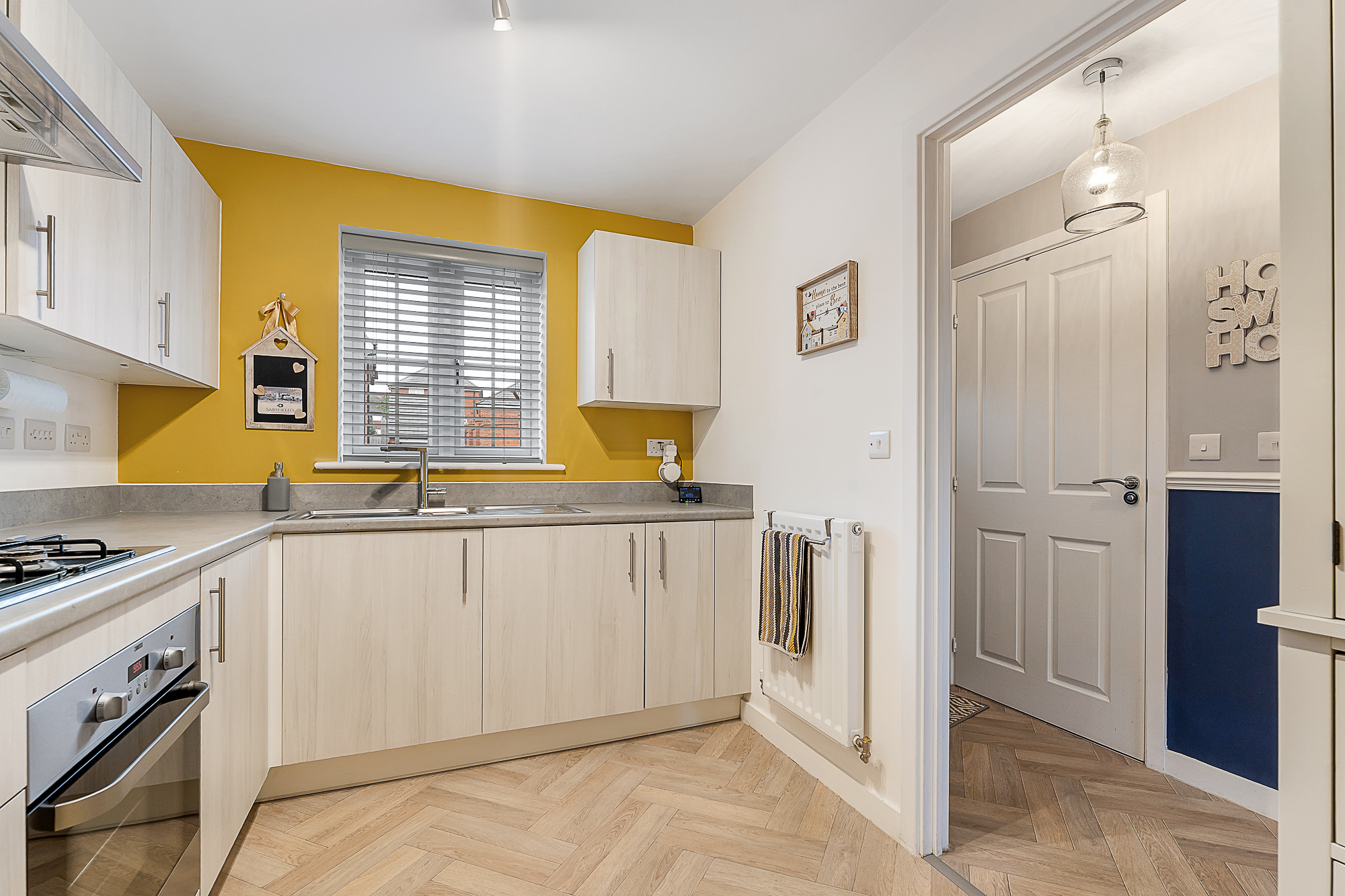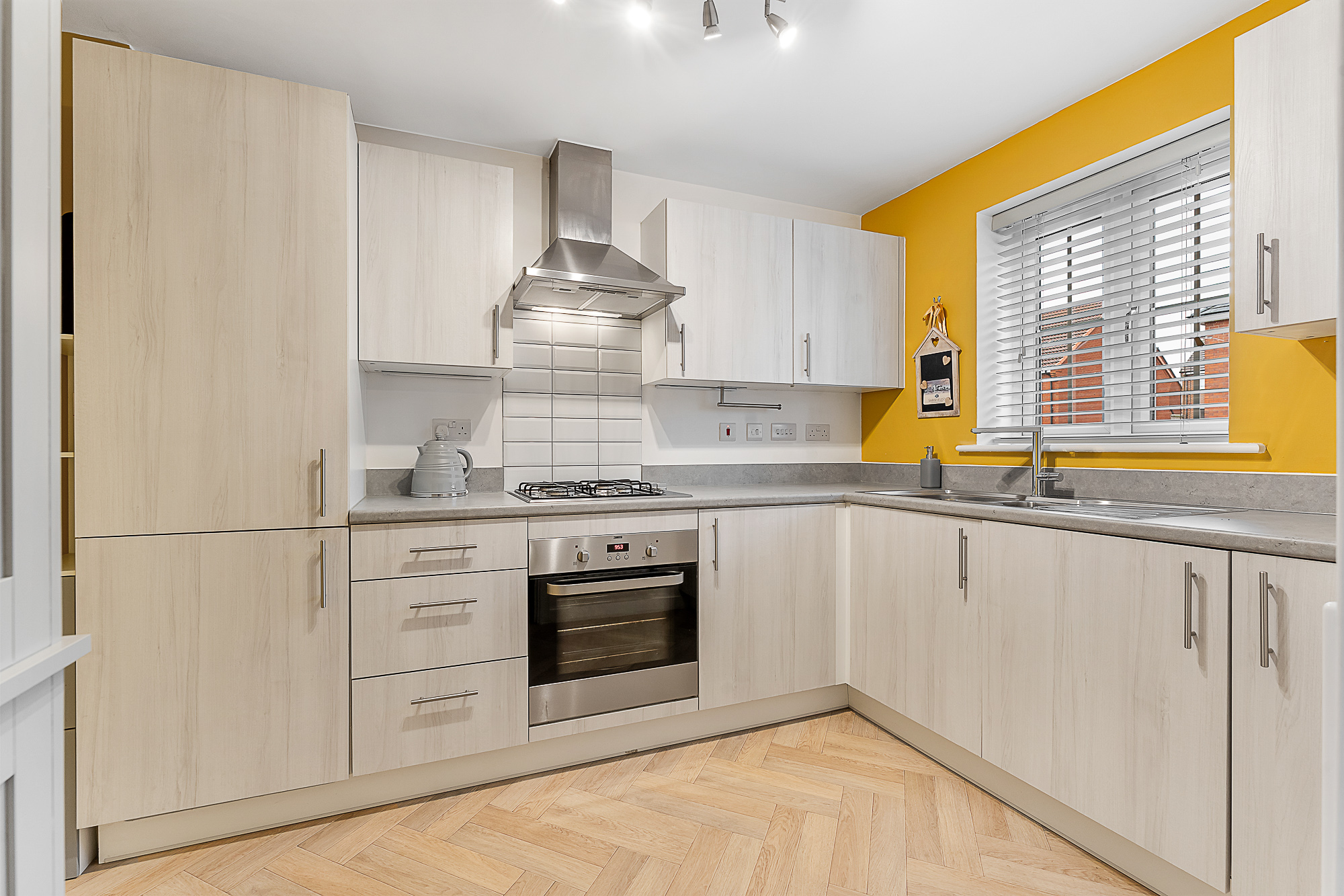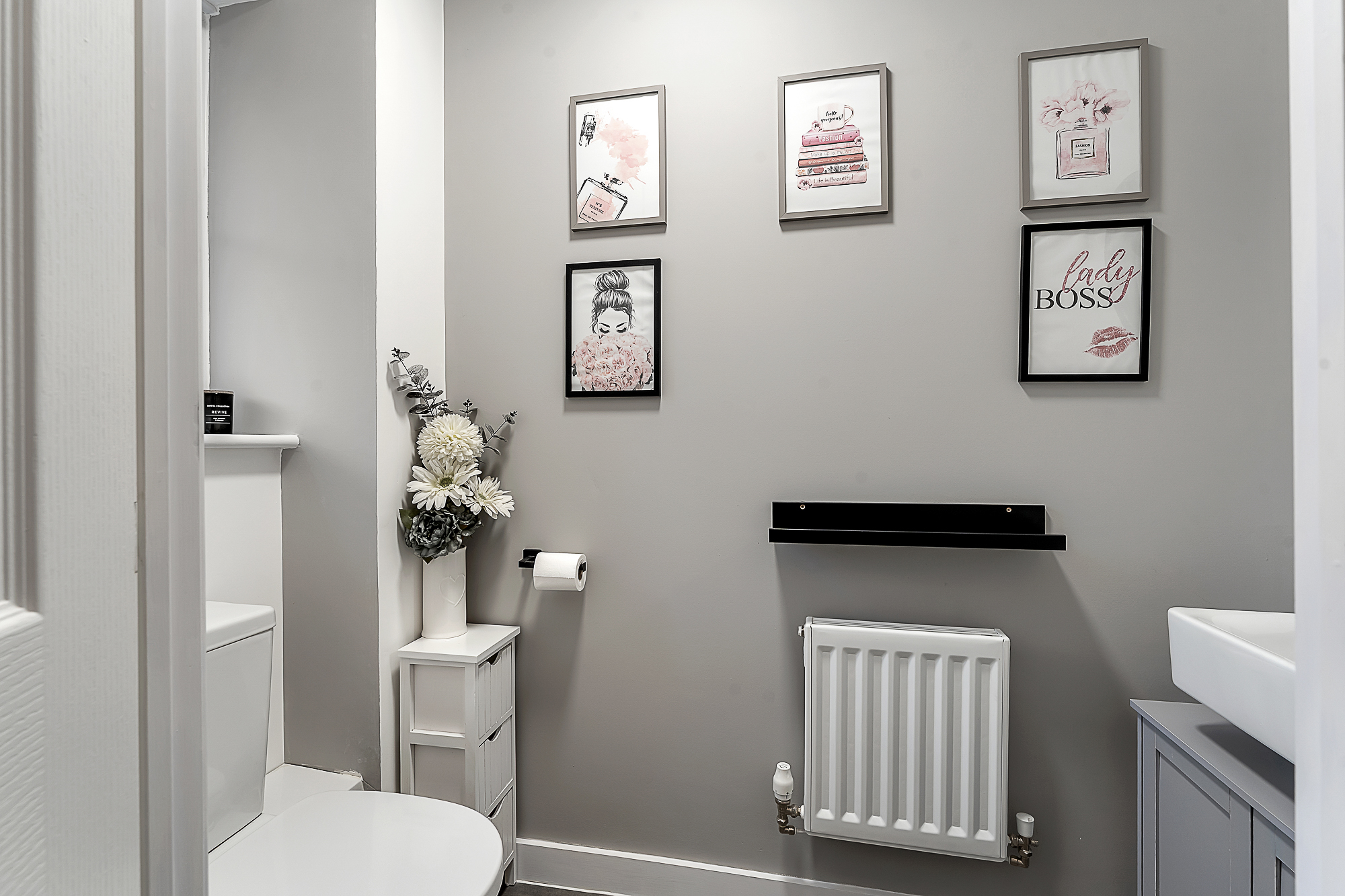 All three bedrooms are finished with light cream carpeting and are served by the family bathroom, which includes a bath, low-level WC and wash hand basin. The bathroom features white patterned tiling above the bath and sink and is completed with dark grey tiled-effect vinyl flooring.