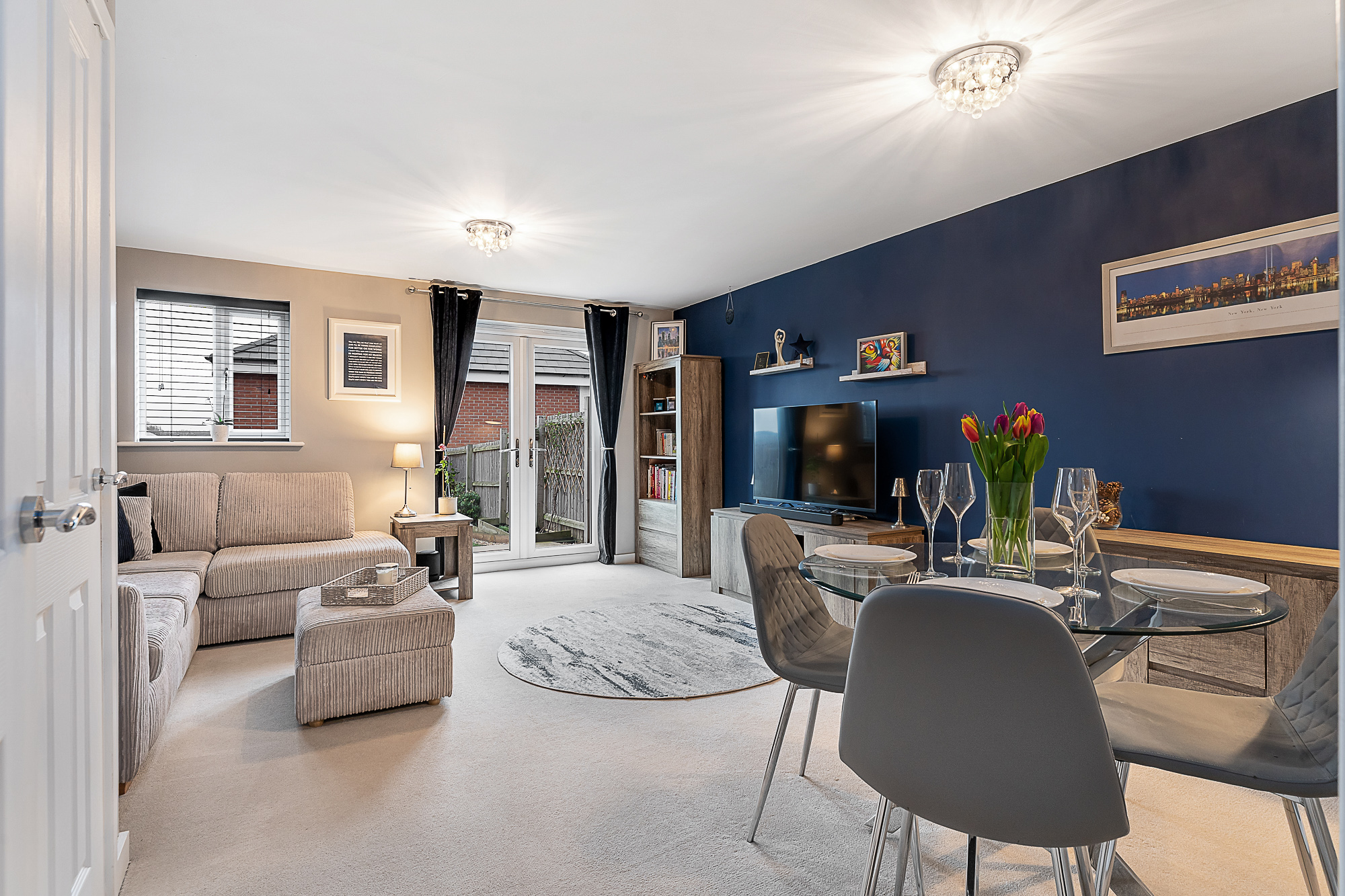 Positioned at the rear of the home, the generous lounge/diner benefits from light cream carpeting, double doors opening onto the garden and an additional window allowing plenty of natural light to flow through the room. An understairs cupboard provides useful storage.