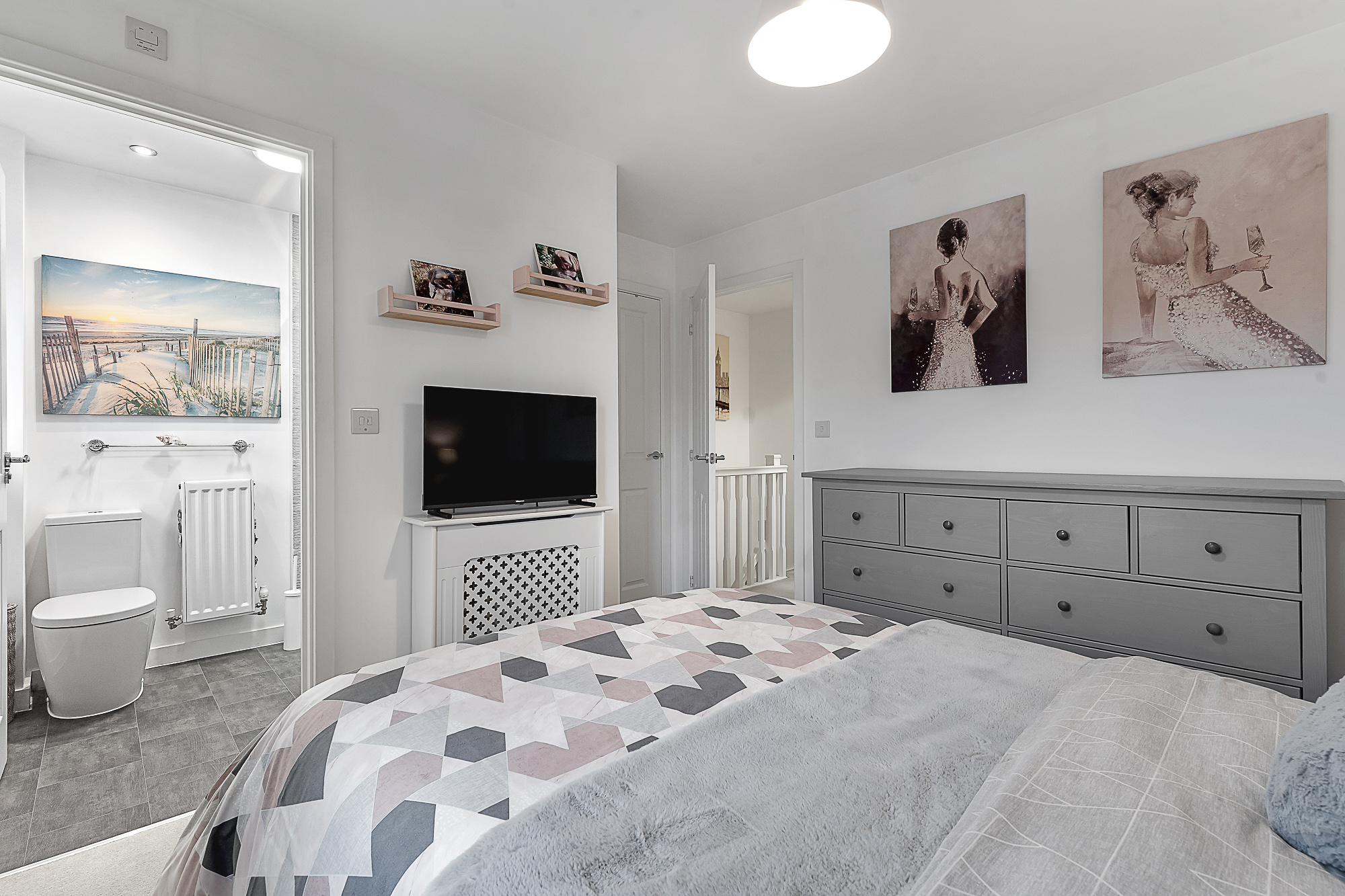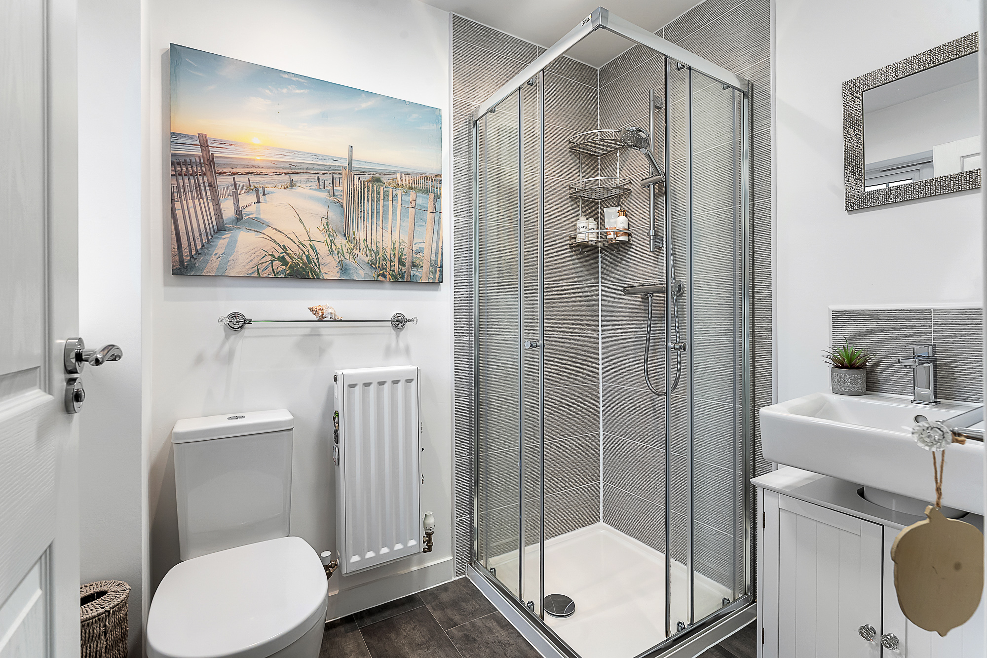 Bedroom One is positioned at the front of the property and benefits from a built-in storage cupboard and a private ensuite shower room. The ensuite is fitted with a white three-piece suite comprising a walk-in shower cubicle, low-level WC and wash hand basin, with dark grey and white patterned tiling to the shower area and above the sink.