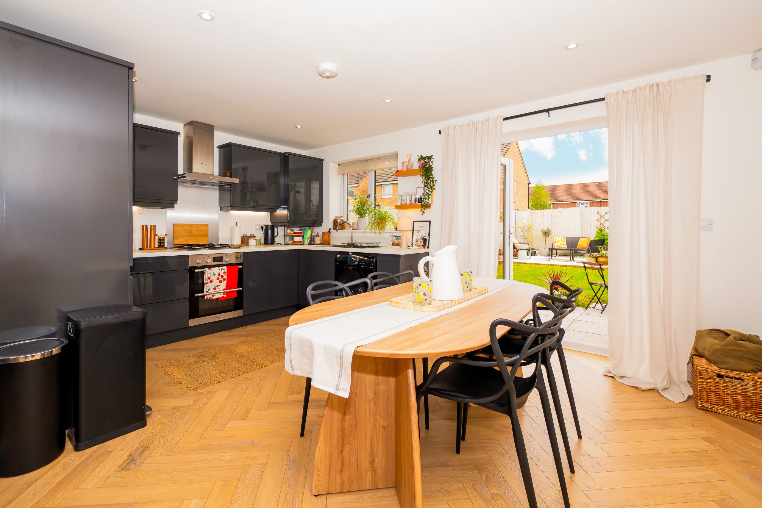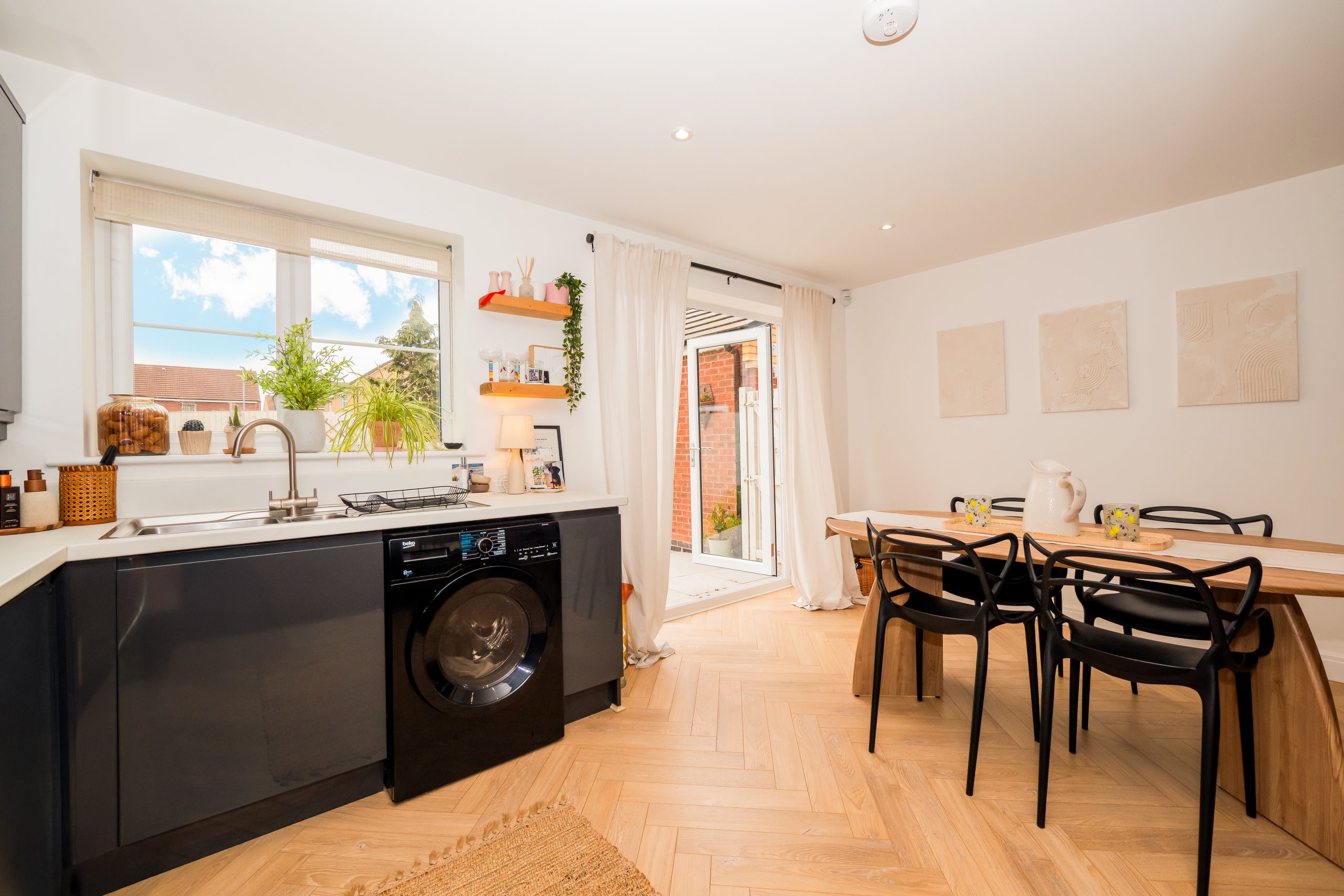 The ground floor welcomes you into a cosy entrance hallway, providing access to a convenient downstairs W.C. and the spacious open-plan living, dining, and kitchen area. The W.C. features a white low-level toilet and wash hand basin, complemented by a front-facing window for natural light. The open-plan living and dining area boasts a bright and airy ambiance, enhanced by neutral décor and elegant wooden flooring. A useful under-stairs storage cupboard adds practicality, while the staircase ascends to the first floor. The beautifully designed kitchen and dining area offers a modern aesthetic with sleek grey gloss cabinetry, a complementary worktop, and a range of base and wall units. Patio doors provide a seamless connection to the rear garden, bringing in ample natural light. The kitchen is equipped with an integrated oven, fridge freezer, and extractor fan, with space available for additional appliances.