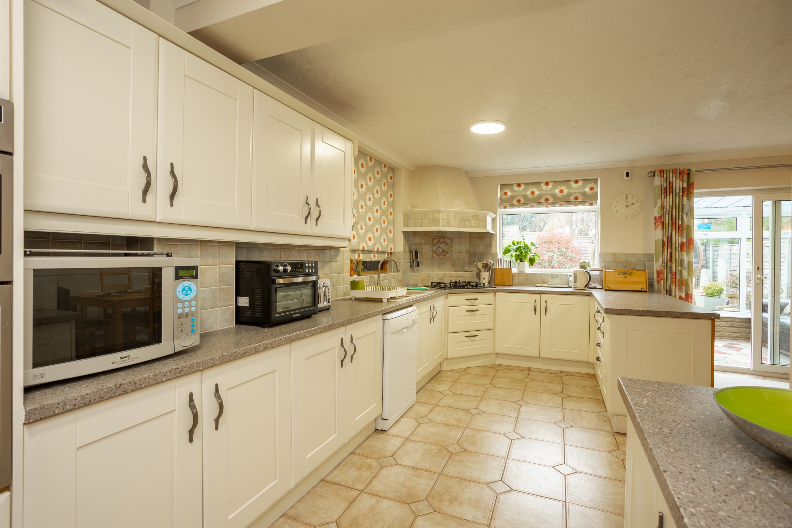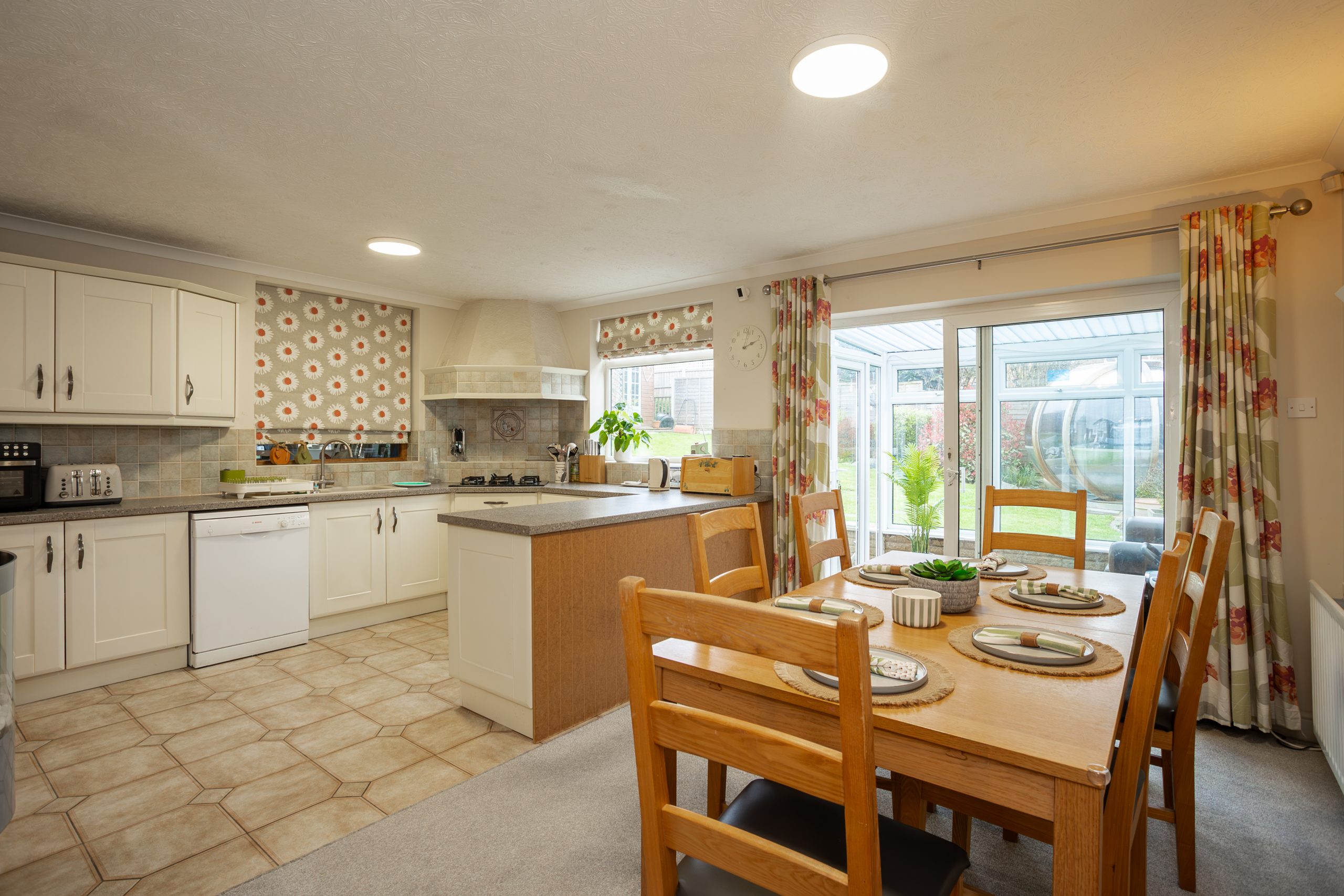 Substantial, extended five bedroomed family home with pleasant views over green space. Large well-appointed dining kitchen, Living room and conservatory. Five bedrooms, the primary with an ensuite shower room and family bathroom. Situated on a corner plot position with ample off-road parking. Generous garaging with the potential for games room/family room.