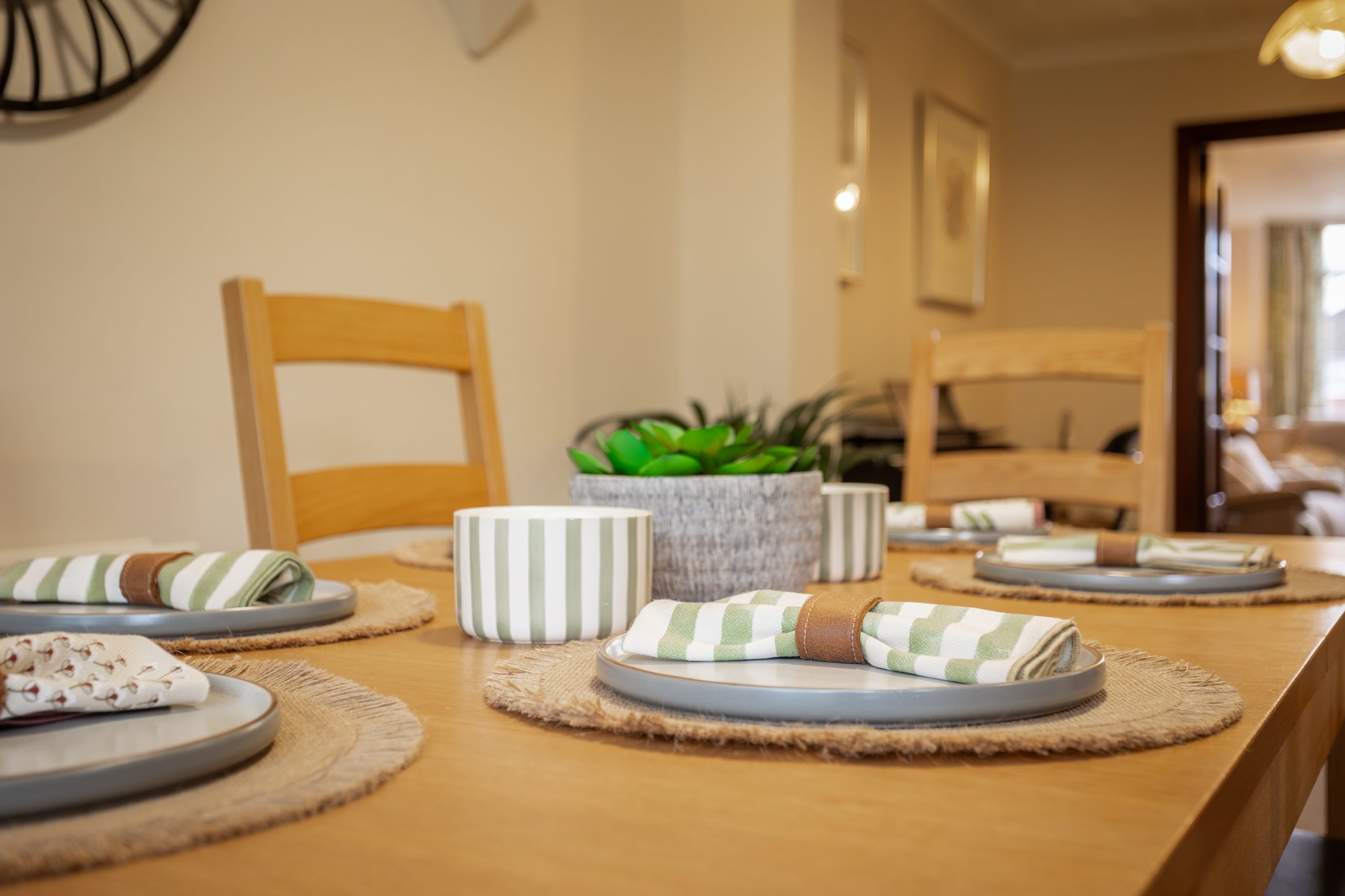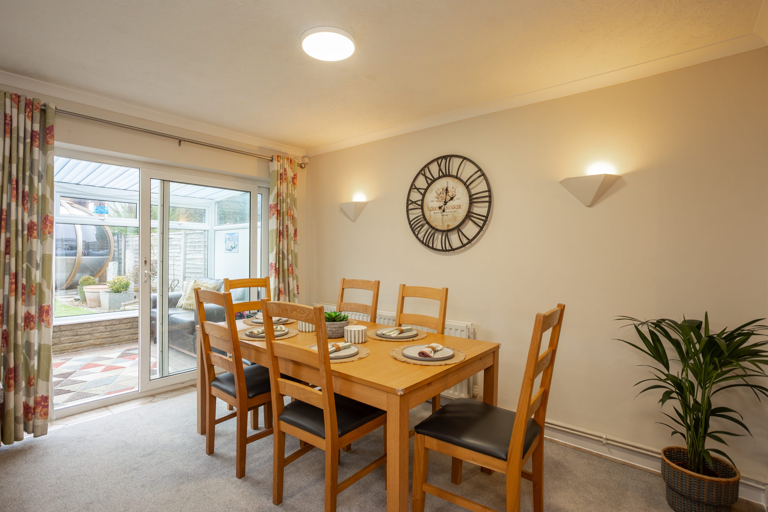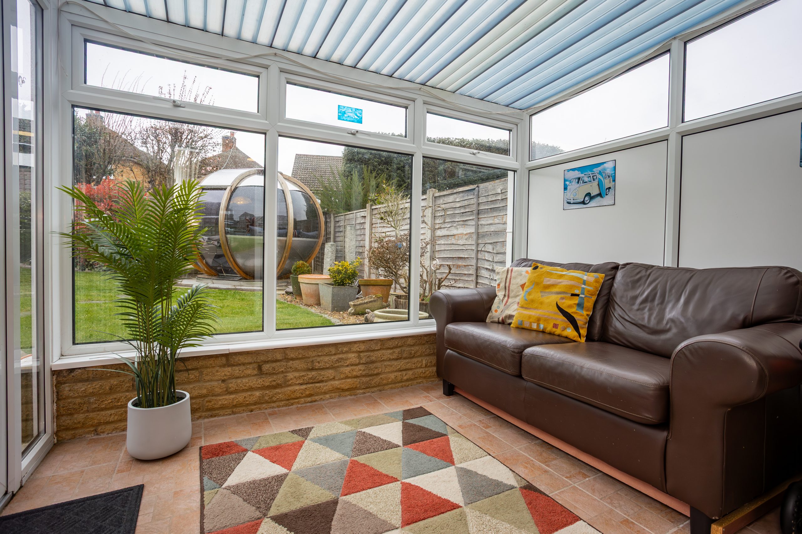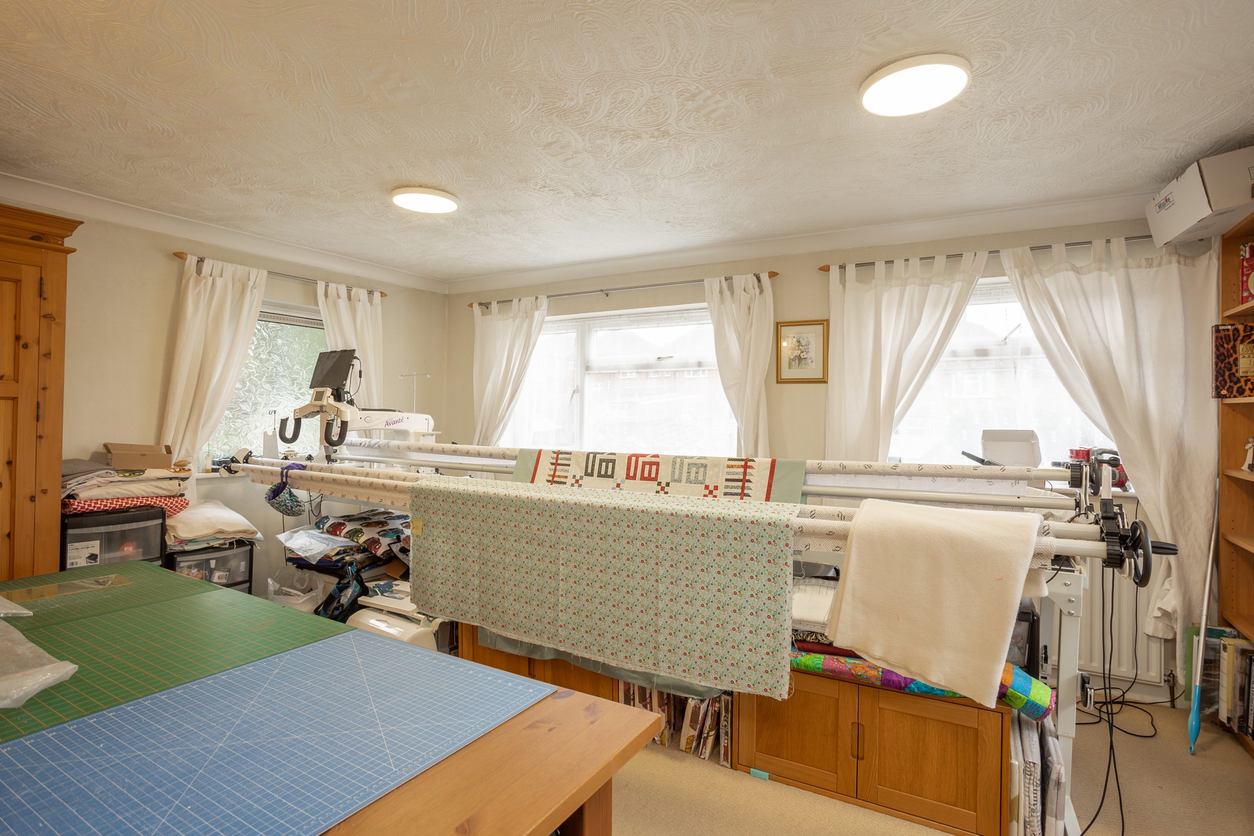 Located at the rear, the large dining kitchen is elegantly designed, featuring cream cabinetry and complementary worktops. Integrated appliances include a double oven, hob, extractor fan, and space for a fridge freezer and dishwasher. A window provides views of the rear garden. The kitchen offers a generous dining space and a cosy seating area, ideal as a snug. The conservatory, filled with natural light, has tiled flooring and doors opening onto the garden, making it perfect for entertaining or relaxing while enjoying outdoor views.