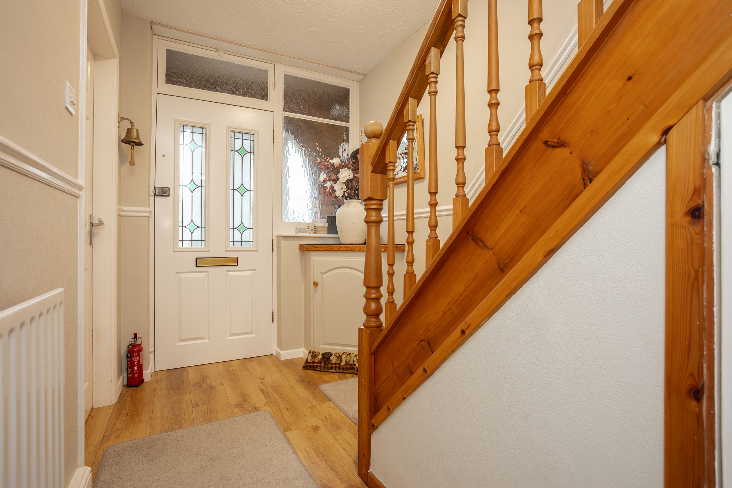Enter the property through a spacious, light-filled hallway and porch. From here, a staircase leads to the first floor, with doors opening to the ground floor living areas.