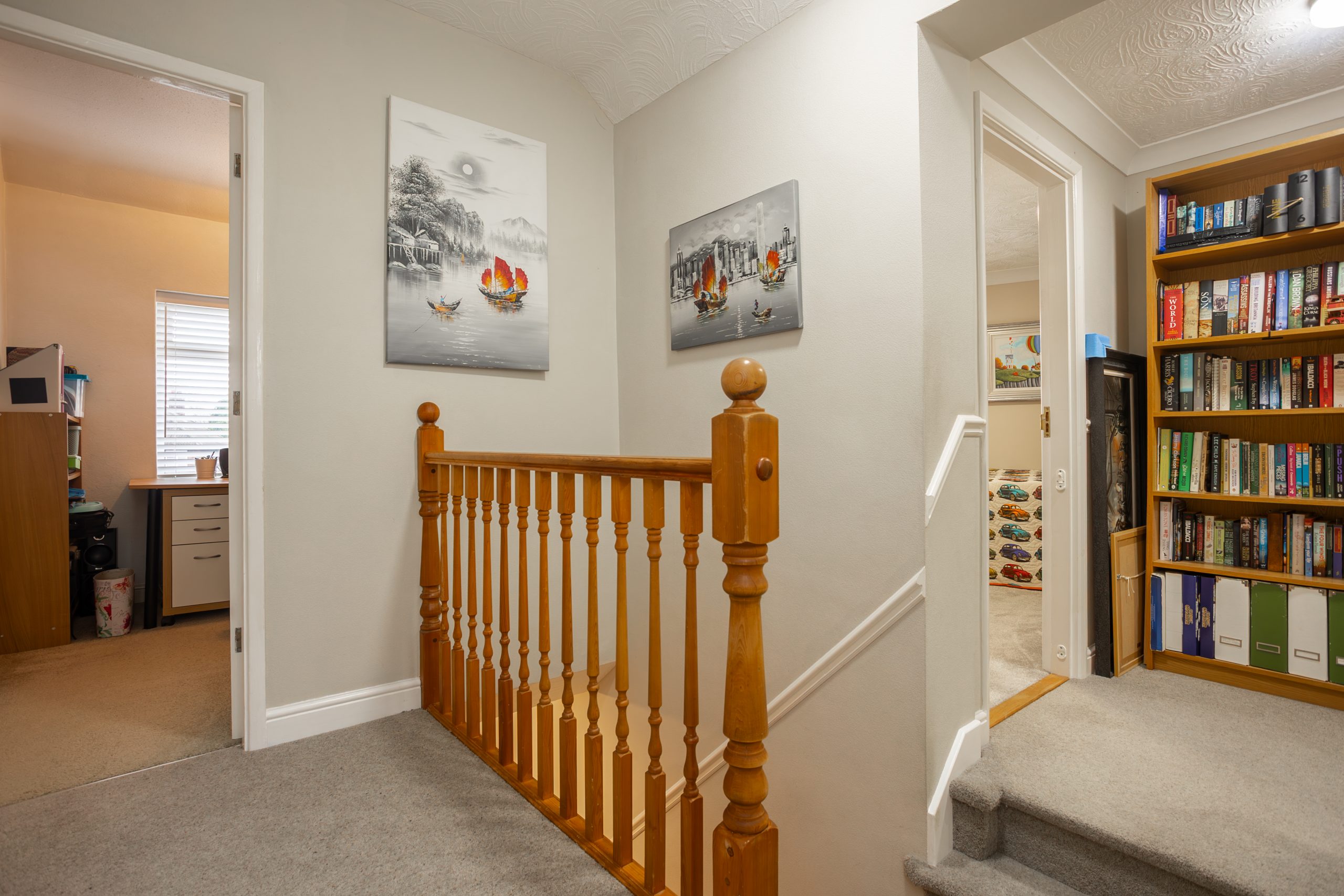 The first-floor landing offers access to spacious bedrooms and a family shower room, forming a functional and balanced layout. The primary bedroom, situated at the rear, benefits from garden views, creating a bright, relaxing environment. It features an ensuite with a large walk-in shower, basin, WC, and heated towel rail. Bedroom two, located at the front, includes built-in wardrobes, while bedroom three, another double, is positioned at the rear. Two additional bedrooms complete the upper level. The floor is finished with a stylish, well-equipped family shower room, enhancing the home's comfort and practicality. This layout maximizes space and natural light, providing a comfortable living environment.