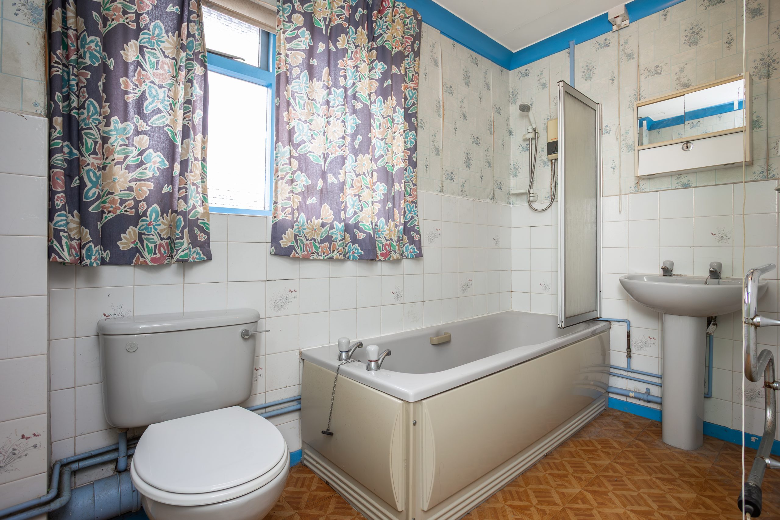 The bathroom, ready for a touch of modernisation, offers a three piece suite comprising a WC, wash hand basin, and a bath with overhead shower and screen. Tiled splashbacks, coving, and an obscured front facing window complete the space.